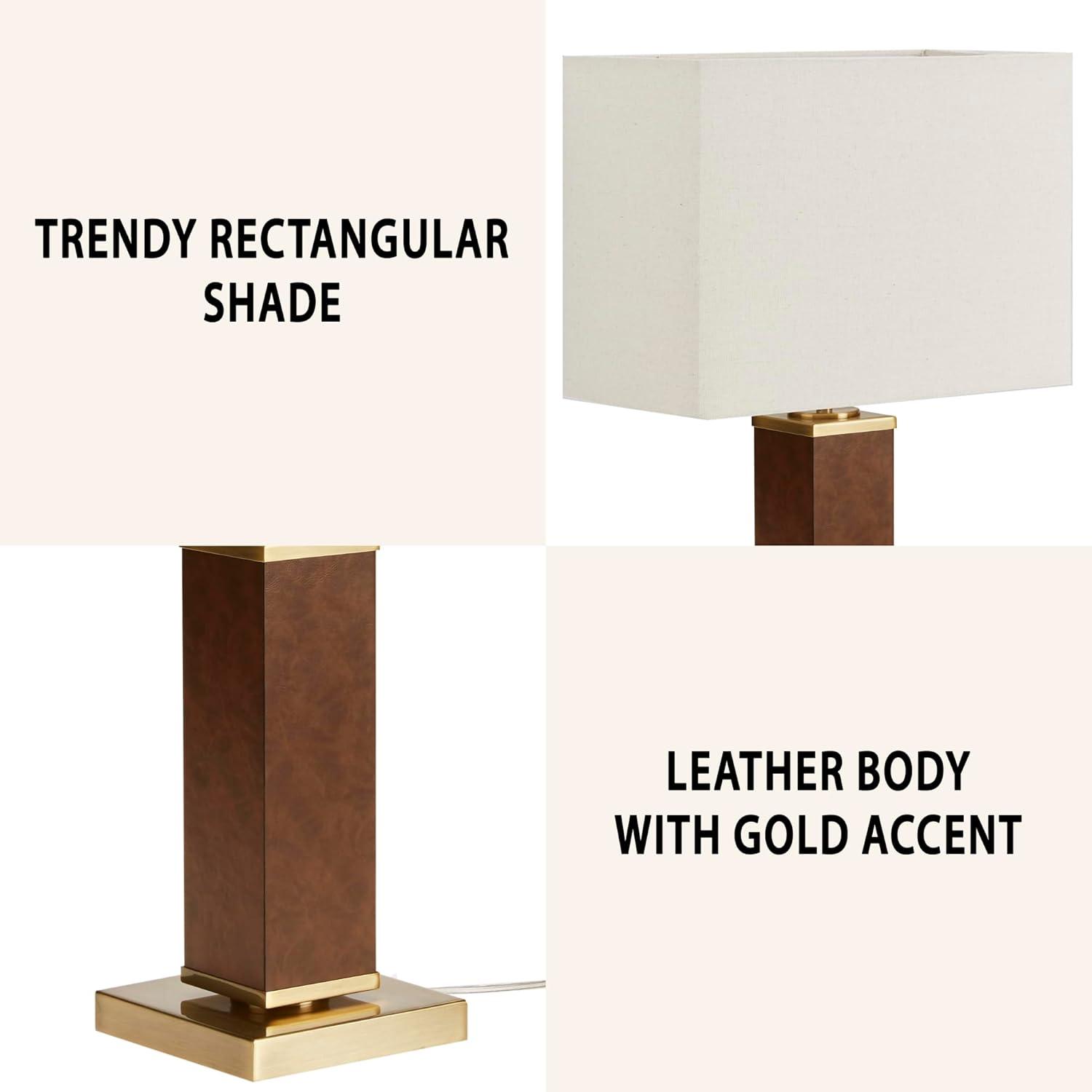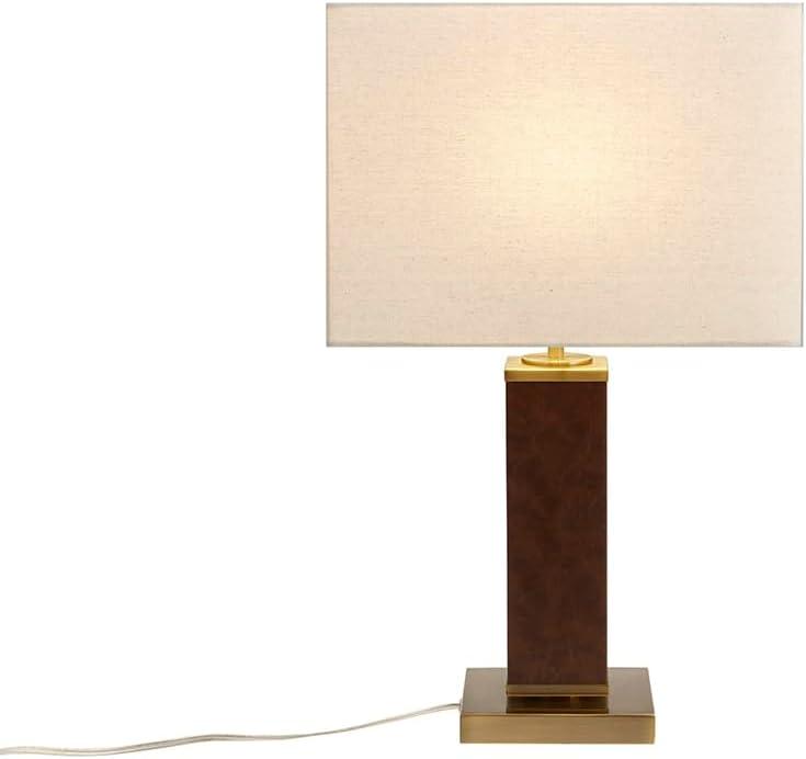 Introducing the modern and sophisticated Hawley table lamp, featuring brown faux leather for an elegant aesthetic, paired with a gold metal base for a luxurious touch. Its off-white rectangle shade offers a subtle contrast, completing the design