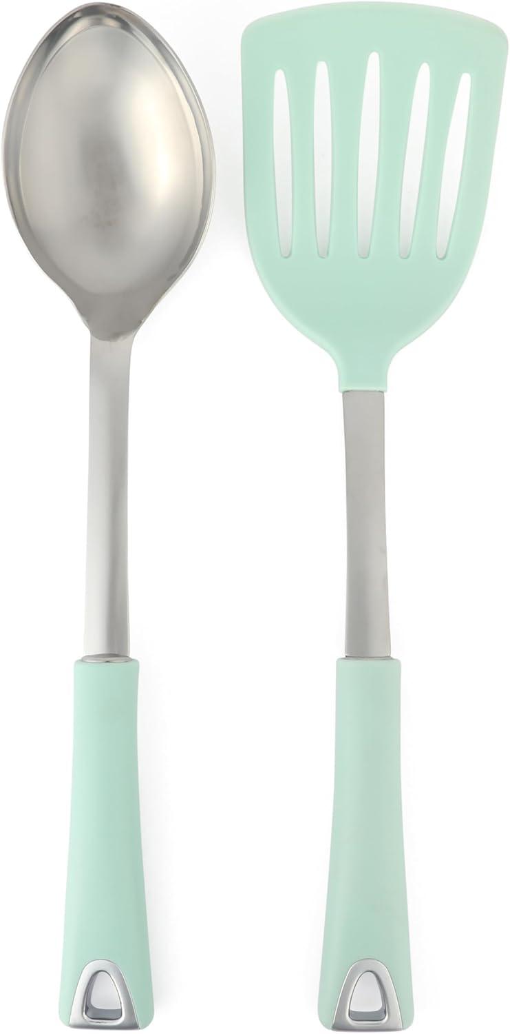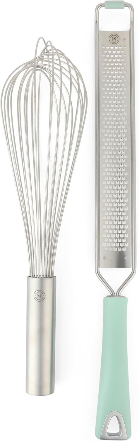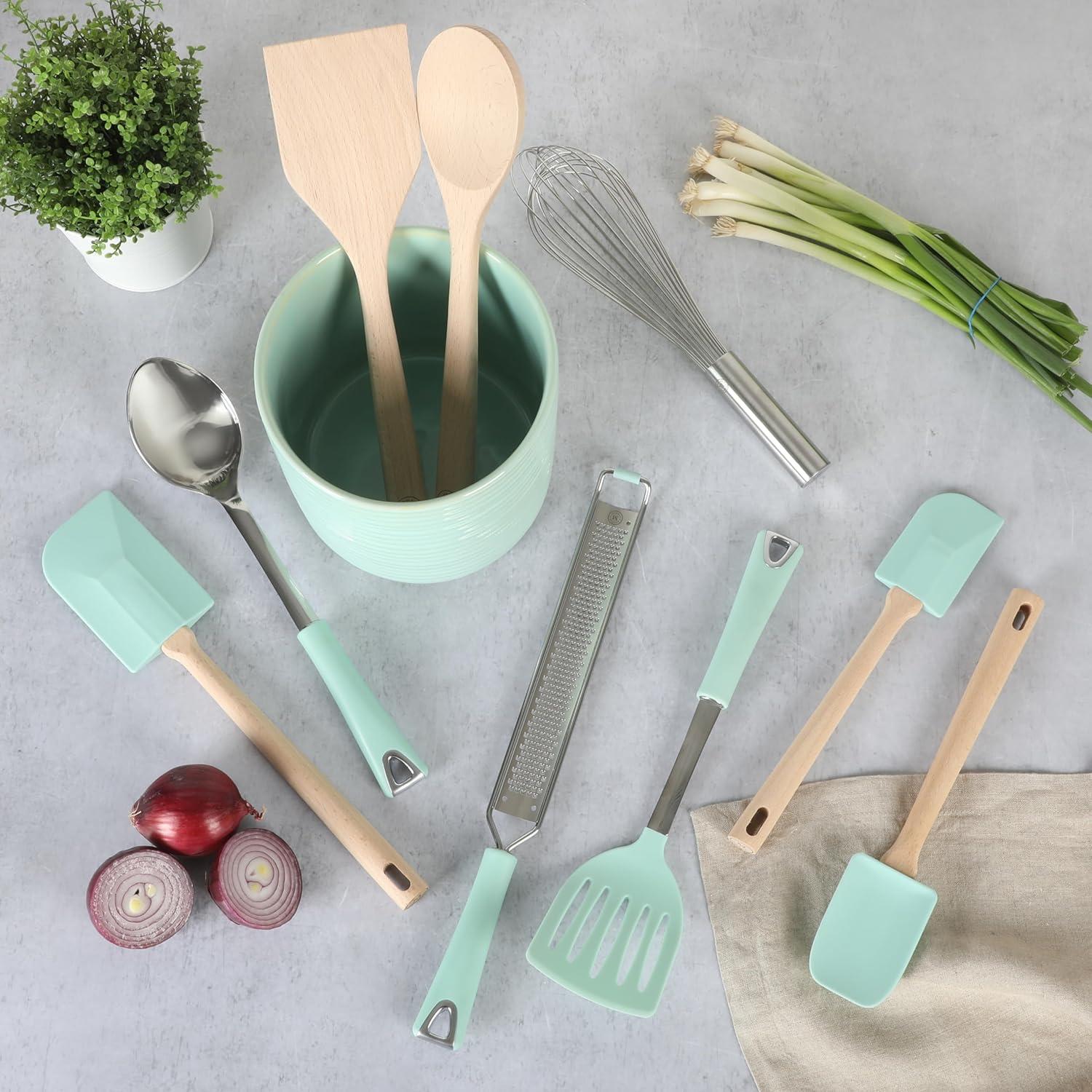 An organized kitchen is an inviting space to start making special meals bound to be the talk of the table. The 10-piece Prep and Serve Tool Set with Ceramic Holder from Martha Stewart is a complete set of cooking utensils for stirring, scooping, and serving food every day, Tools with wood, nylon and silicone heads are suitable to use on nonstick cookware without scratching or scraping the delicate interior coating of your go-to frypans and Dutch ovens. Each cooking tool is designed for a specific function to perform any task – whether for whisking, grating cheese or flipping pancakes and serving portions of stews. Sturdy handles offer an ergonomic grip for mixing and serving with confidence. Store and display all the tools in the elegant ceramic crock for easy access and clutter-free storage. Hand wash only.