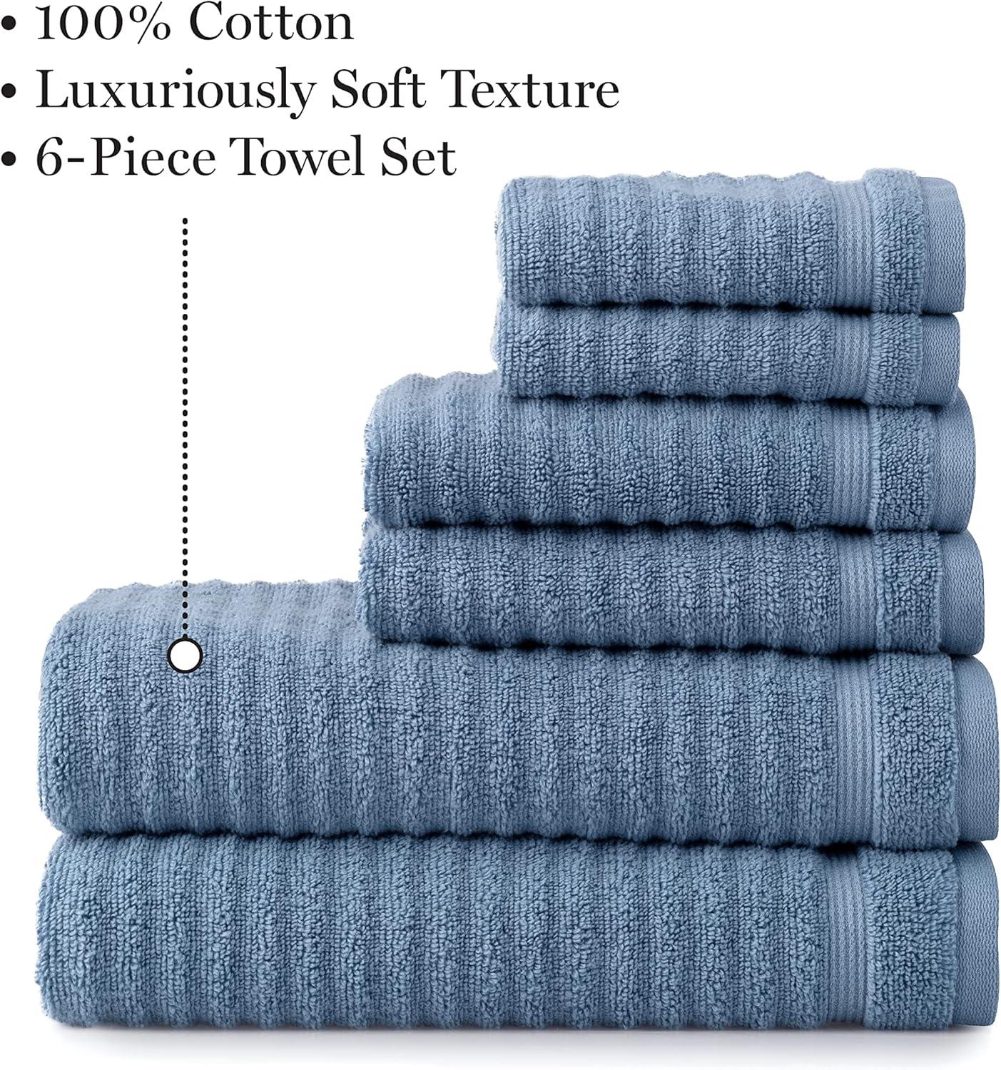 STUNNING DESIGN elevates the home with a bumpy textured take on a classic 6-piece towel set. Choose from a selection of beautifully solid dyed colors: white, light gray, or mid-tone blue. This timeless design is crafted in a plush terry stripe, accented with a stylish pintuck dobby detail at the hem. Each set is thoughtfully bundled with a ribbon, making it perfect for gifts and baskets.