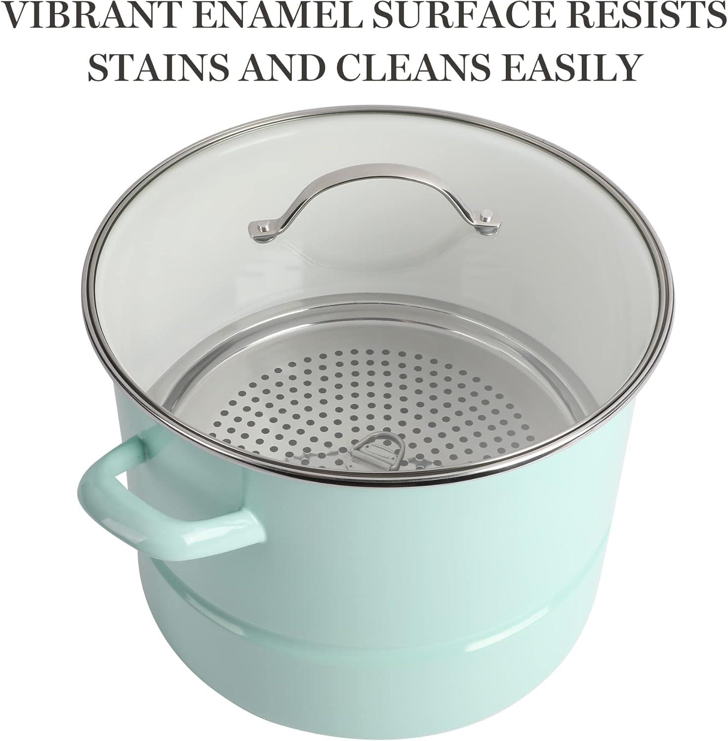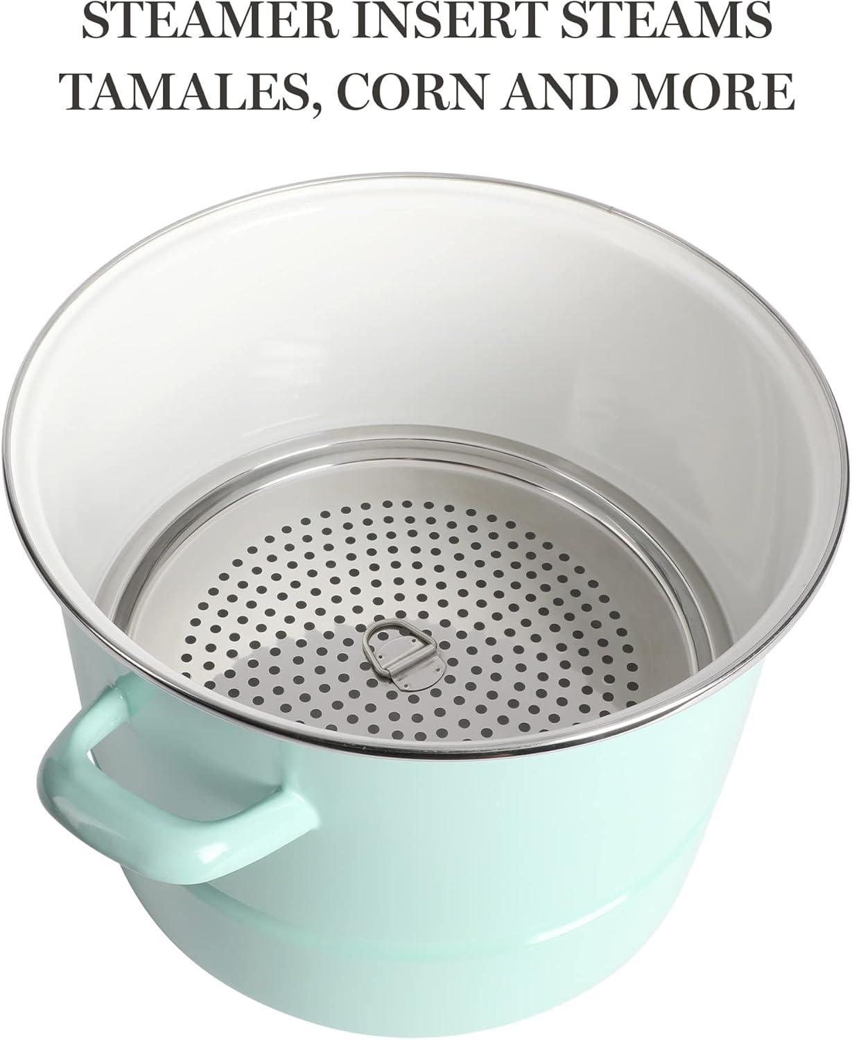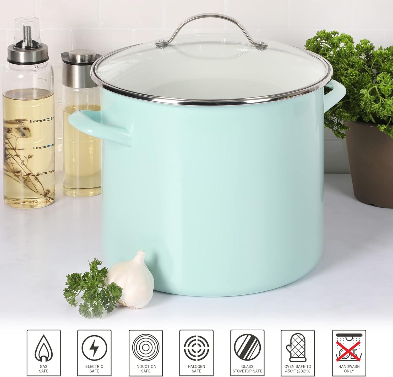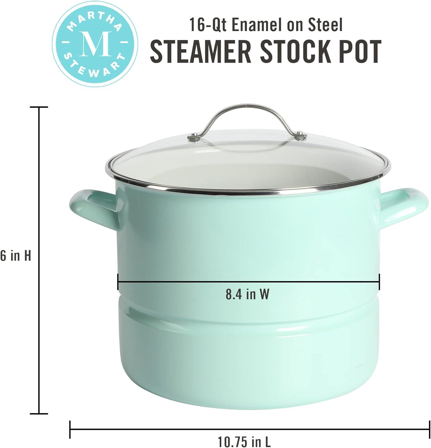 This Thayer 16-quart Enamel on Steel Lobster Stock Pot with Lid from Martha Stewart is a sturdy piece of cookware that prepares and delivers good and generous amounts of soups, stocks, stews, and more. Crafted from durable steel, it promotes uniform heat distribution throughout its beautifully-enameled, stain-resistant vessel. The enamel finish makes cleanup a breeze to help you spend less time in the kitchen and bring your focus back to entertaining and mingling with your guests. With a 16-quart capacity and a spacious interior, this durable steel pot provides enough room for family-sized dishes, a fresh catch of lobster and all kinds of seafood. Cast side handles offer balance and support when lifting and transferring a heavy pot of shrimp boil, pasta, or chicken soup. The vented, tempered glass lid provides visibility to monitor cooking progress. Oven safe up to 450°F. Hand wash only.