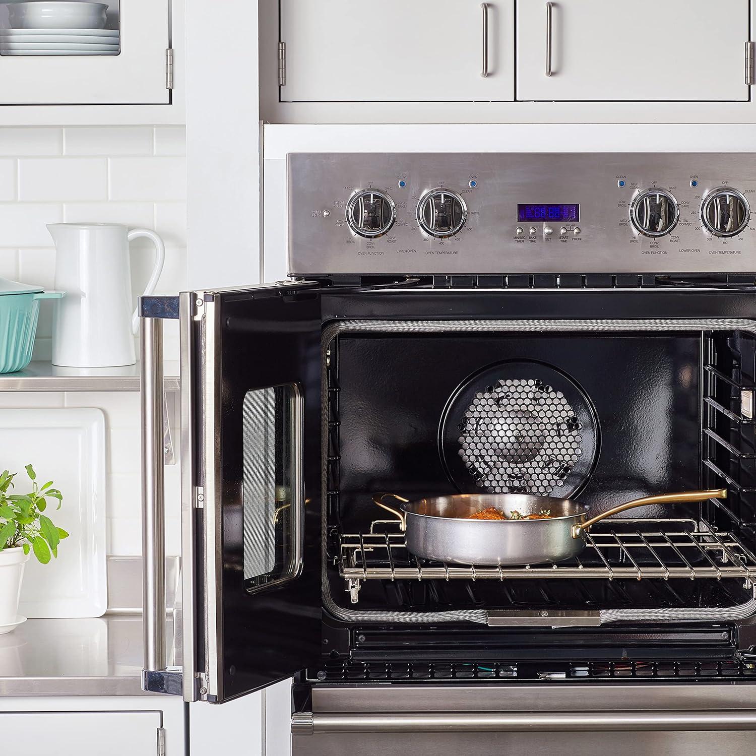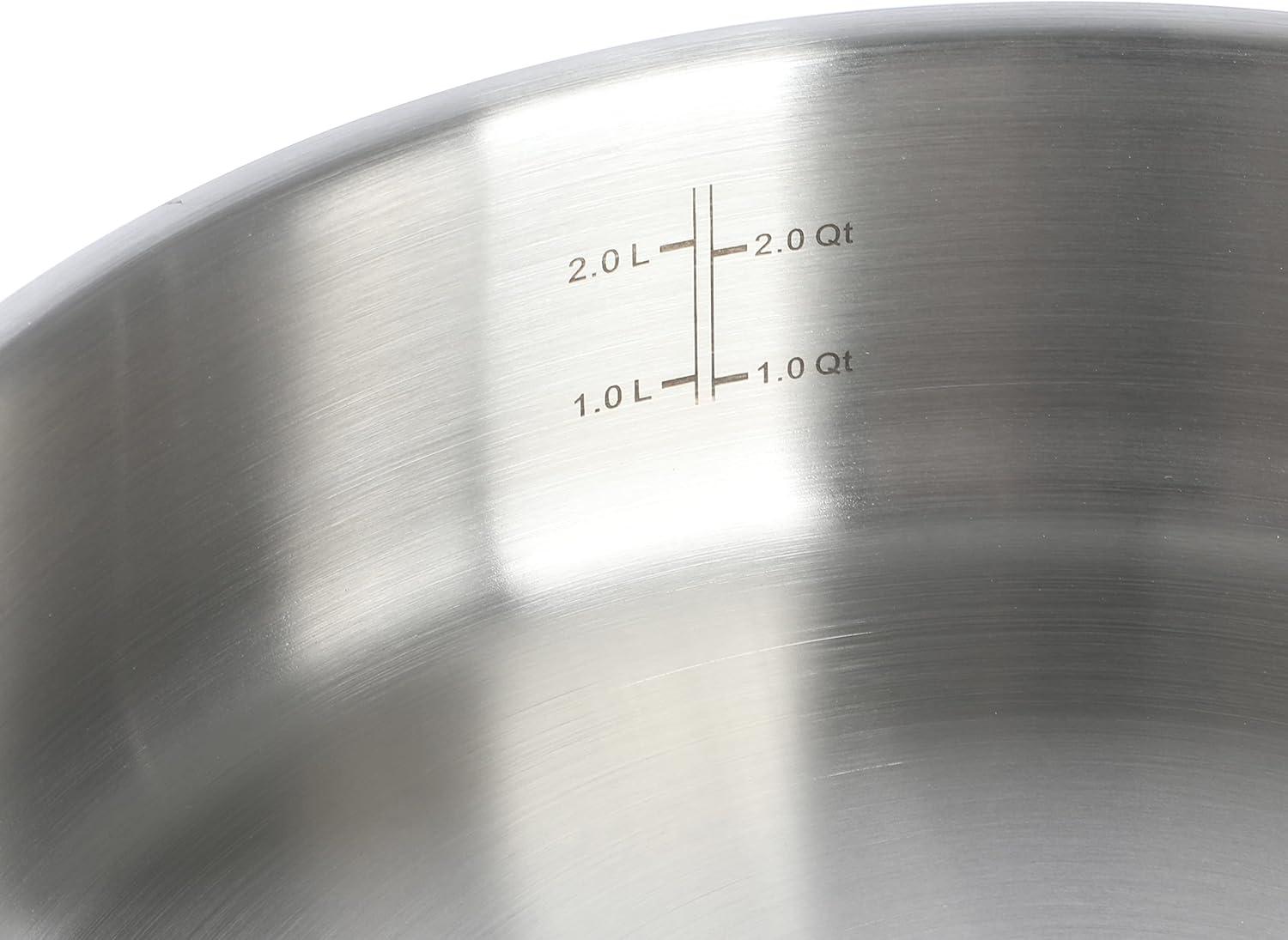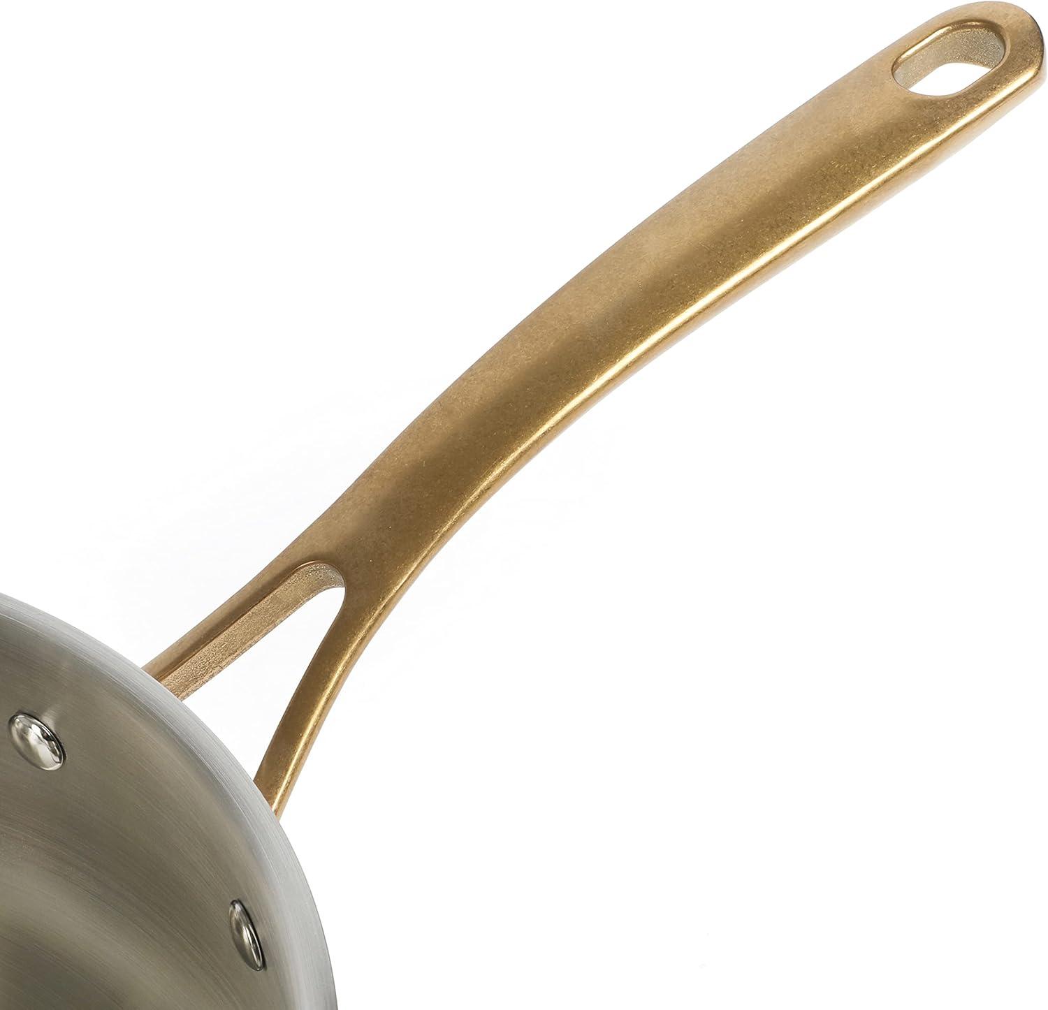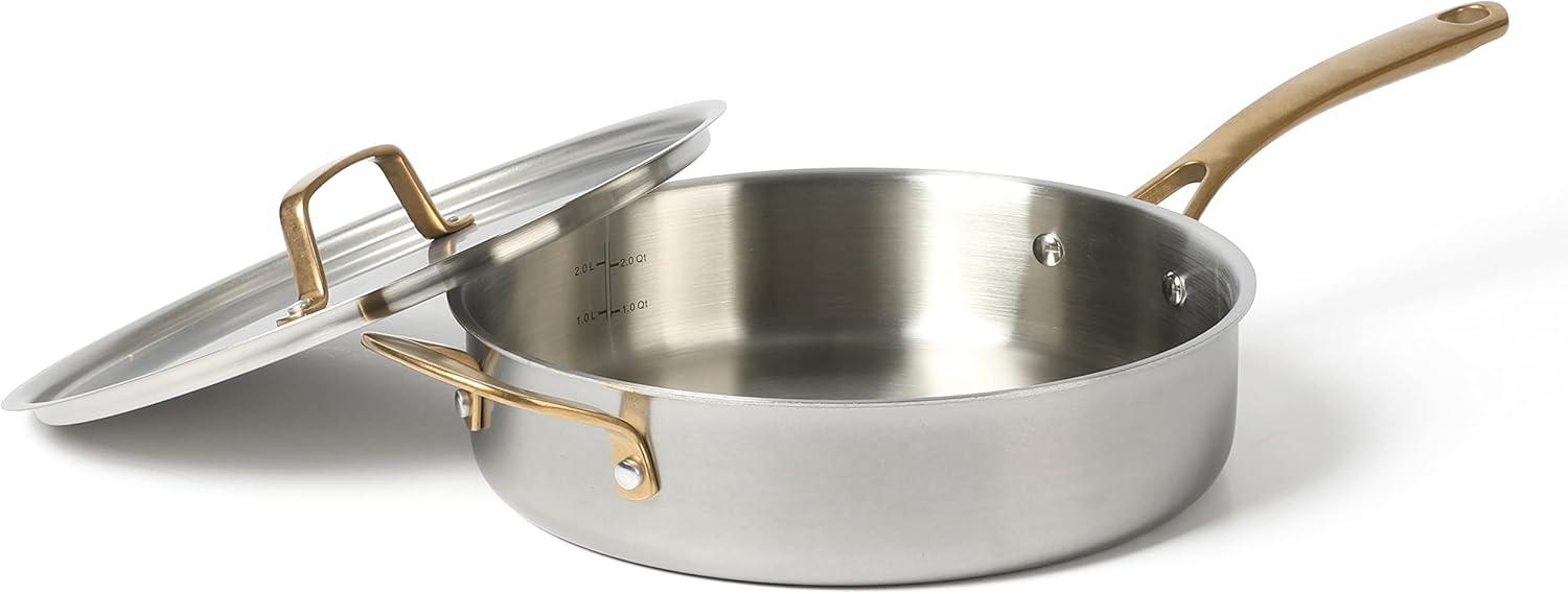 The Martha Stewart 3.5-quart Stainless Steel Everyday Sauté Pan with Lid allows you to cook both new and traditional recipes in style. Crafted from tri-ply stainless steel, this sauté pan features an aluminum core to heat and cook evenly for flavorful, no-hotspot results. Vintage-inspired brass accents add a well-traveled charm to any table or kitchen. It has a satin interior that does not react with food, especially tomato-based sauces, whipping up delicious meals with ease and convenience.