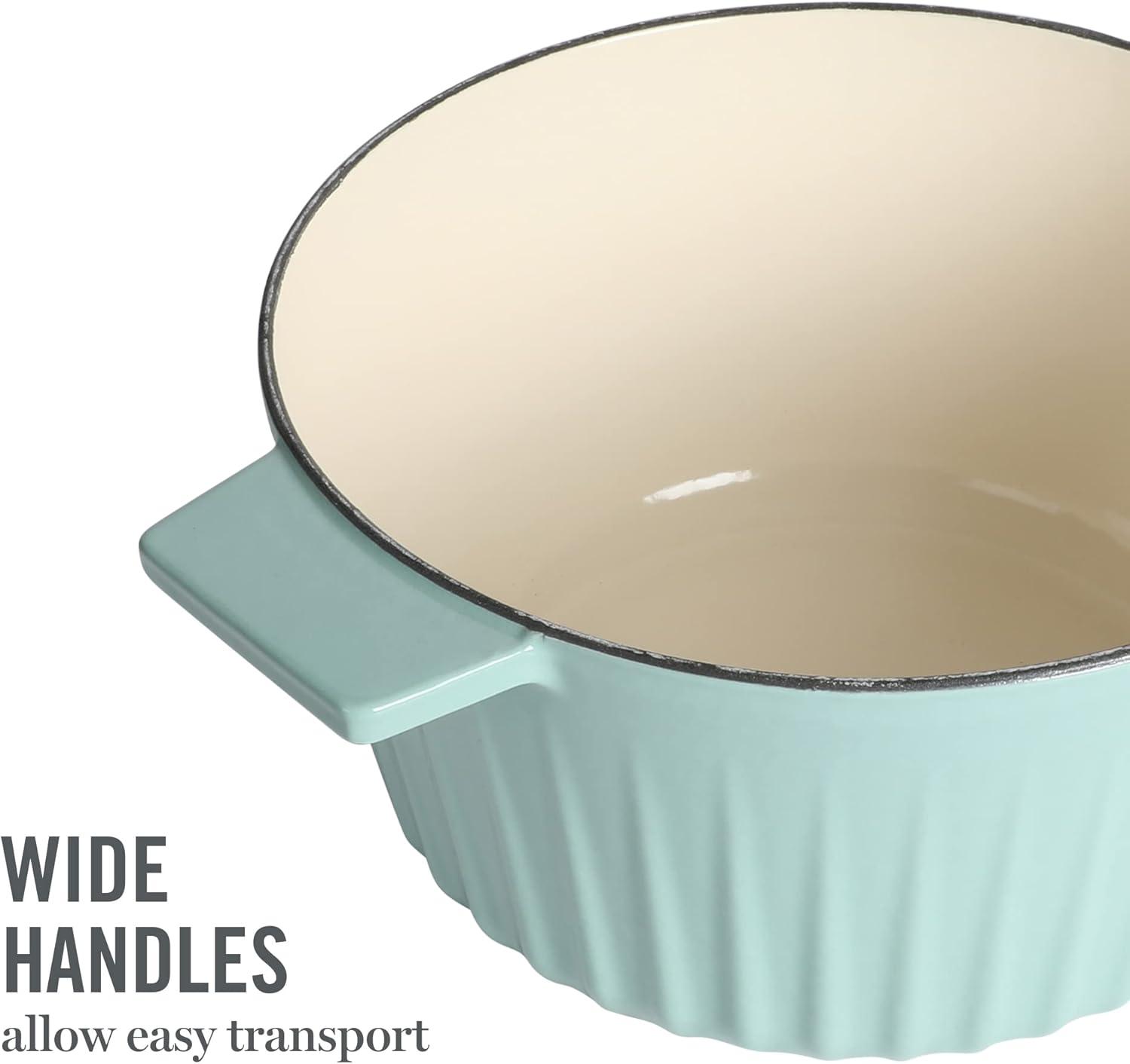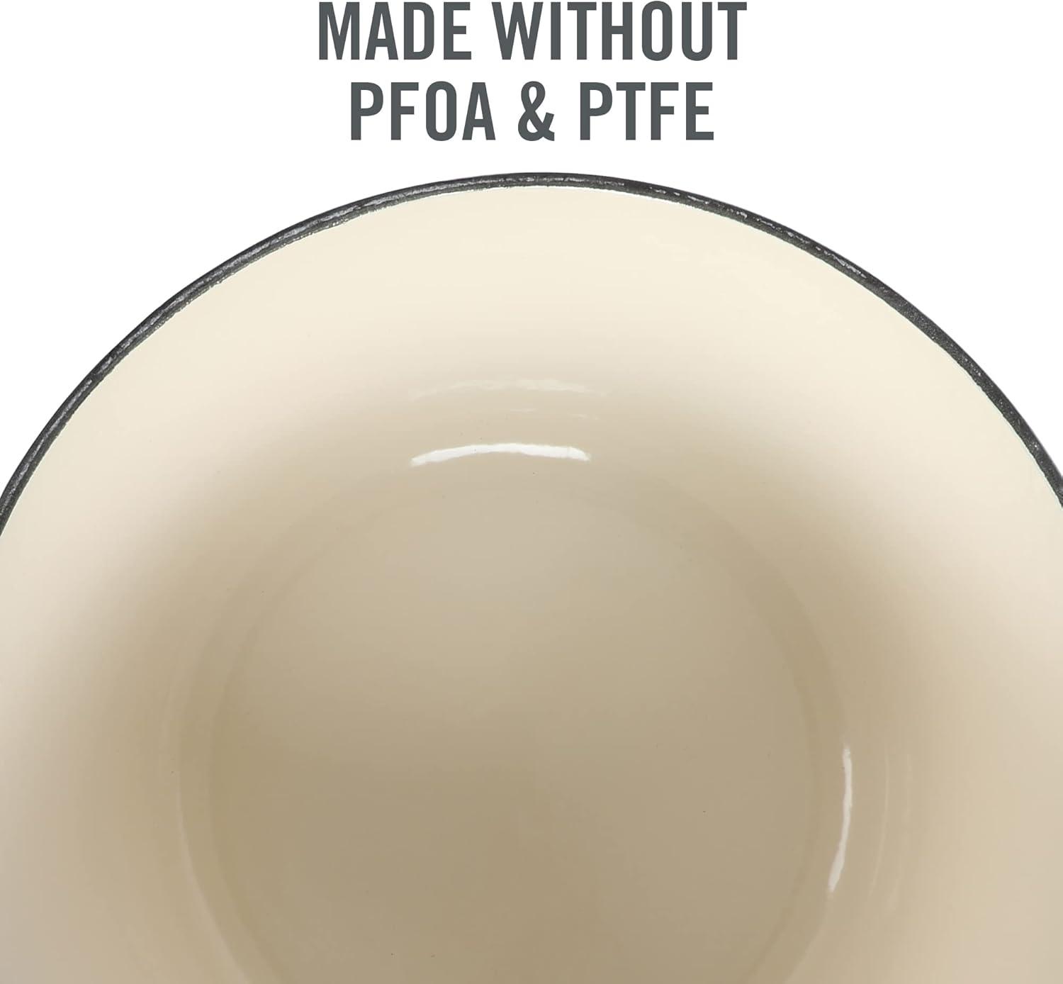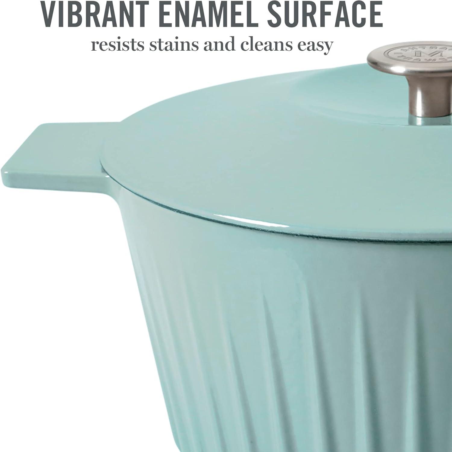 The Martha Stewart 3.5-quart Gatwick Enameled Cast Iron Braiser with Lid provides versatility and durability while making all kinds of delicious recipes every day. Crafted from durable cast iron, this piece distributes and retains heat evenly to slow cook stews, braise meats, bake casseroles, and more. The vibrant enamel finish resists stains for elegant presentation and easy cleanup. Sturdy handles offer balance and support when serving from oven to table. The lid has raised grooves to redirect moisture back on the food for tender, flavorful results. Safe in the oven (up to 450°F) and on all cooking surfaces, including induction stoves, this Dutch oven offers style and performance to inspire any home cook to explore and do more in the kitchen. Hand wash only.