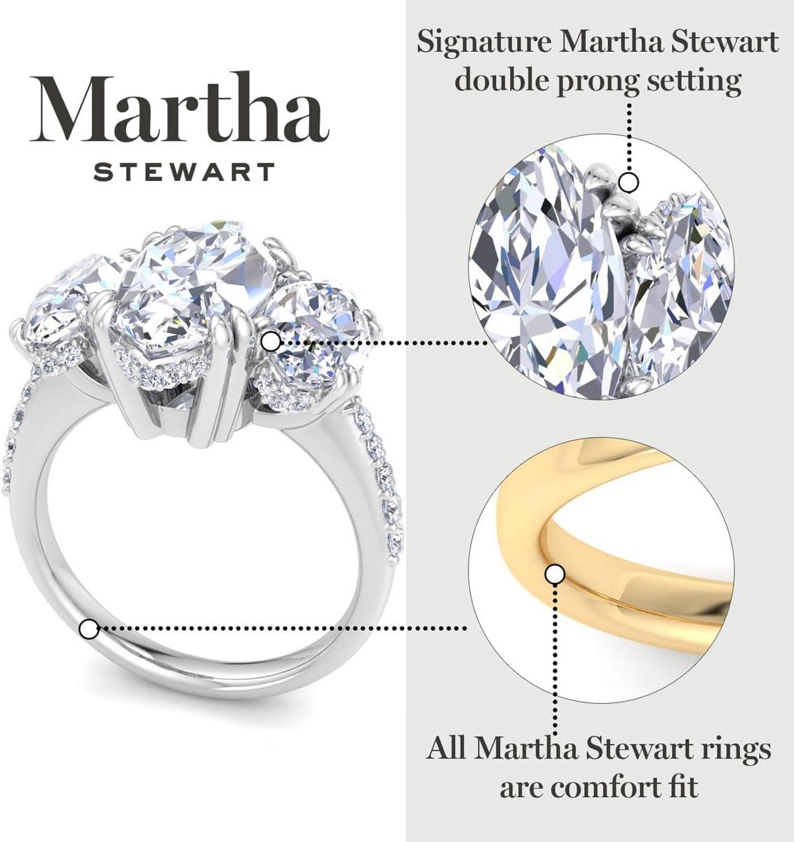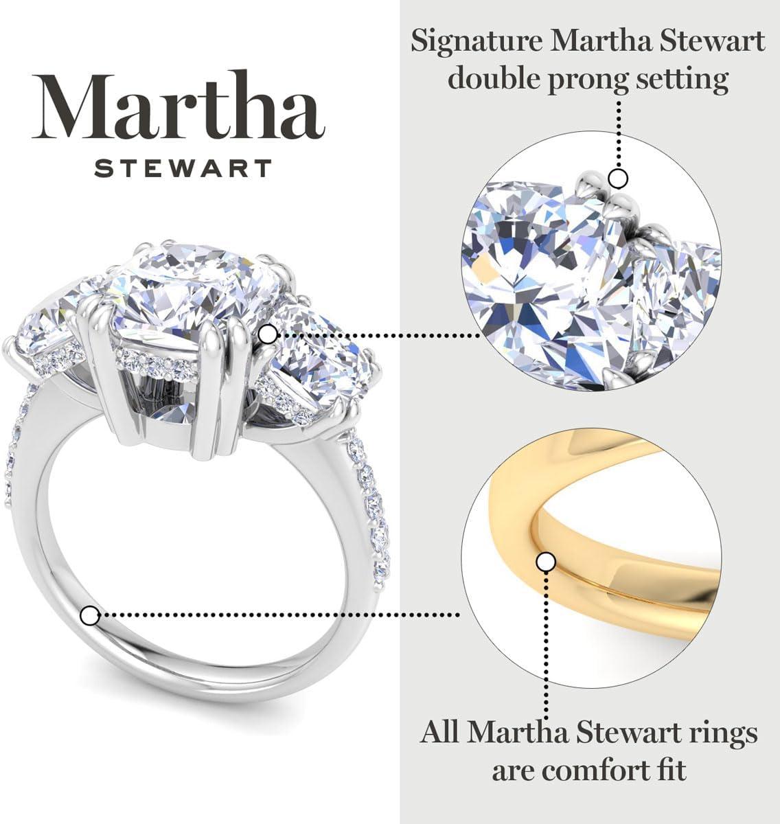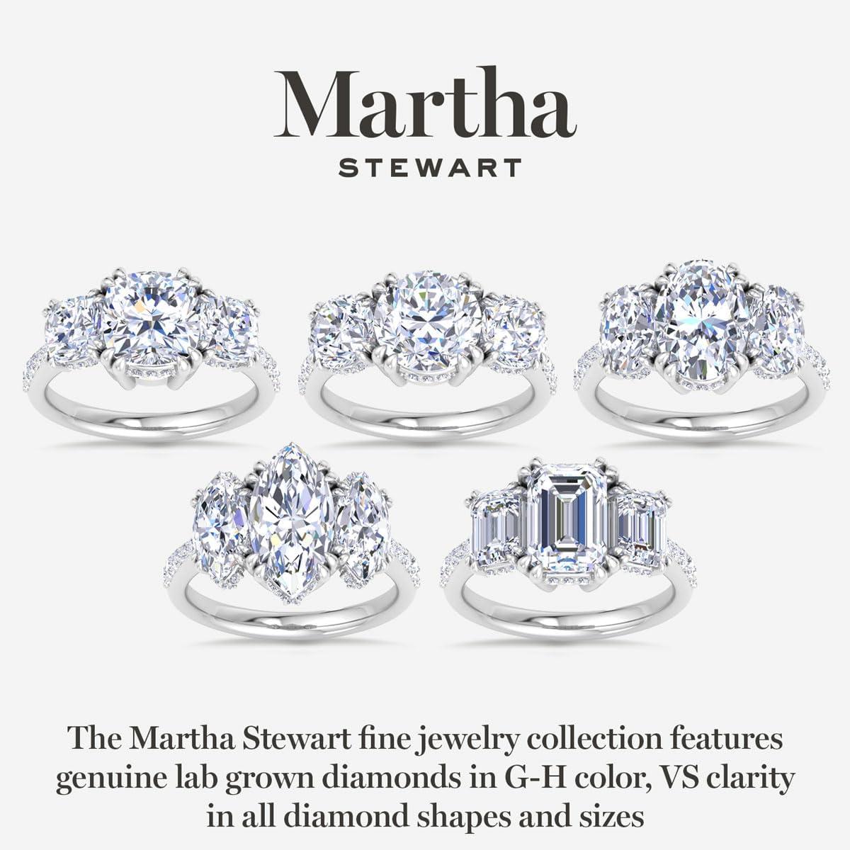 Showcasing class, style and timeless sophistication, the Martha Stewart fine jewelry collection is here to be celebrated. This Martha Stewart lab grown diamond engagement ring features a 3 carat emerald, oval, round, marquise or cushion cut center lab grown diamond. It is accented with two lab grown diamonds in G-H color, VS clarity. There are 34 additional lab grown diamonds in accenting halos. Total carat weight is approximately 5 1/2 carats. This ring is available in 14 karat white and yellow gold. This Martha Stewart ring has a double-prong setting and is comfort fit for a luxurious feel on your finger. This ring also has a patent pending mirrored setting which increases the primary diamond's brilliance and beauty. Whether for a special occasion or to add a touch of elegance to everyday wear, this ring is sure to become a beloved heirloom. Martha Stewart’s dedication to quality and attention to detail are reflected in every piece, making this collection a celebration of timeless beauty and exceptional craftsmanship.