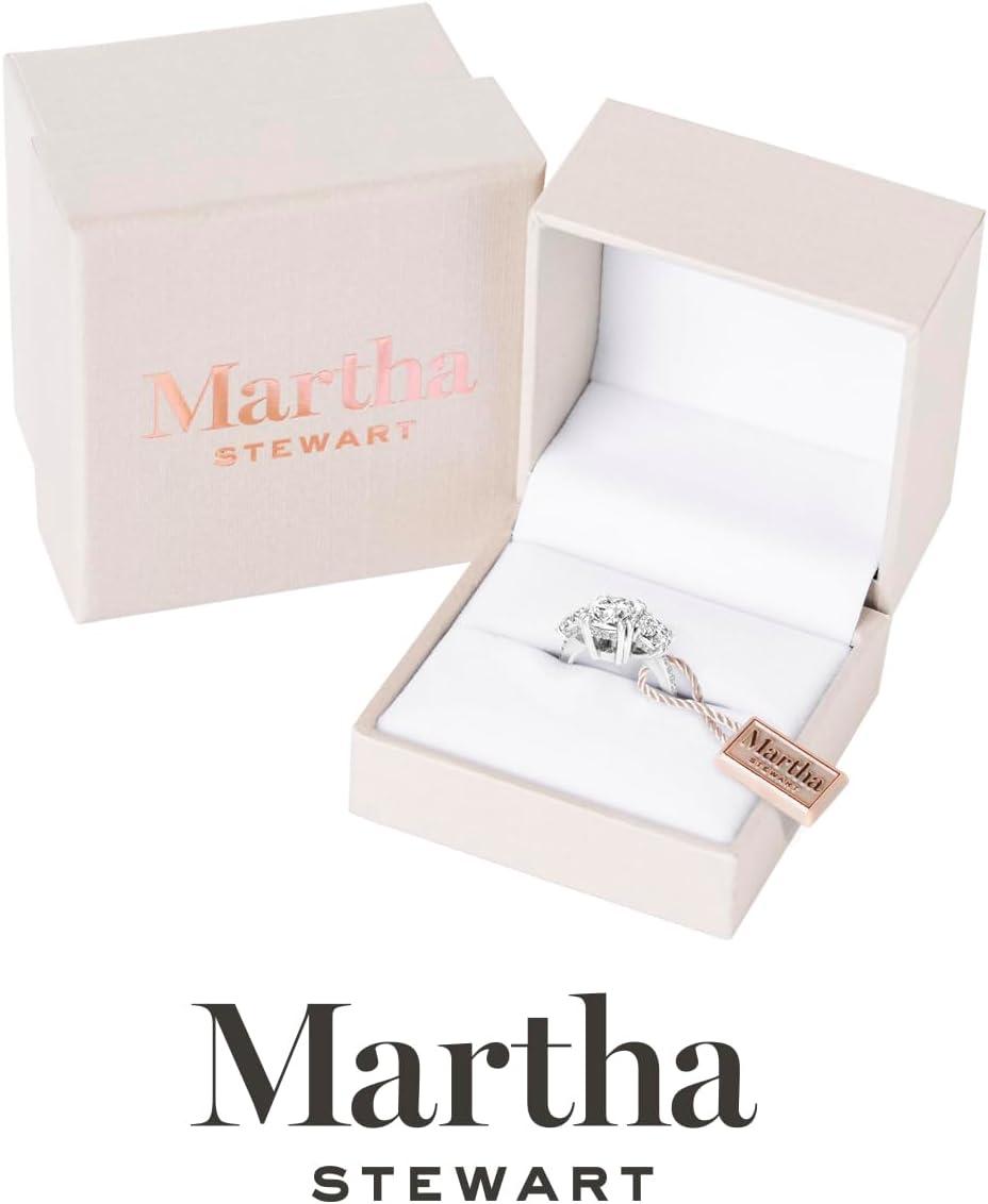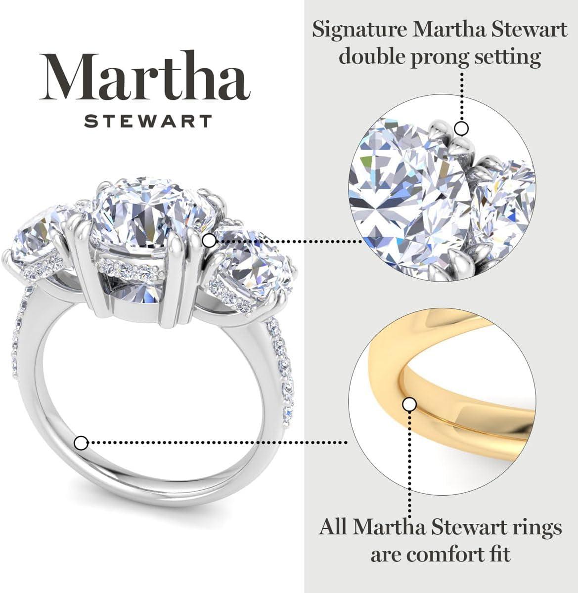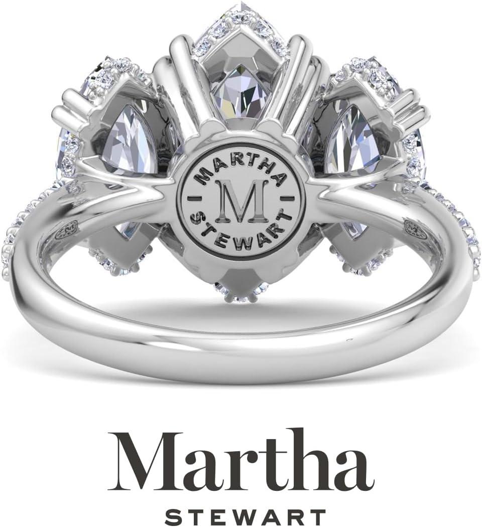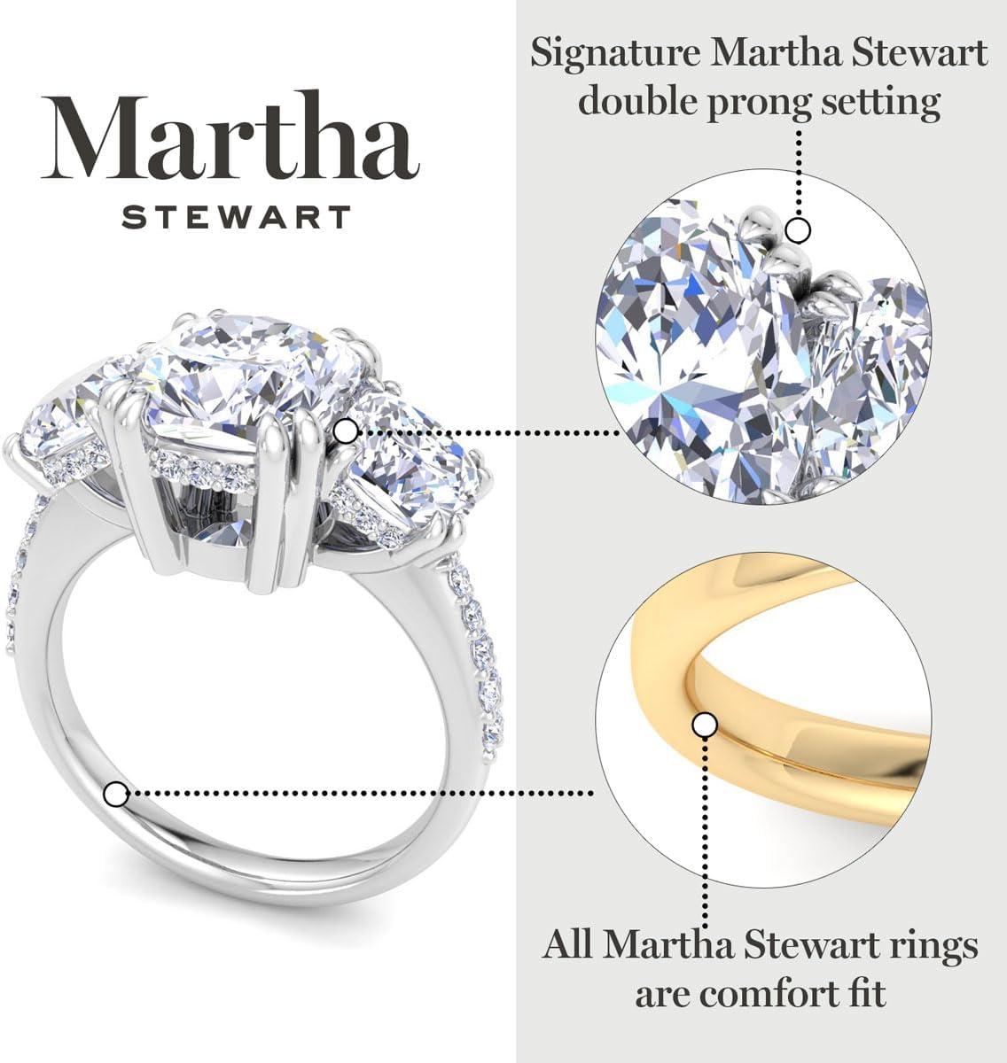 Showcasing class, style and timeless sophistication, the Martha Stewart fine jewelry collection is here to be celebrated. This Martha Stewart lab grown diamond engagement ring features a 3 carat emerald, oval, round, marquise or cushion cut center lab grown diamond. It is accented with two lab grown diamonds in G-H color, VS clarity. There are 34 additional lab grown diamonds in accenting halos. Total carat weight is approximately 5 1/2 carats. This ring is available in 14 karat white and yellow gold. This Martha Stewart ring has a double-prong setting and is comfort fit for a luxurious feel on your finger. This ring also has a patent pending mirrored setting which increases the primary diamond's brilliance and beauty. Whether for a special occasion or to add a touch of elegance to everyday wear, this ring is sure to become a beloved heirloom. Martha Stewart’s dedication to quality and attention to detail are reflected in every piece, making this collection a celebration of timeless beauty and exceptional craftsmanship.