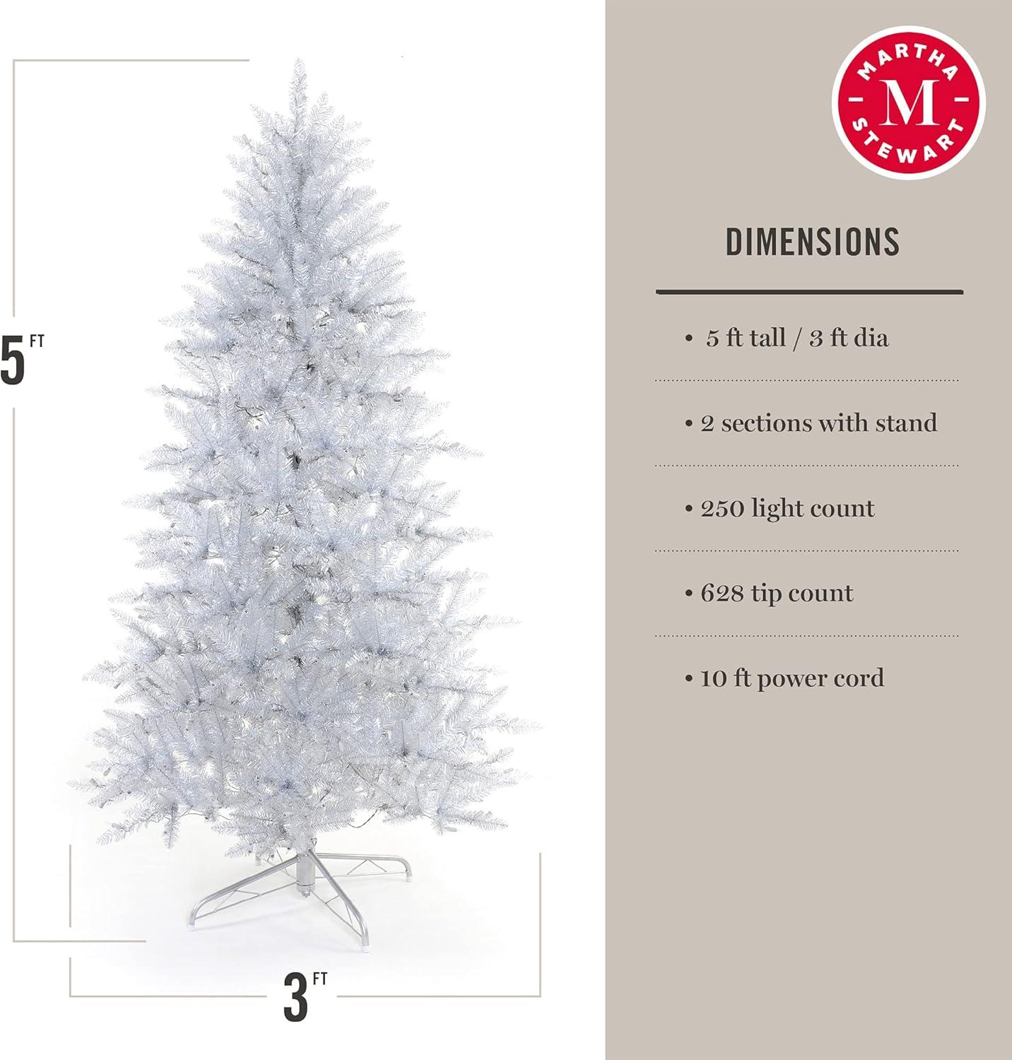 Designed by Martha Stewart exclusively for , this pre-lit glittering Silver Tinsel Christmas tree including stand measures 5 feet tall by 3 feet wide, and includes an 18 inch wide stable metal base. Constructed with a look and feel that’s festive and modern, this tree comes out of the box needing very little shaping thanks to our Memory Wire Branches. With a 628 tip-count, the silver tinsel branches create a modern Christmas Look. Our hinged branches are permanently affixed as opposed to dated and tedious individually attached branches found on many artificial trees. Vertical internal branches and a garland-wrapped pole make for minimal gaps and spaces, and the secure, self-centering one-screw-stand keep set up easy as 1-2-3. Skip right to the fun of hanging your ornaments! The tree comes prestrung with 250 clear warm white incandescent lights to create a warm and festive glow that remains lit even if a bulb is removed or broken. No more hunting for one light that shuts the whole tree down! Tree turns off and on easily with discreet inline foot pedal, and our patented “power in the pole” Instant Power Technology means that only one plug is needed to send power from the wall all the way through the tree and up to the convenient Tree Topper Plug at the top – no messy extension cords! Includes a 10ft power cord, 12 replacement bulbs, and white gloves for sprucing up your tree.