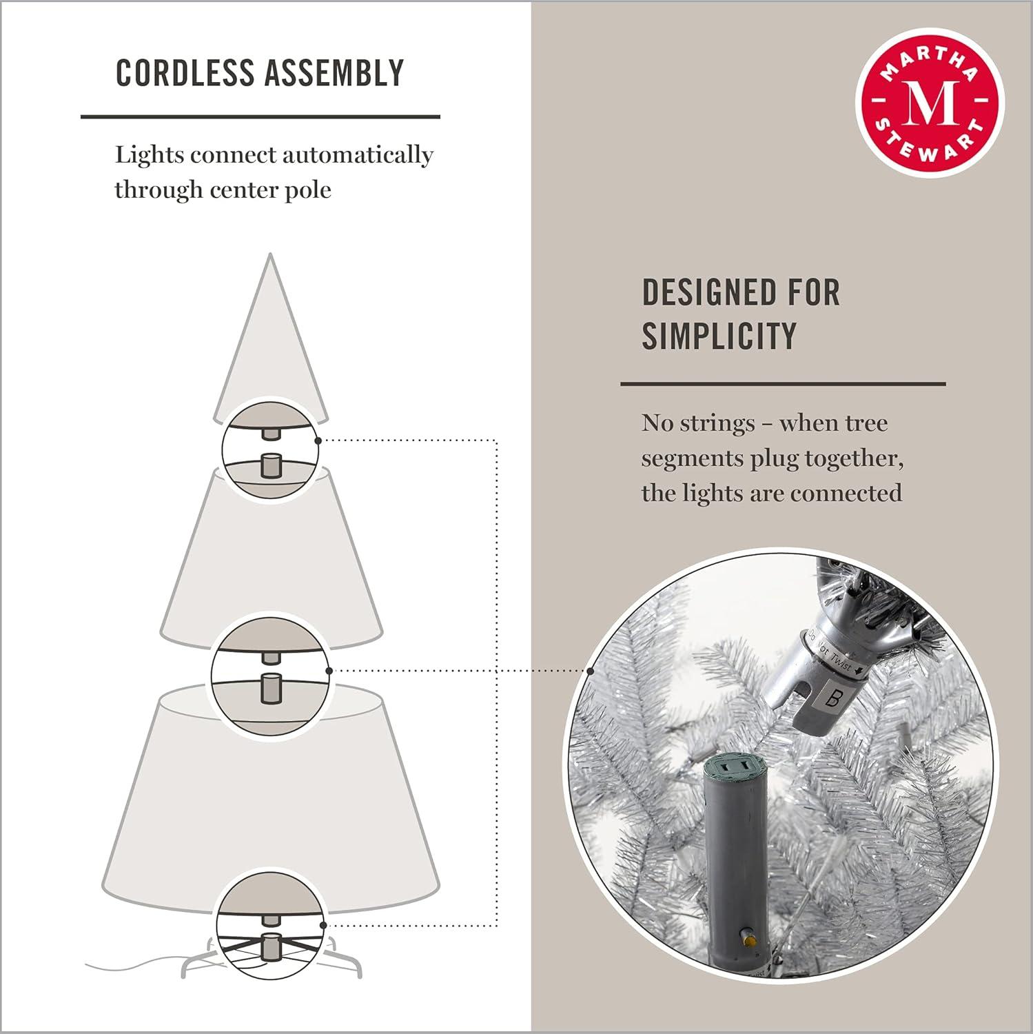 Designed by Martha Stewart exclusively for , this pre-lit glittering Silver Tinsel Christmas tree including stand measures 5 feet tall by 3 feet wide, and includes an 18 inch wide stable metal base. Constructed with a look and feel that’s festive and modern, this tree comes out of the box needing very little shaping thanks to our Memory Wire Branches. With a 628 tip-count, the silver tinsel branches create a modern Christmas Look. Our hinged branches are permanently affixed as opposed to dated and tedious individually attached branches found on many artificial trees. Vertical internal branches and a garland-wrapped pole make for minimal gaps and spaces, and the secure, self-centering one-screw-stand keep set up easy as 1-2-3. Skip right to the fun of hanging your ornaments! The tree comes prestrung with 250 clear warm white incandescent lights to create a warm and festive glow that remains lit even if a bulb is removed or broken. No more hunting for one light that shuts the whole tree down! Tree turns off and on easily with discreet inline foot pedal, and our patented “power in the pole” Instant Power Technology means that only one plug is needed to send power from the wall all the way through the tree and up to the convenient Tree Topper Plug at the top – no messy extension cords! Includes a 10ft power cord, 12 replacement bulbs, and white gloves for sprucing up your tree.