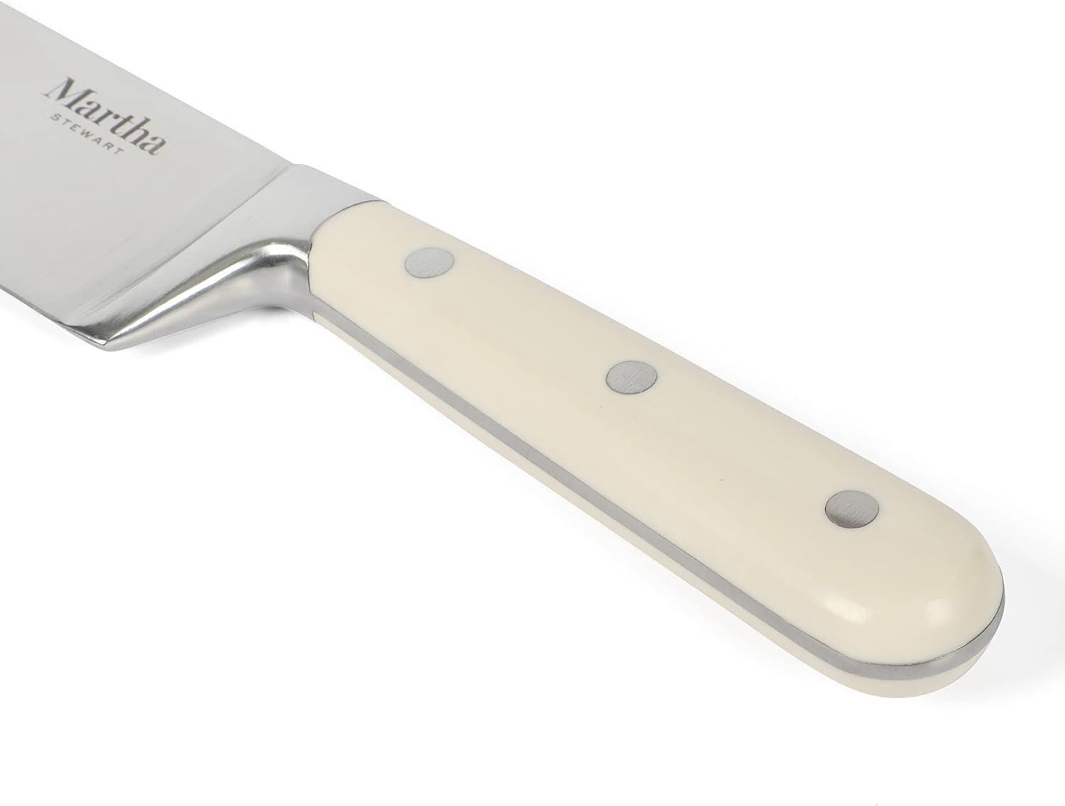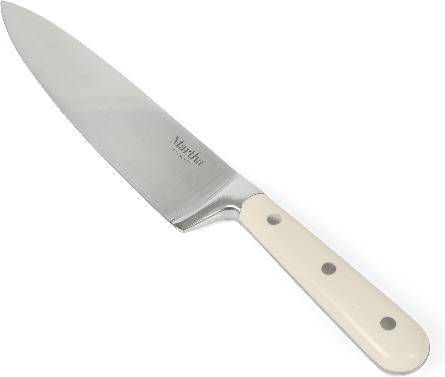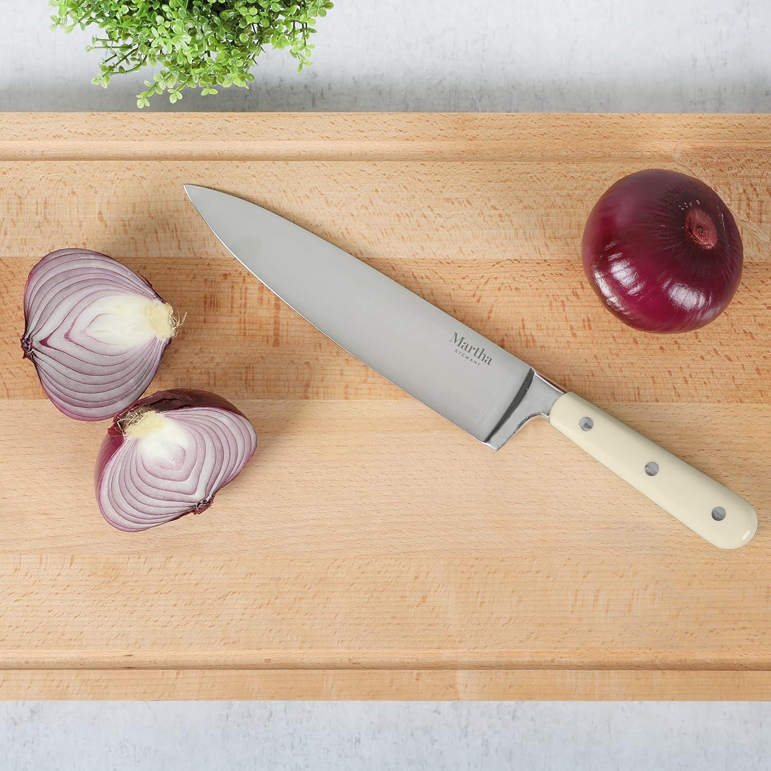 A home chef's best friend in the kitchen is a dependable knife. The Martha Stewart Ruxton 8-inch Chef Knife in Martha Blue is an all-purpose piece of cutlery that is designed (and destined) to be the most used knife in the kitchen. Made from high-carbon stainless steel, the full tang knife has a tapered grind edge – perfect for cutting through meat or poultry, mincing garlic, dicing carrots, and more. It offers maximum sharpness and alignment that is easy to hone and maintain. The triple-riverted ABS handle promotes strength and and balance and ensures a safe and comfortable grip for better control. Hand wash only.