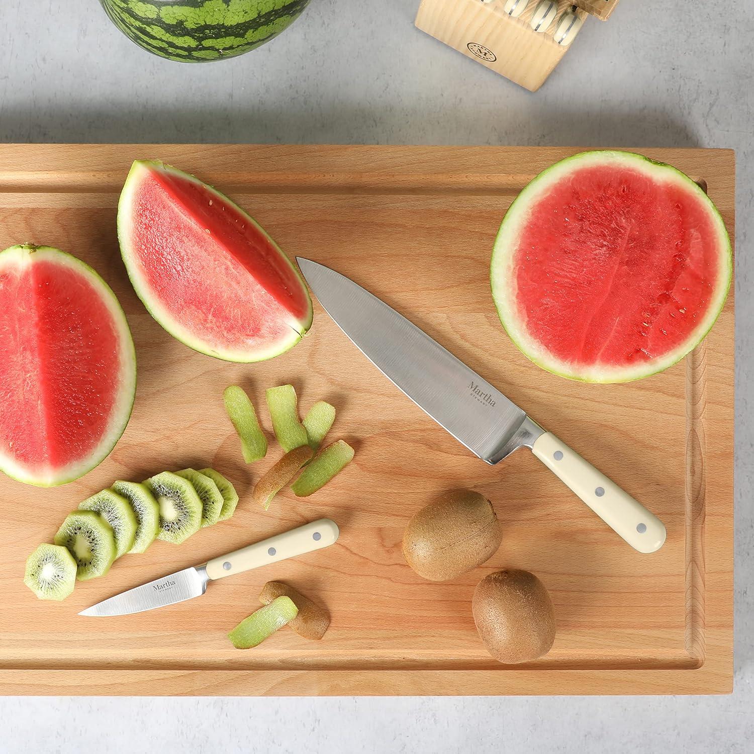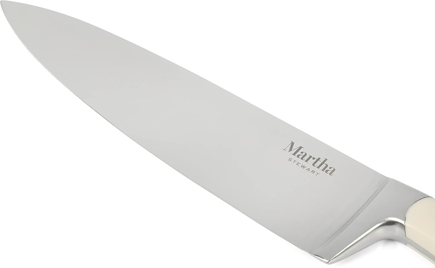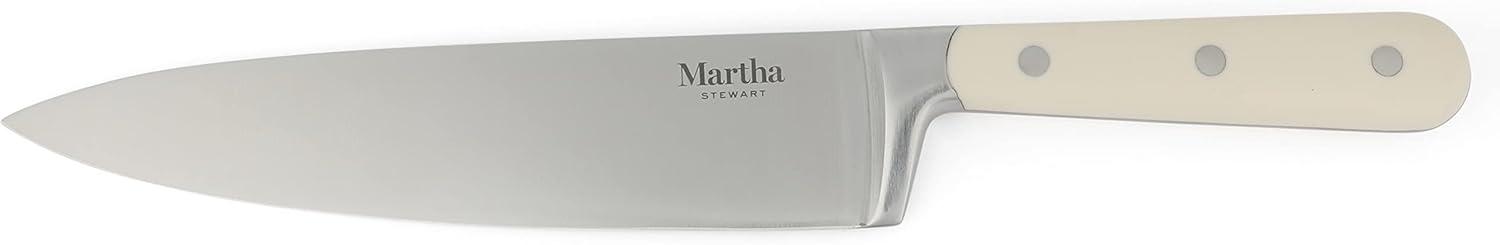 A home chef's best friend in the kitchen is a dependable knife. The Martha Stewart Ruxton 8-inch Chef Knife in Martha Blue is an all-purpose piece of cutlery that is designed (and destined) to be the most used knife in the kitchen. Made from high-carbon stainless steel, the full tang knife has a tapered grind edge – perfect for cutting through meat or poultry, mincing garlic, dicing carrots, and more. It offers maximum sharpness and alignment that is easy to hone and maintain. The triple-riverted ABS handle promotes strength and and balance and ensures a safe and comfortable grip for better control. Hand wash only.