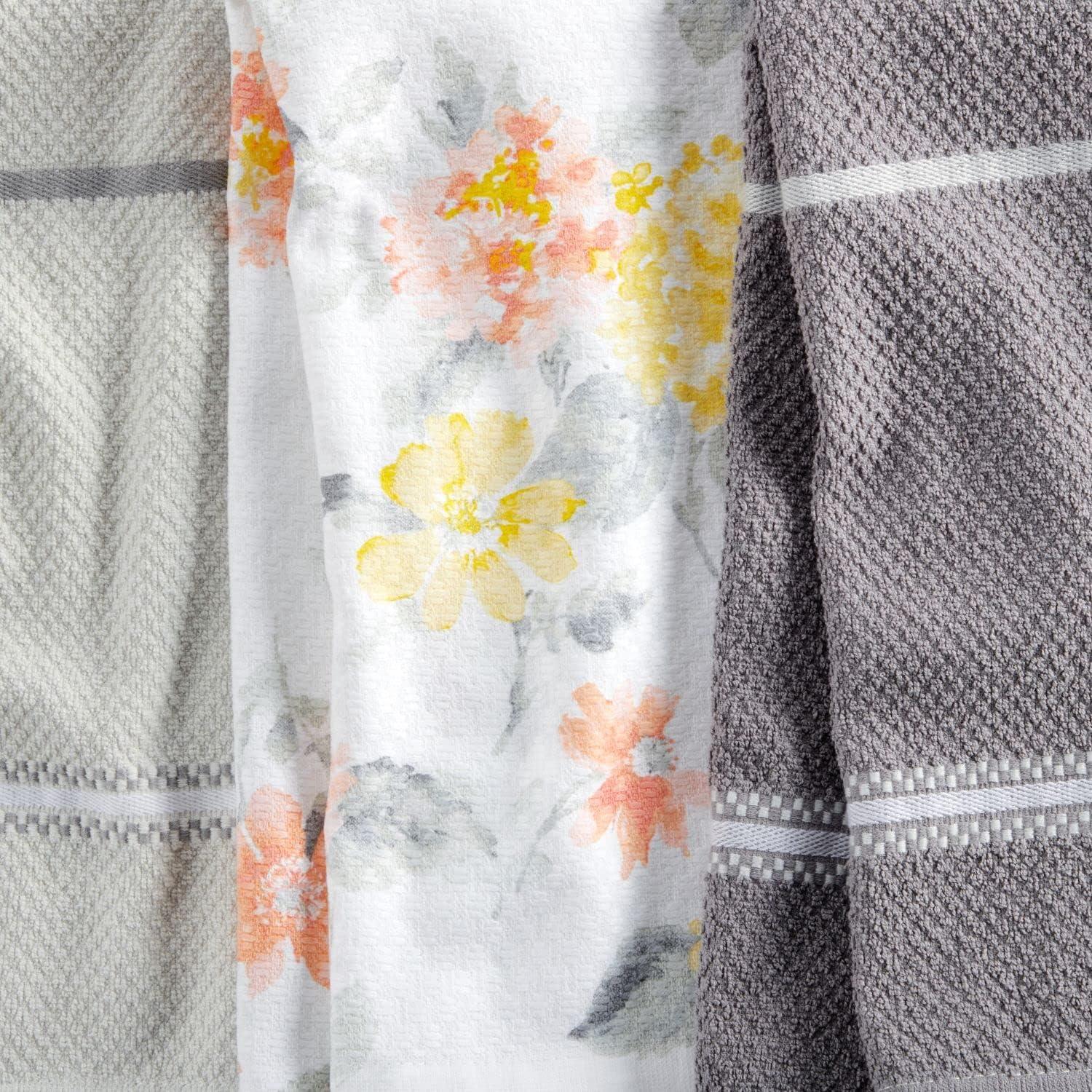 SET OF FOUR: This kitchen essentials set includes four (4) kitchen towels measuring 6″ W x 28″ L. Two (2) towels feature the Amber Floral print while the other two (2) towels are solid colors with a coordinating stripe detail.