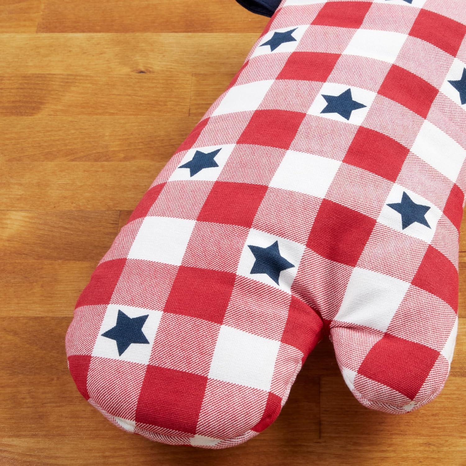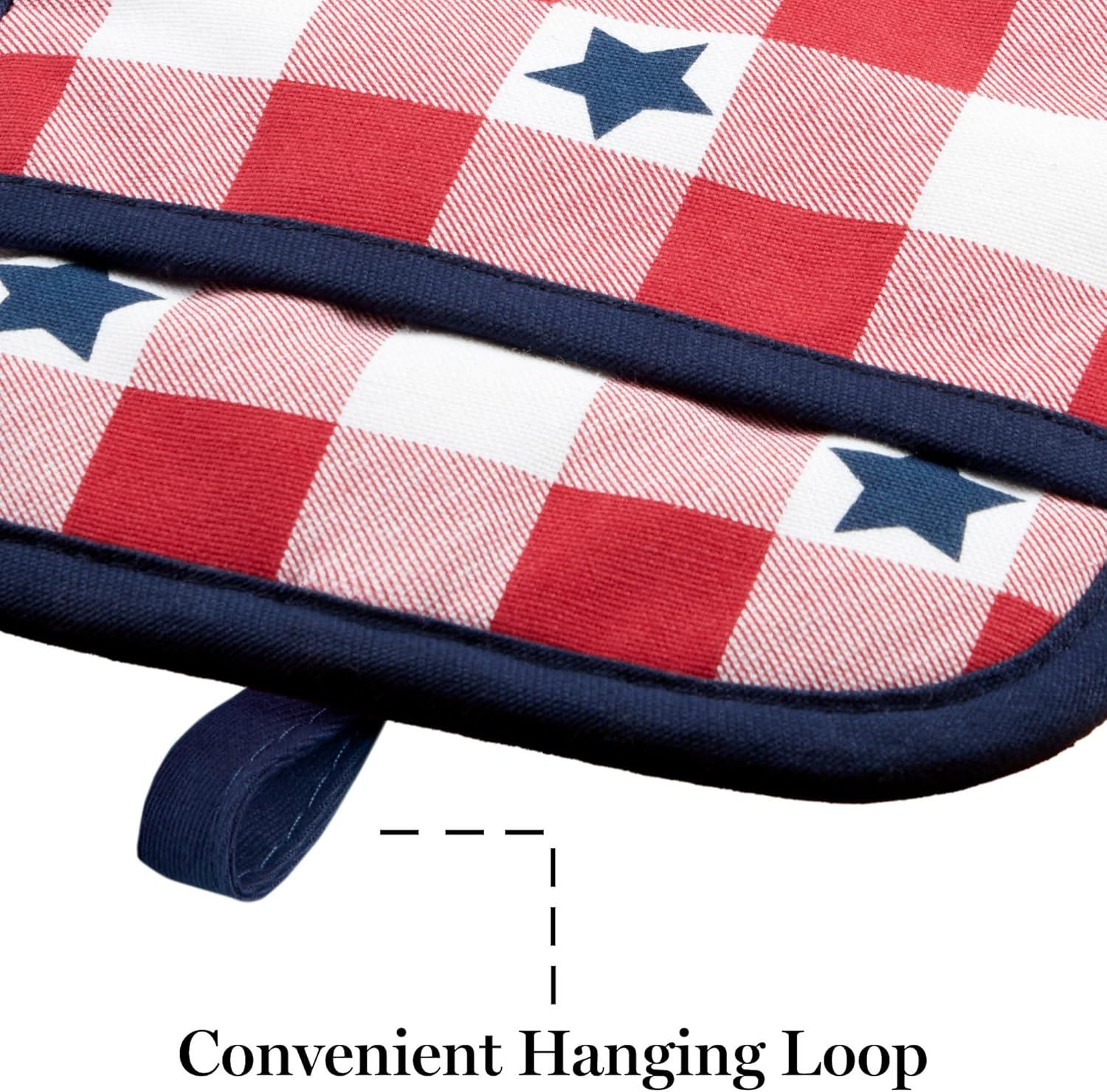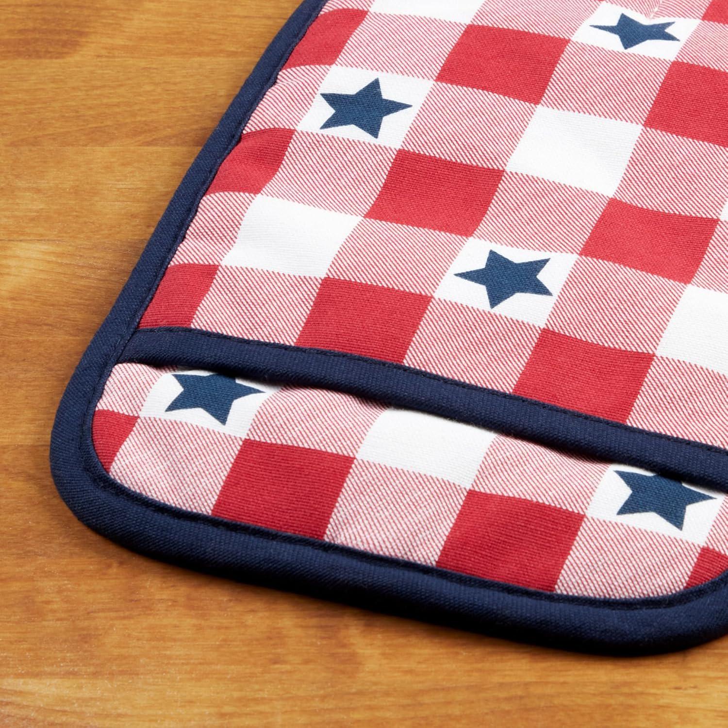 Add a touch of patriotic charm to your kitchen or table setting with the Martha Stewart Americana Star Gingham Plaid Collection. Whether in table linens or kitchen essentials, this vibrant USA red, white & blue pattern will enhance your home decor. The Martha Stewart Star Gingham Heat-Resistant Oven Mitt and Pot Holders Set includes one oven mitt and one matching pot holder. These matching USA red, white, and blue kitchen essentials protect your hands from hot pots and pans and offer a non-slip grip while cooking and baking. This decorative kitchen set is perfect for celebrating American national holidays like 4th of July, Election Day, Labor Day, and Memorial Day. Made of 100% Cotton, this Americana set is both durable and easy to clean.