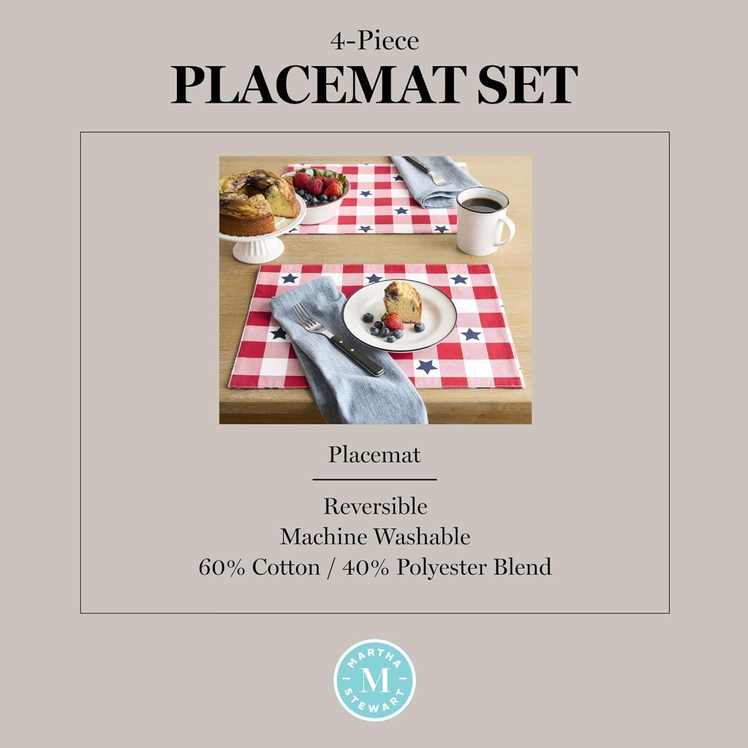 Add a touch of patriotic charm to your kitchen or table setting with the Martha Stewart Americana Star Gingham Plaid Collection. Whether in table linens or kitchen essentials, this vibrant USA red, white & blue pattern will enhance your home decor. The Americana Placemat 4-Pack Set is cotton-rich and reversible allowing for easy and functional decorating. Featuring a classic pigment print and a durable woven fabric, this 4th of July-inspired placemat set helps protect your tabletop and adds a patriotic touch to any table setting. Machine washable for easy care.