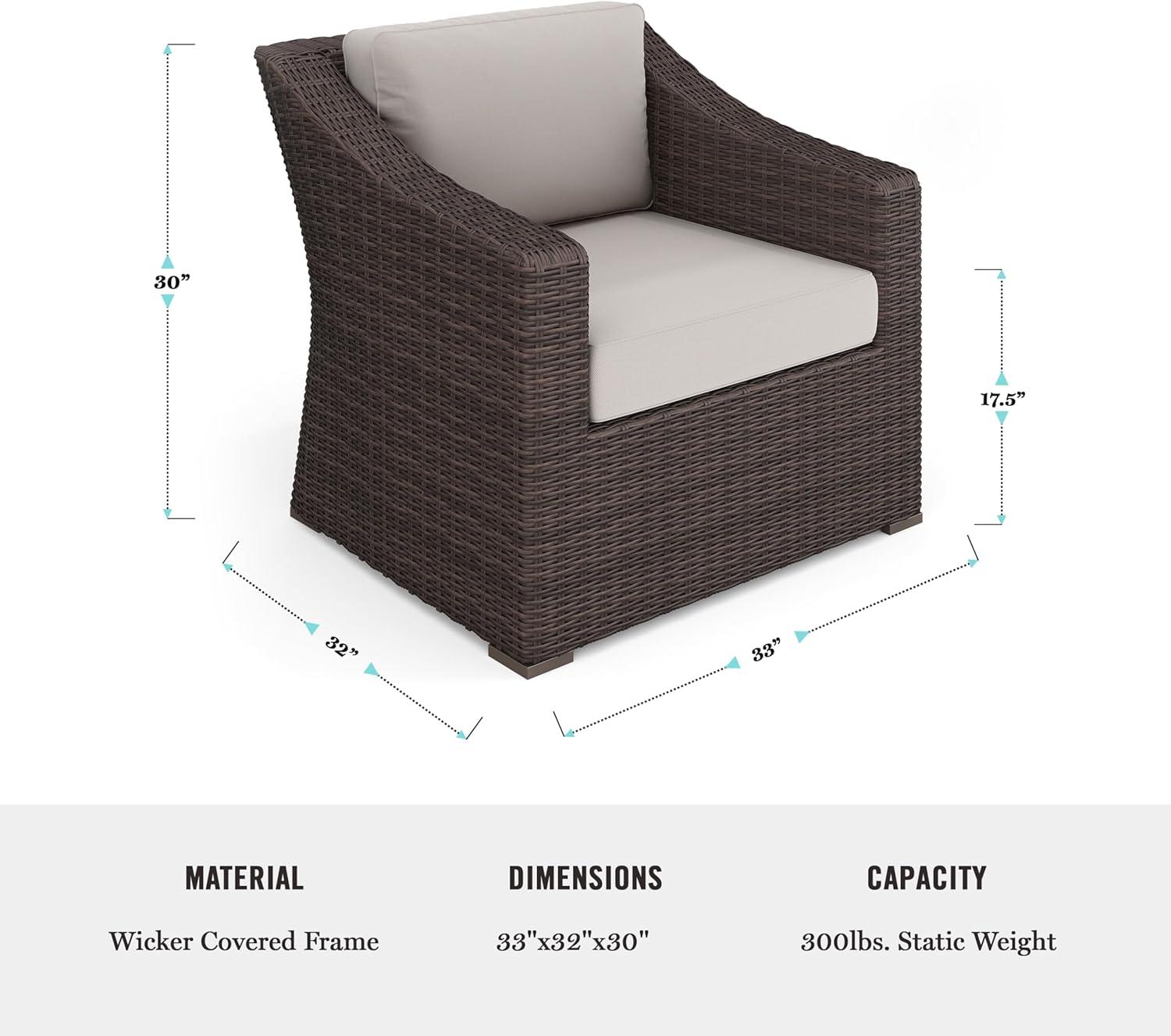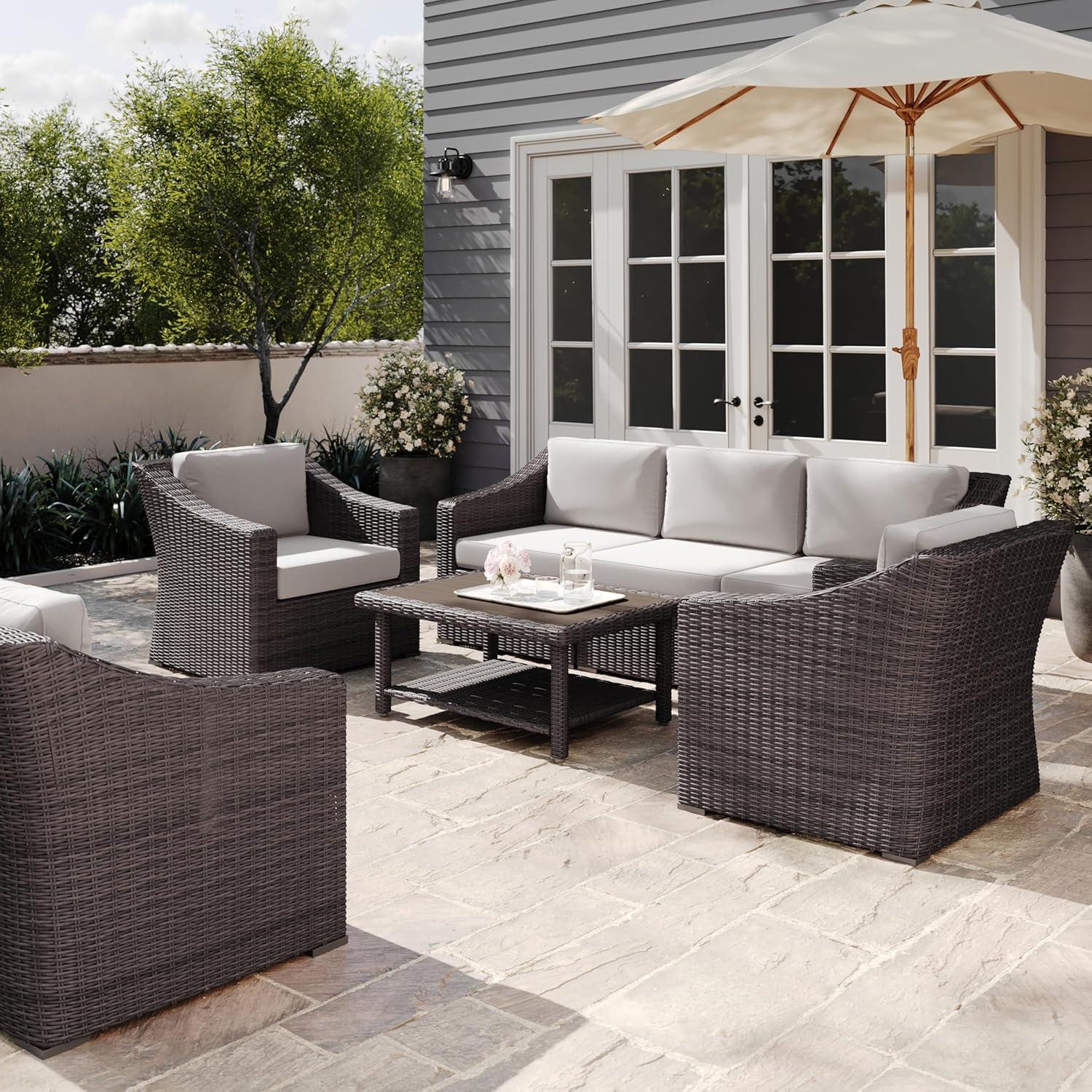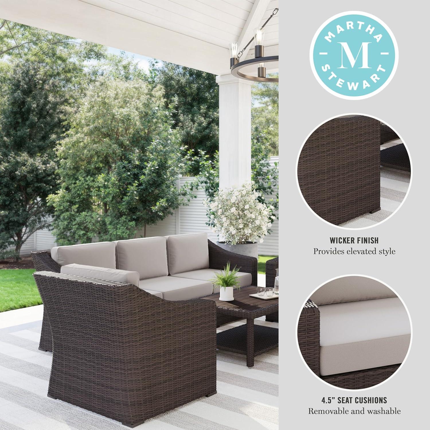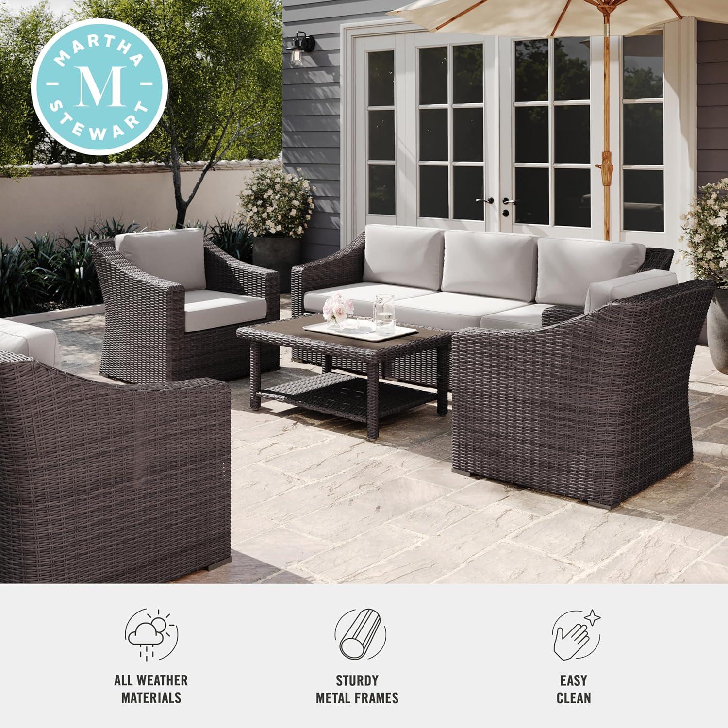 Refresh your patio space with the chic style and cozy comfort of this Martha Stewart Bedford 4-Piece Patio Conversation Set. Generously padded and sturdily built, this versatile patio set with a sofa, two accent chairs, and coffee table is ideal for reading al fresco or enjoying cocktails with friends. Graced with 4.5 thick all-weather seat cushions and luxurious back cushions, the wicker seating will cradle you in comfort, while the coffee table boasts a convenient lower shelf and a faux wood top to showcase picturesque charm. While the sofa is suitable as a standalone piece, you can purchase additional modular center and corner seats for a personalized configuration. Part of our Bedford collection, this set pairs wonderfully with the coordinating pieces allowing you to craft a custom collection that fits your entertaining needs. Setup is simple with tools included and step-by-step instructions while upkeep is just as easy.