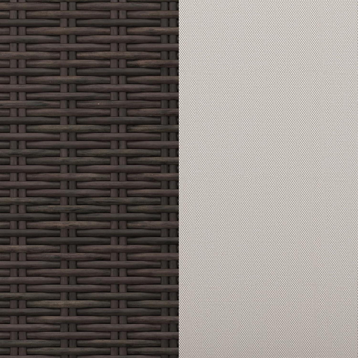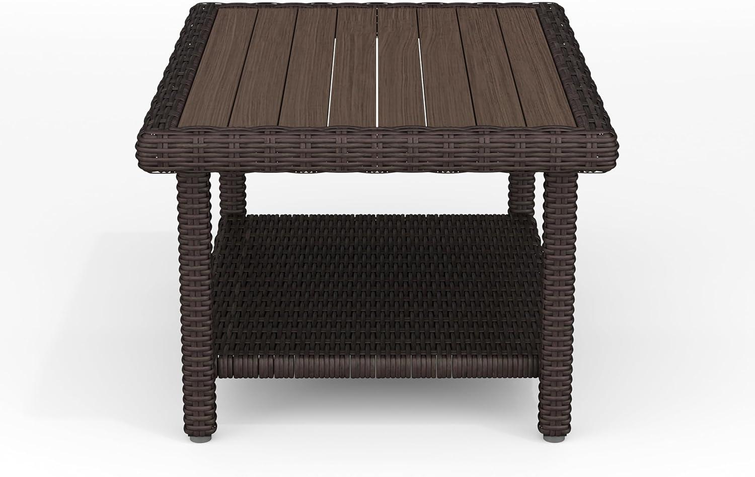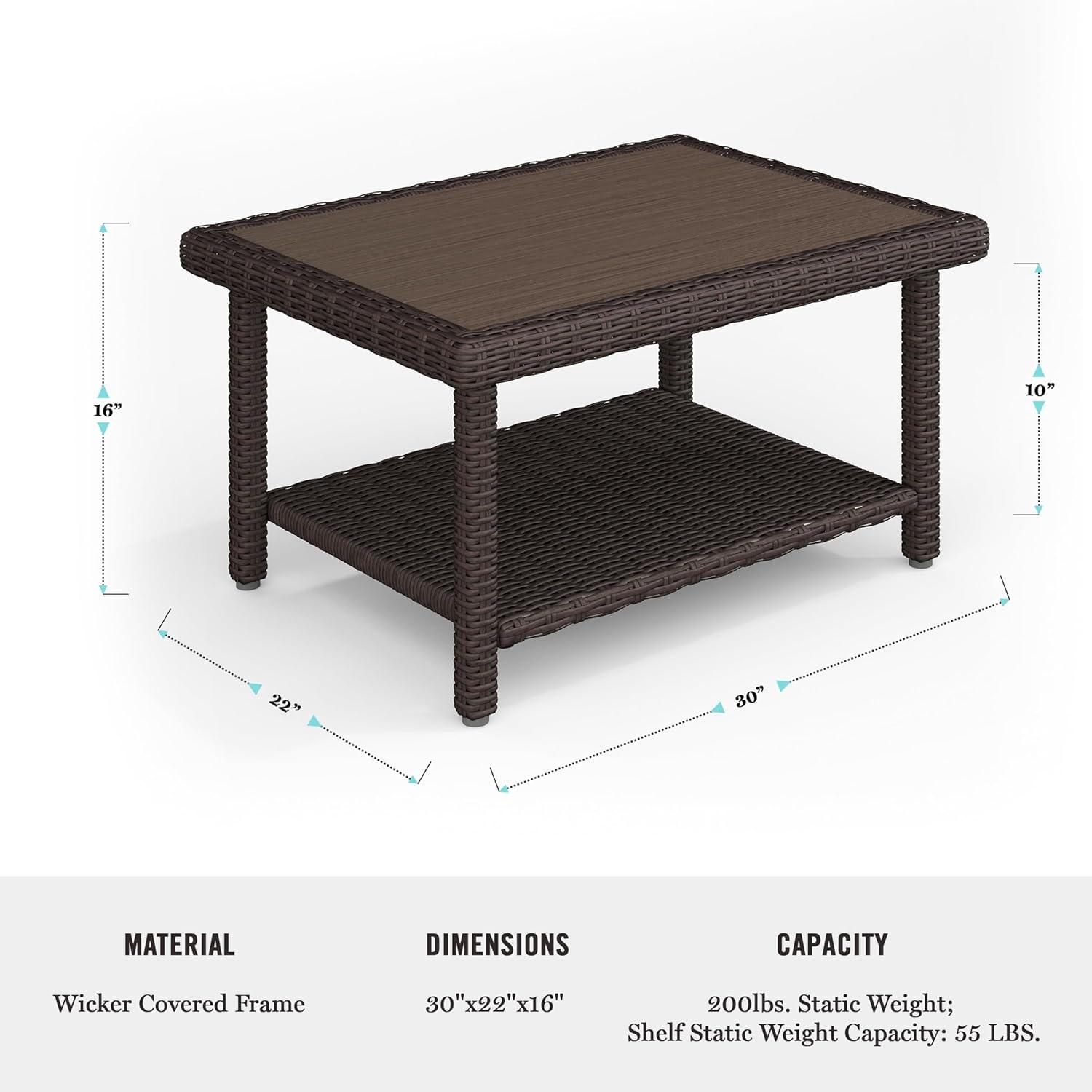 All-weather rustproof metal frame wrapped in rattan wicker adorns each sturdy frame, while the 4.5″ thick foam seat cushions and luxurious back cushions are made from all-weather olefin fabric; Table features a convenient lower shelf and Faux wood top