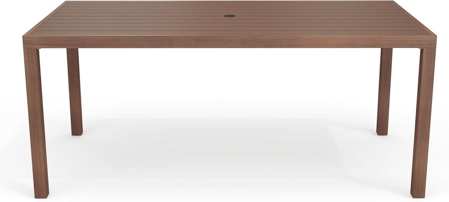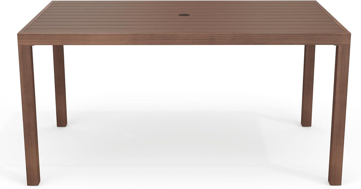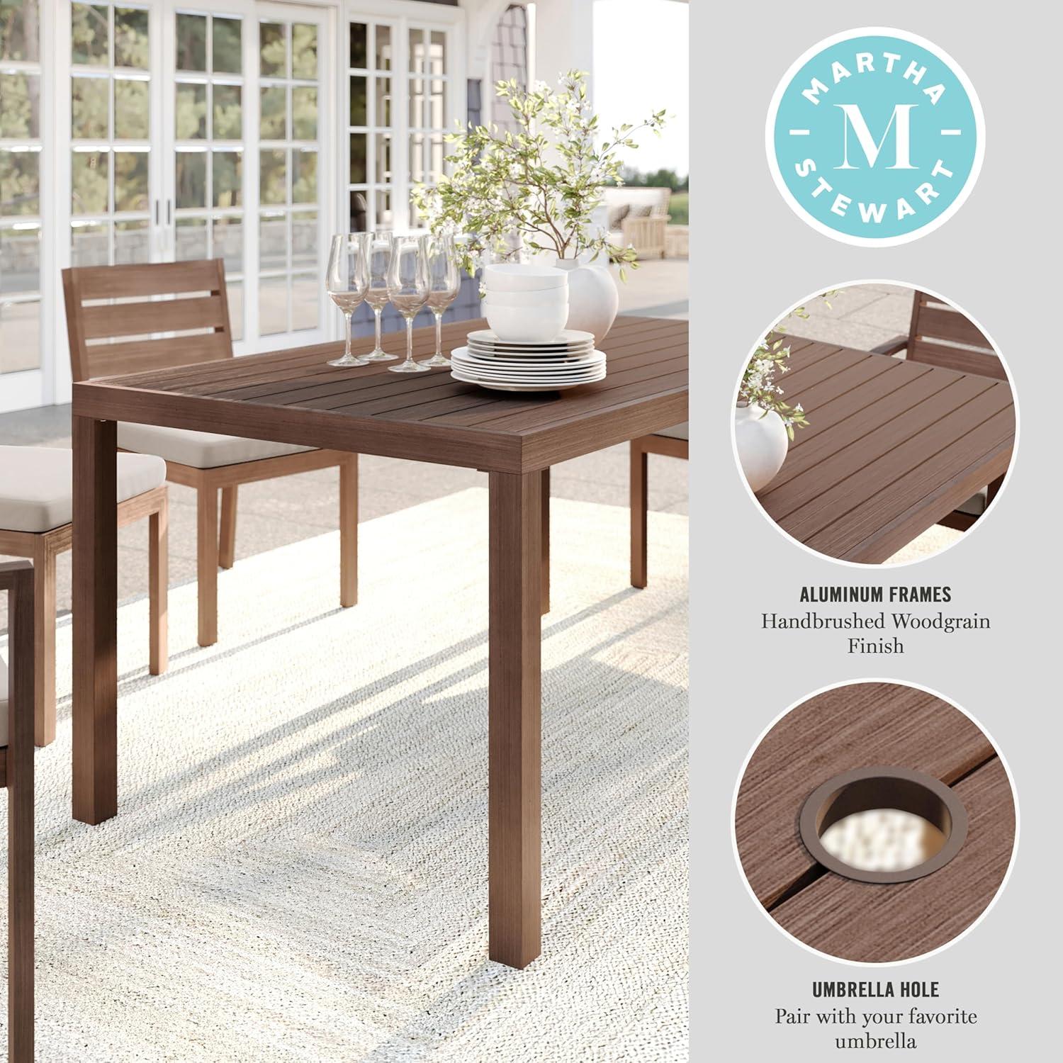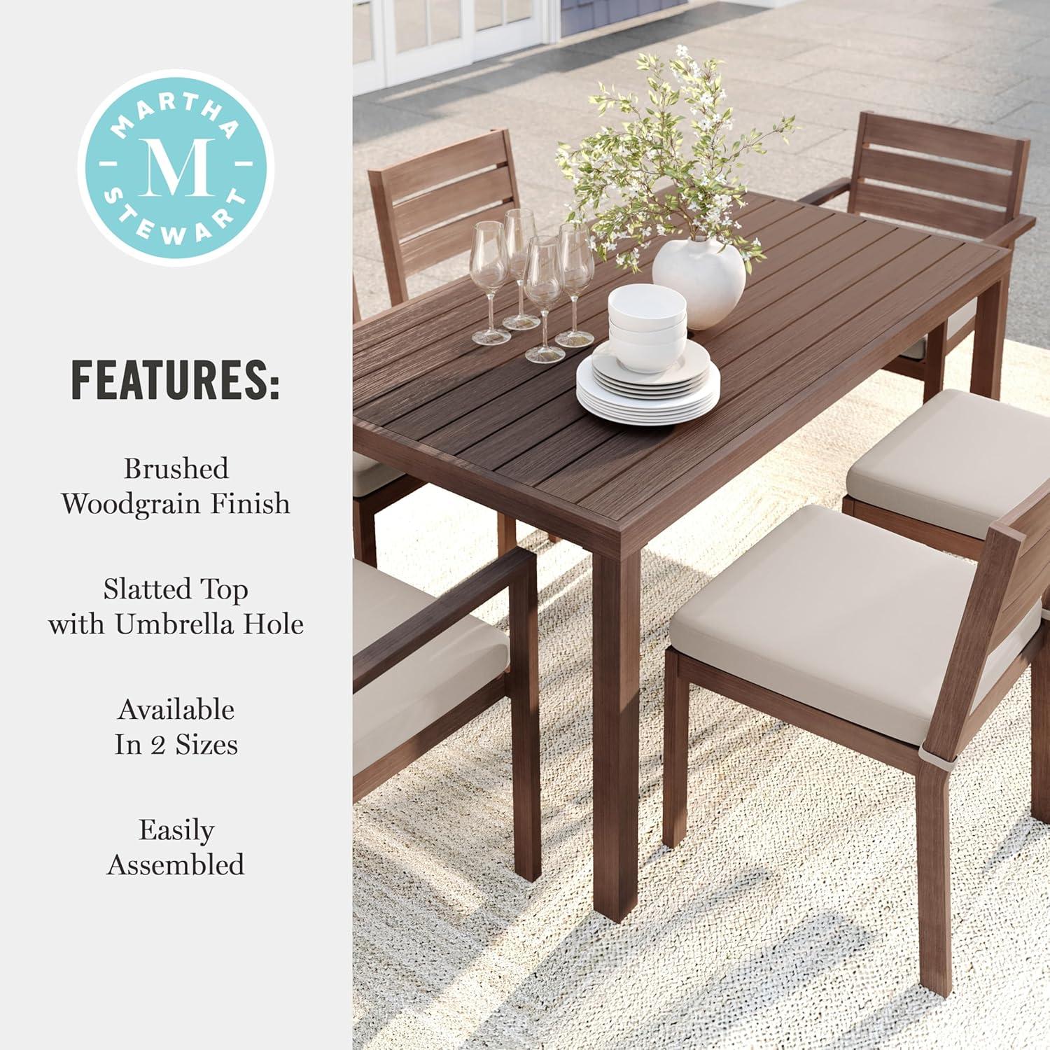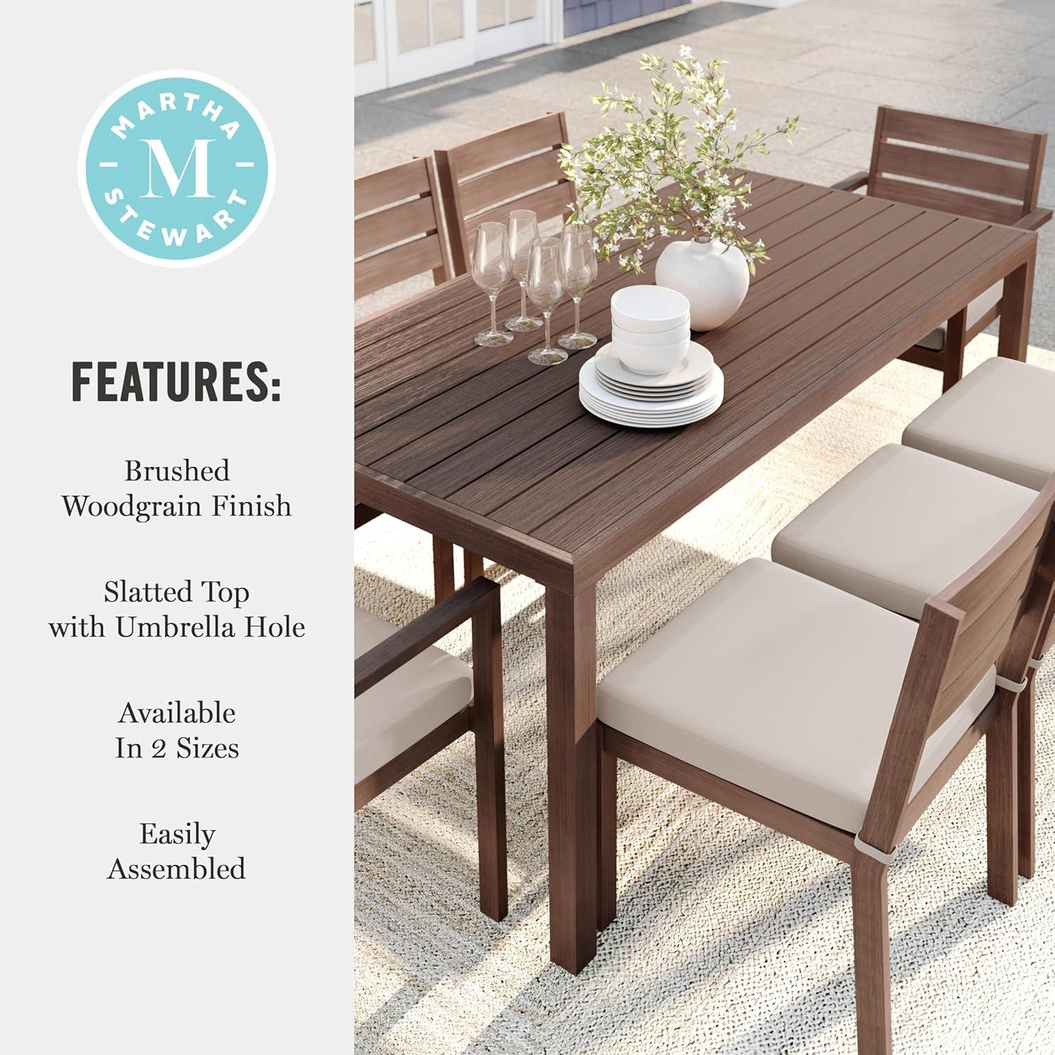 Elevate your indoor-outdoor sanctuary with the Martha Stewart Bedford Patio Table. Masterfully crafted with a beautiful hand-brushed woodgrain finish, this table seats eight and lends elegance to any occasion. All-weather materials deliver peace of mind to pair with your morning coffee or a favorite novel. An umbrella hole makes it easy to complement this indoor-outdoor dining table with your preferred patio umbrella (not included). Part of our Bedford collection, this indoor-outdoor table pairs wonderfully with the coordinating armchairs, armless chairs, and bar stools, perfect for crafting a custom collection that fits your entertaining needs. Setup is simple with tools included and step-by-step instructions and only minimal maintenance is required, making this patio table a must have for everyday use as well as special occasions.