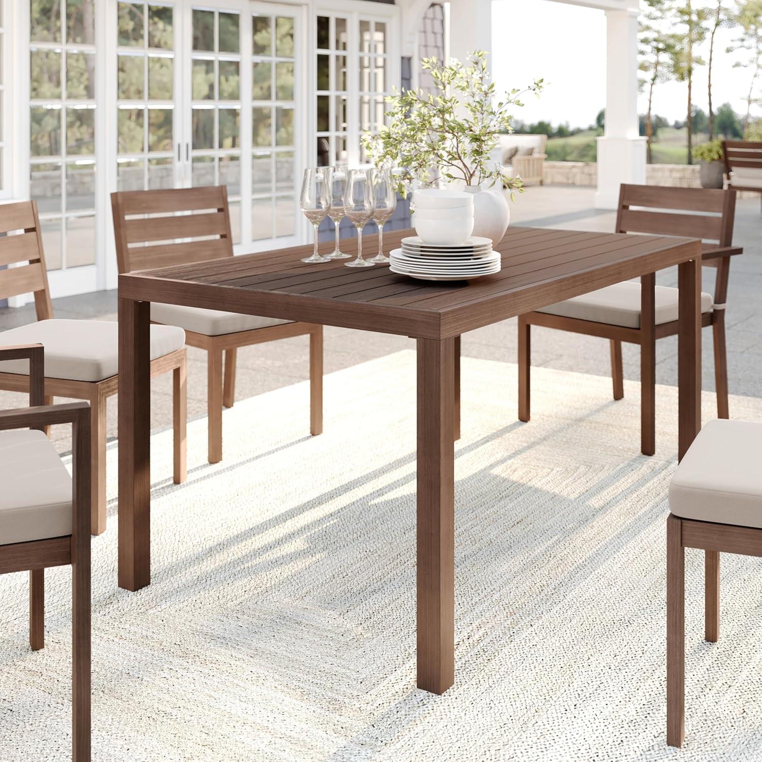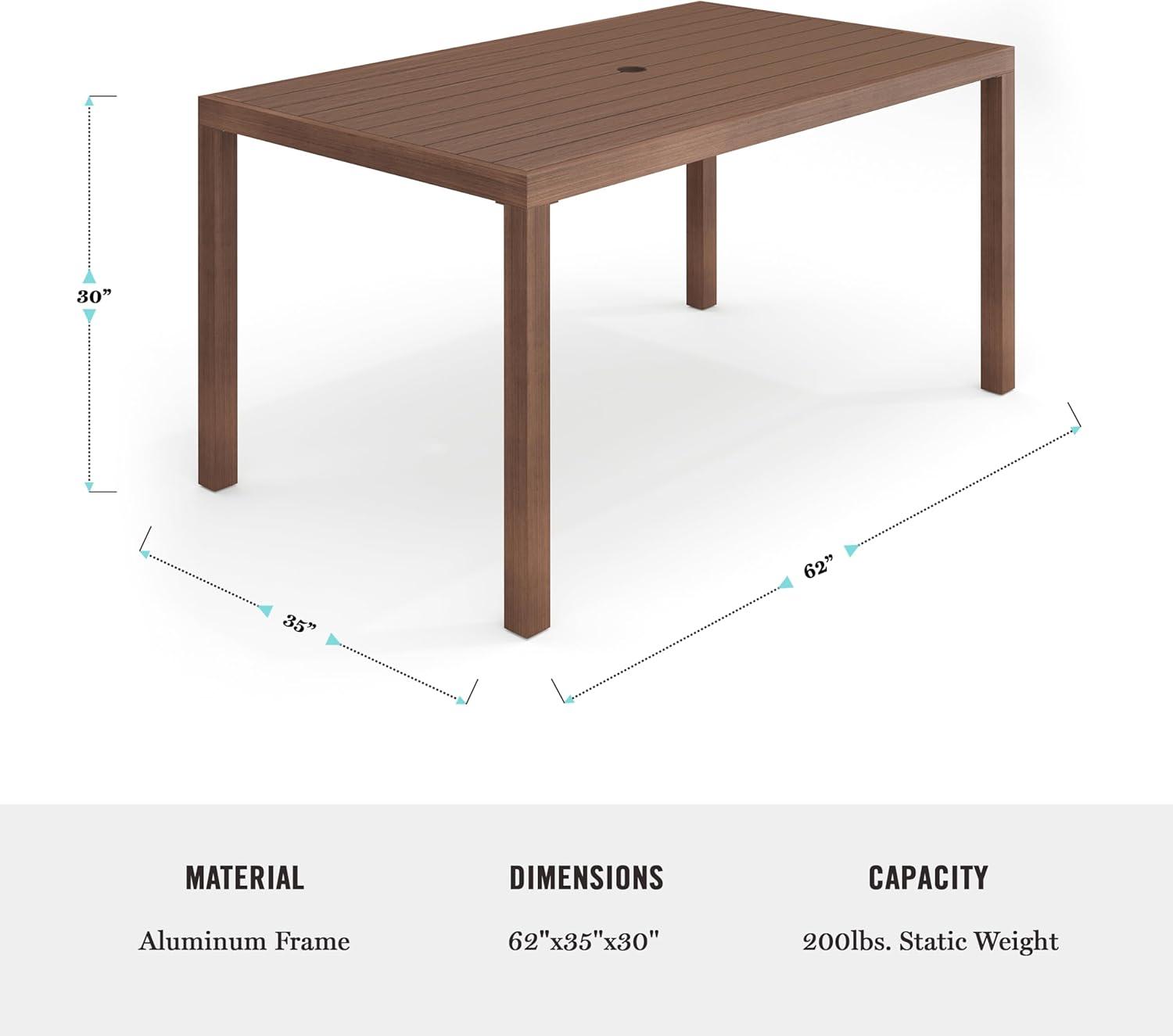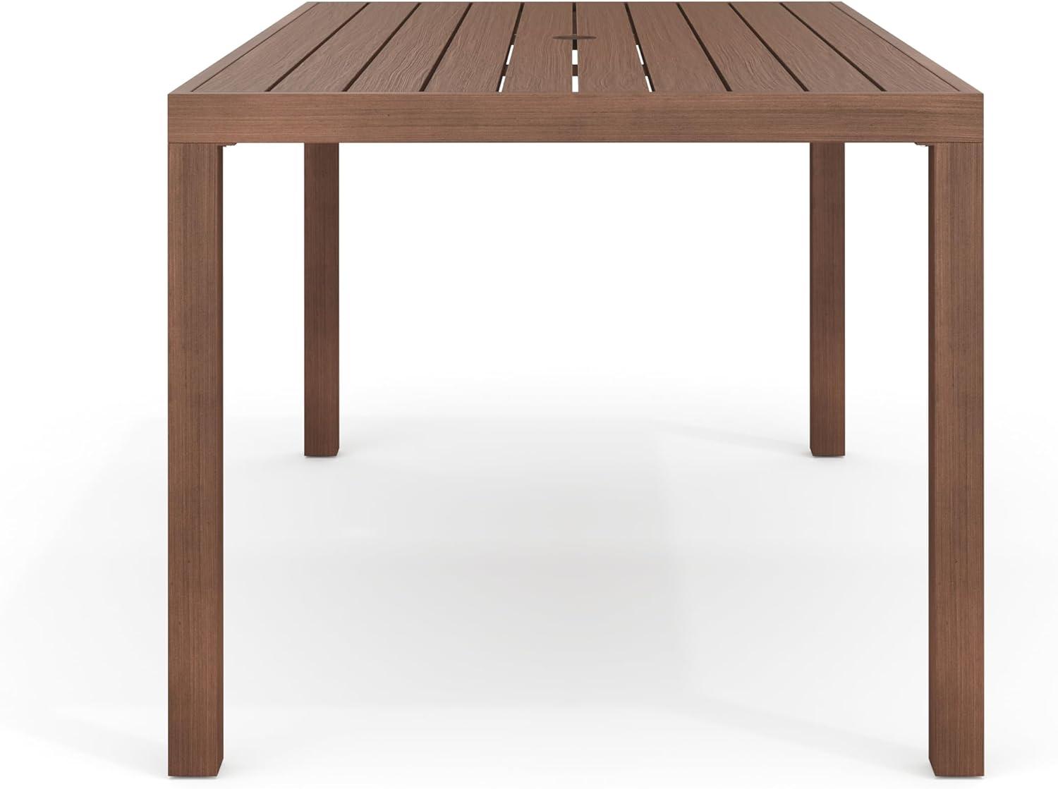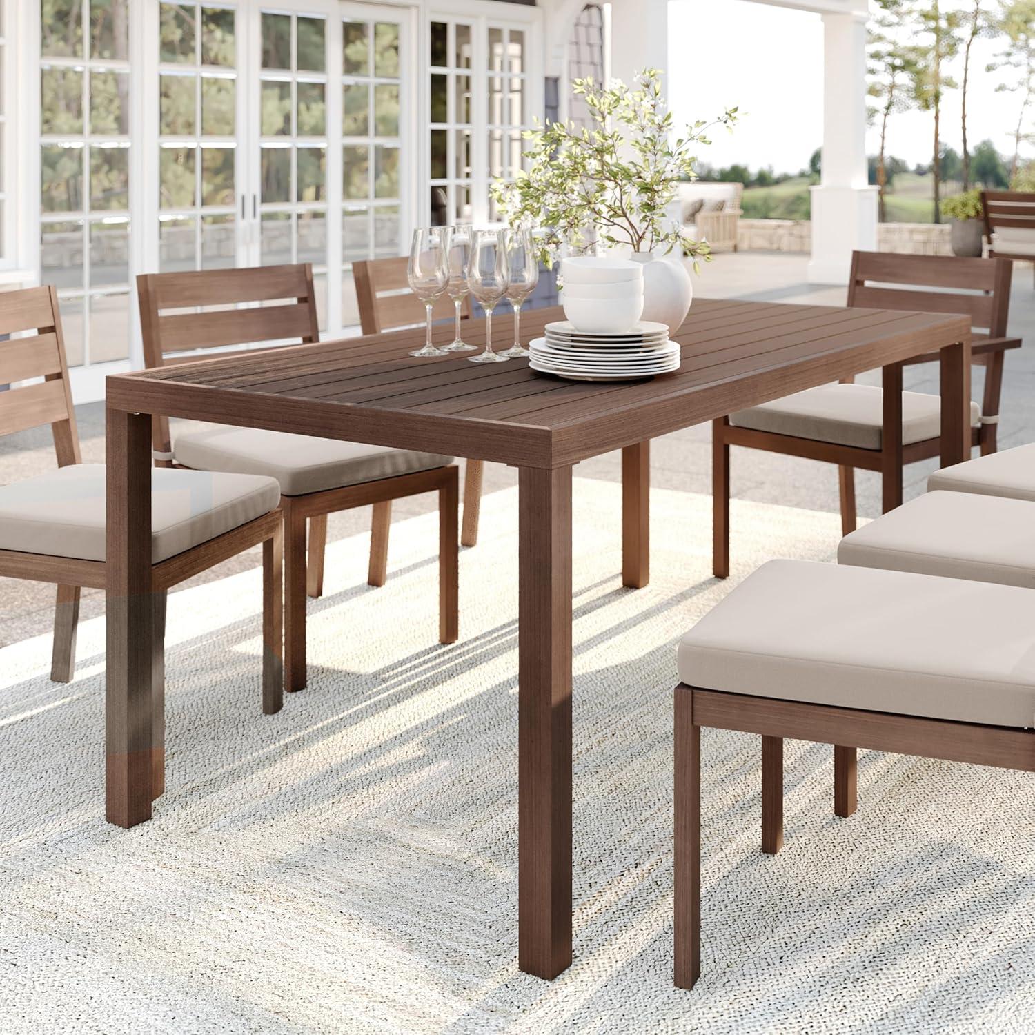 Elevate your indoor-outdoor sanctuary with the Martha Stewart Bedford Patio Table. Masterfully crafted with a beautiful hand-brushed woodgrain finish, this table seats eight and lends elegance to any occasion. All-weather materials deliver peace of mind to pair with your morning coffee or a favorite novel. An umbrella hole makes it easy to complement this indoor-outdoor dining table with your preferred patio umbrella (not included). Part of our Bedford collection, this indoor-outdoor table pairs wonderfully with the coordinating armchairs, armless chairs, and bar stools, perfect for crafting a custom collection that fits your entertaining needs. Setup is simple with tools included and step-by-step instructions and only minimal maintenance is required, making this patio table a must have for everyday use as well as special occasions.