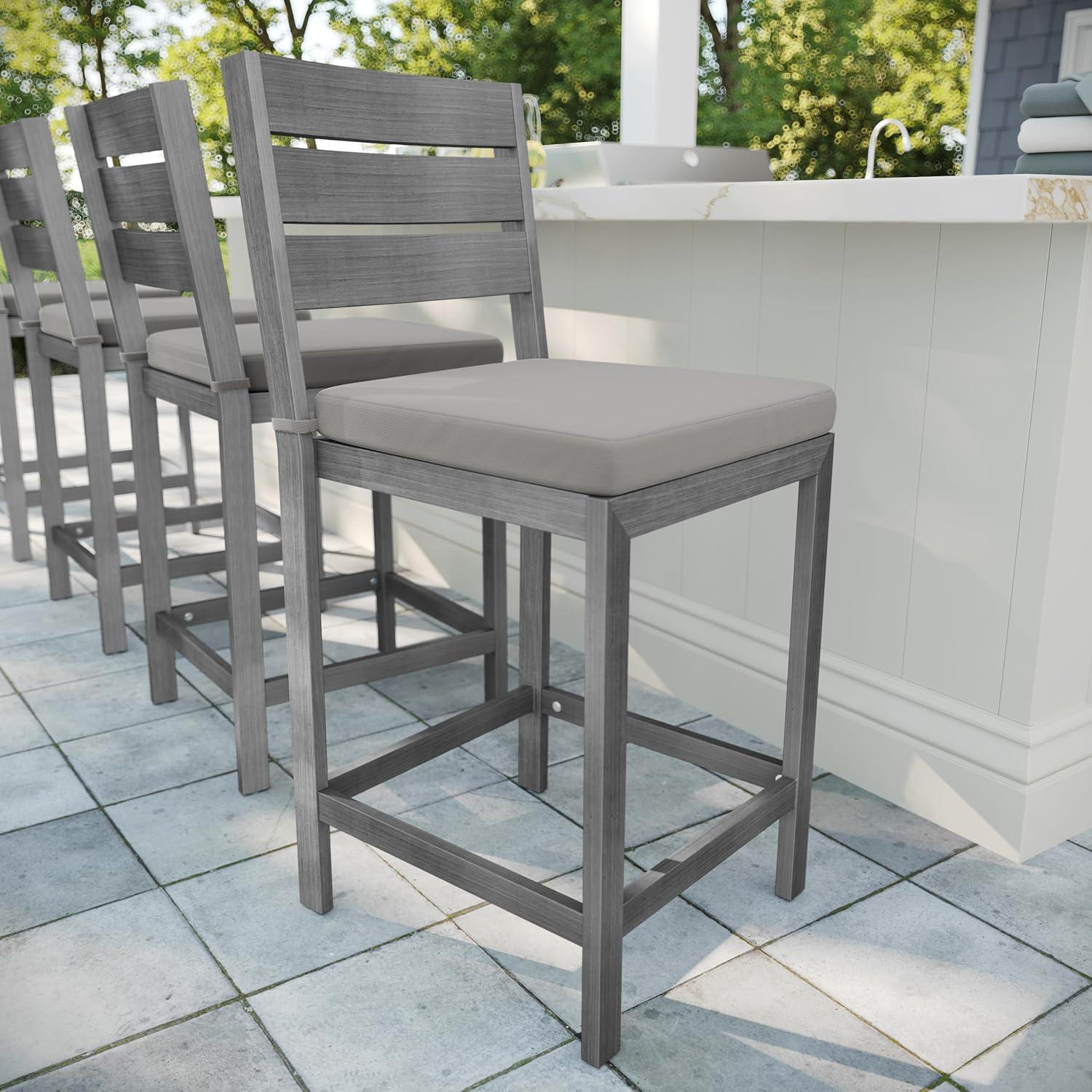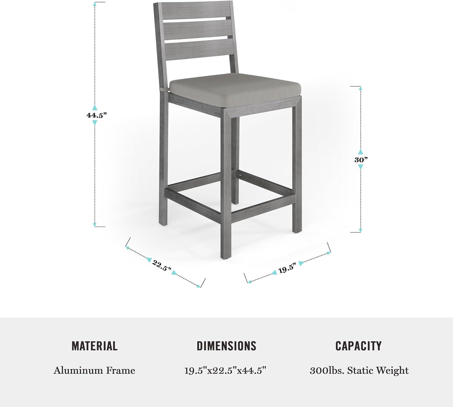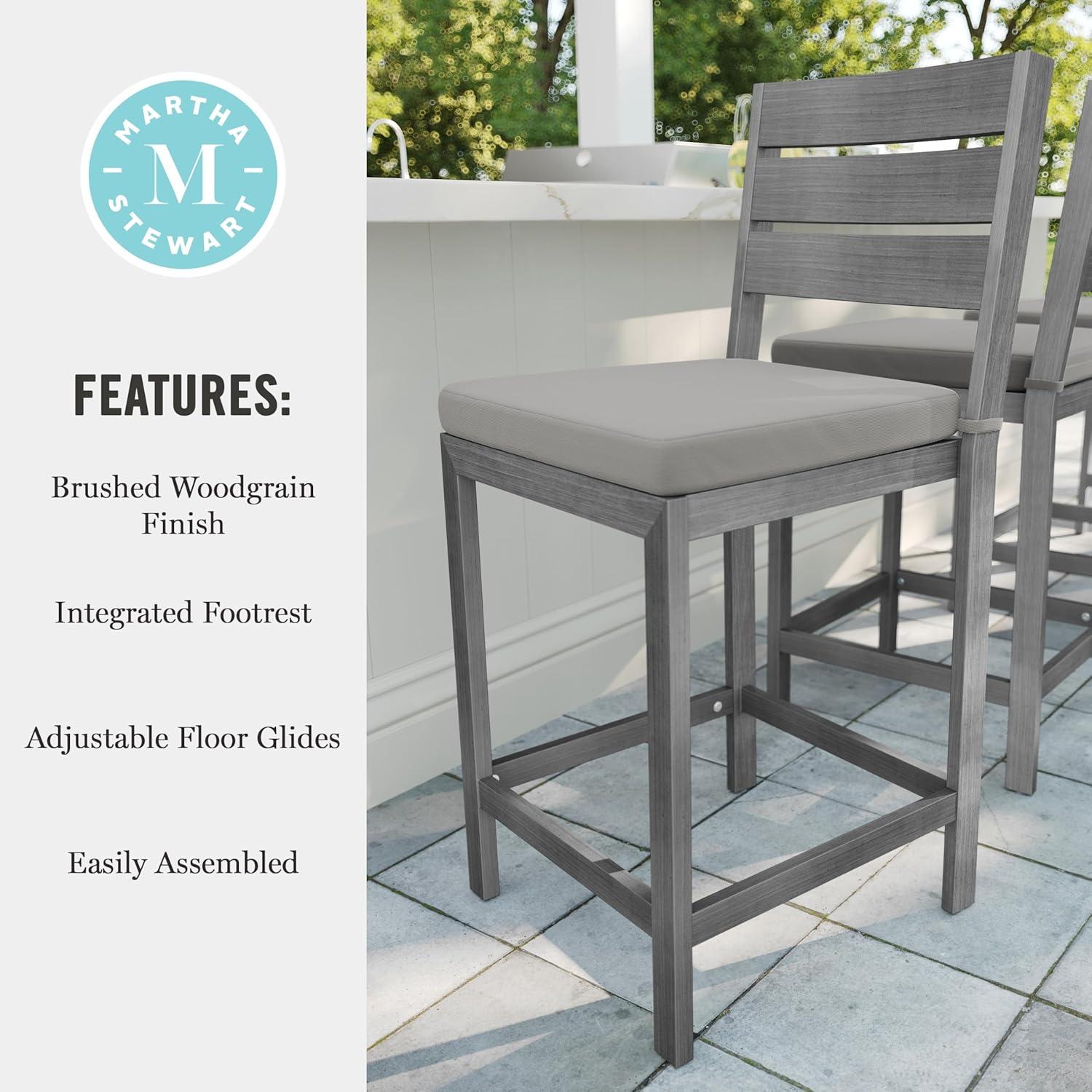 Martha Stewart Bedford Indoor-Outdoor Aluminum Patio Bar Stools with Brushed Woodgrain Finish in Gray and Gray All-Weather Cushions, Set of 2(Grey)