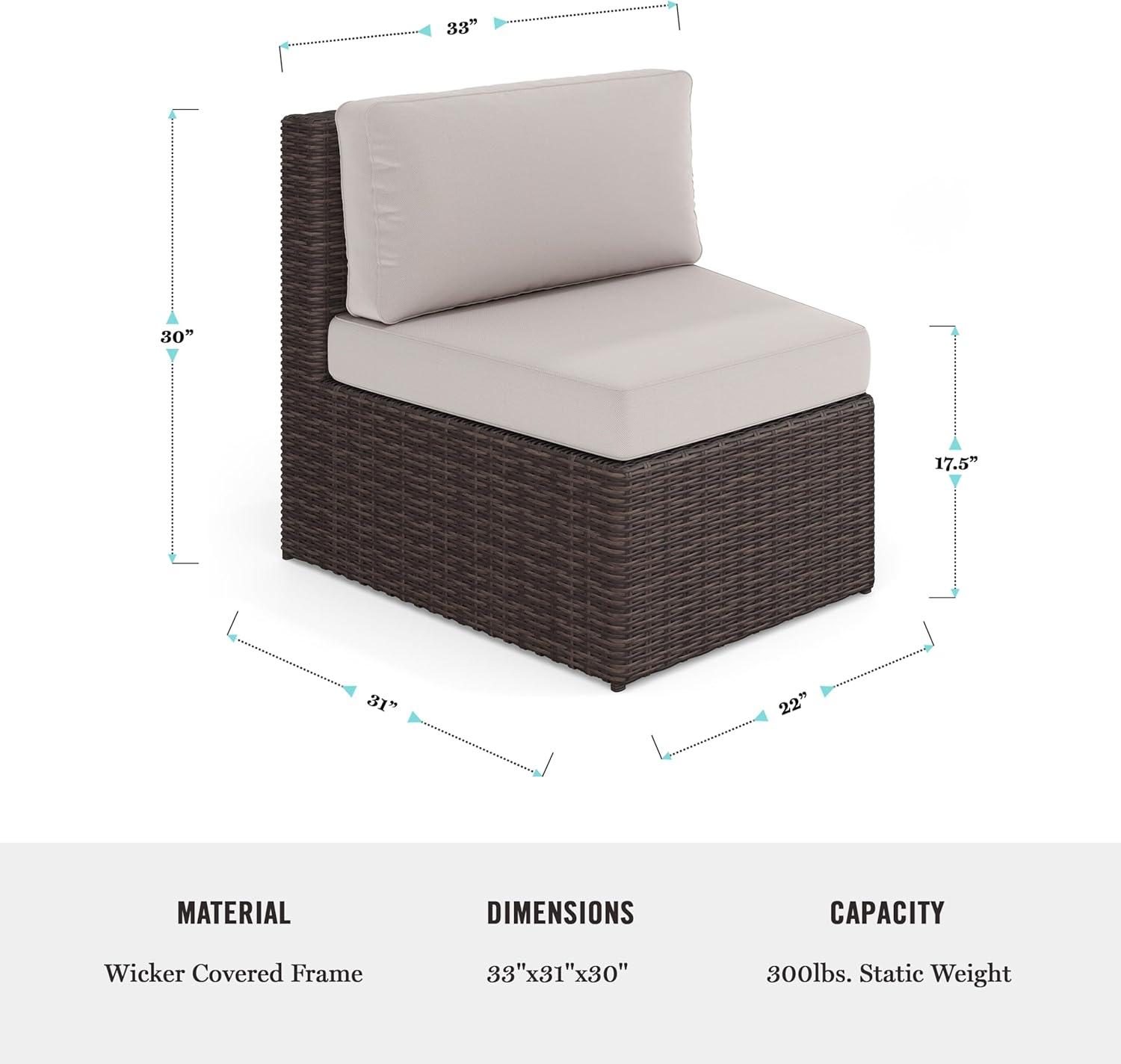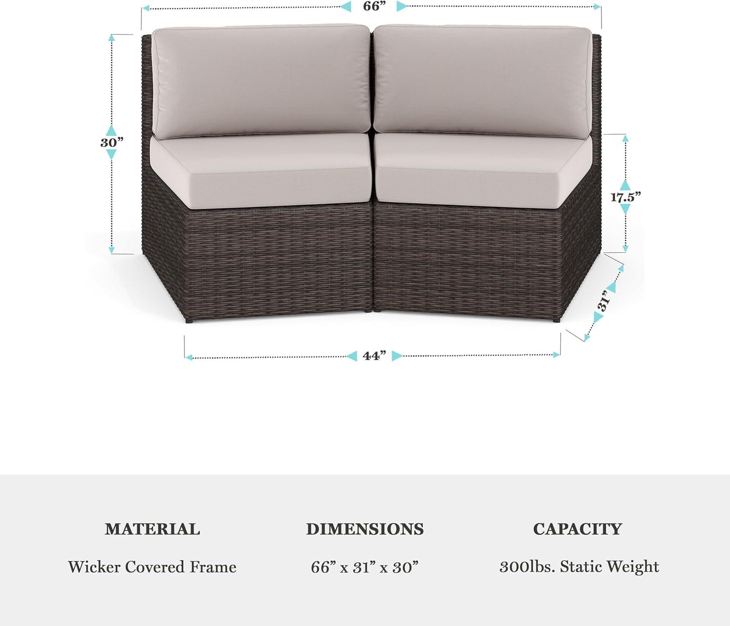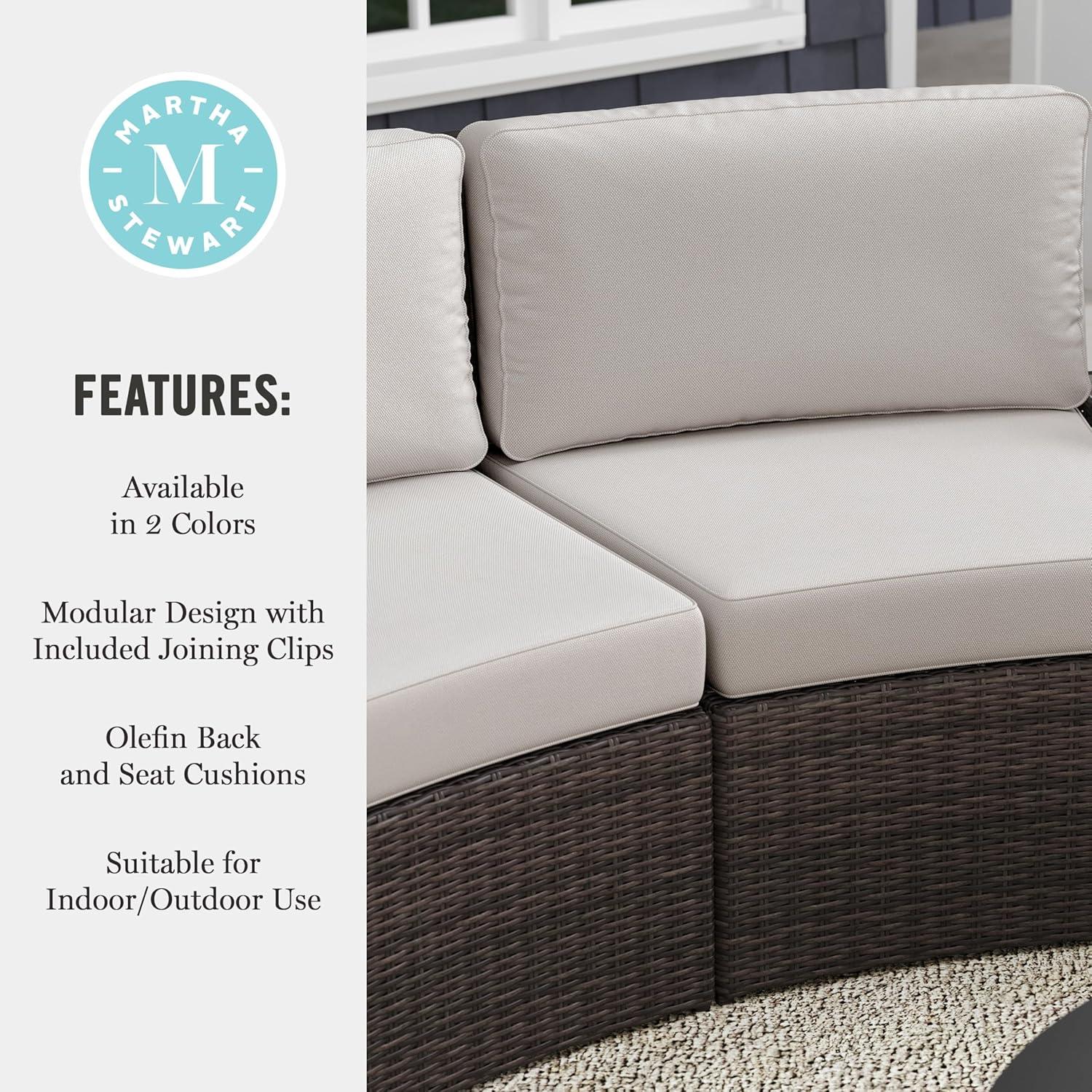Refresh your patio space with the chic style and cozy comfort of this Martha Stewart Bedford Modular Patio Curved Sectional Sofa Seat. Generously padded and sturdily built, this versatile patio seat is ideal for reading al fresco, enjoying cocktails with friends, or simply relaxing. Featuring a 4.5 thick all-weather seat cushion and luxurious back cushion, this wicker seat will cradle you in comfort while you make the most of sunny days or starlit evenings. While suitable as a standalone piece, you can purchase additional modular sectional pieces that secure easily with the included clips for a personalized configuration. Part of our Bedford collection, this seat pairs wonderfully with the coordinating pieces allowing you to craft a custom collection that fits your indoor-outdoor needs. Setup consists of simply placing the cushions while upkeep is just as easy.