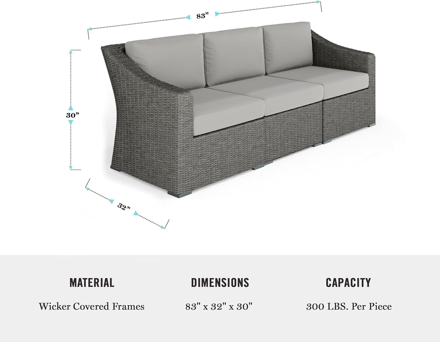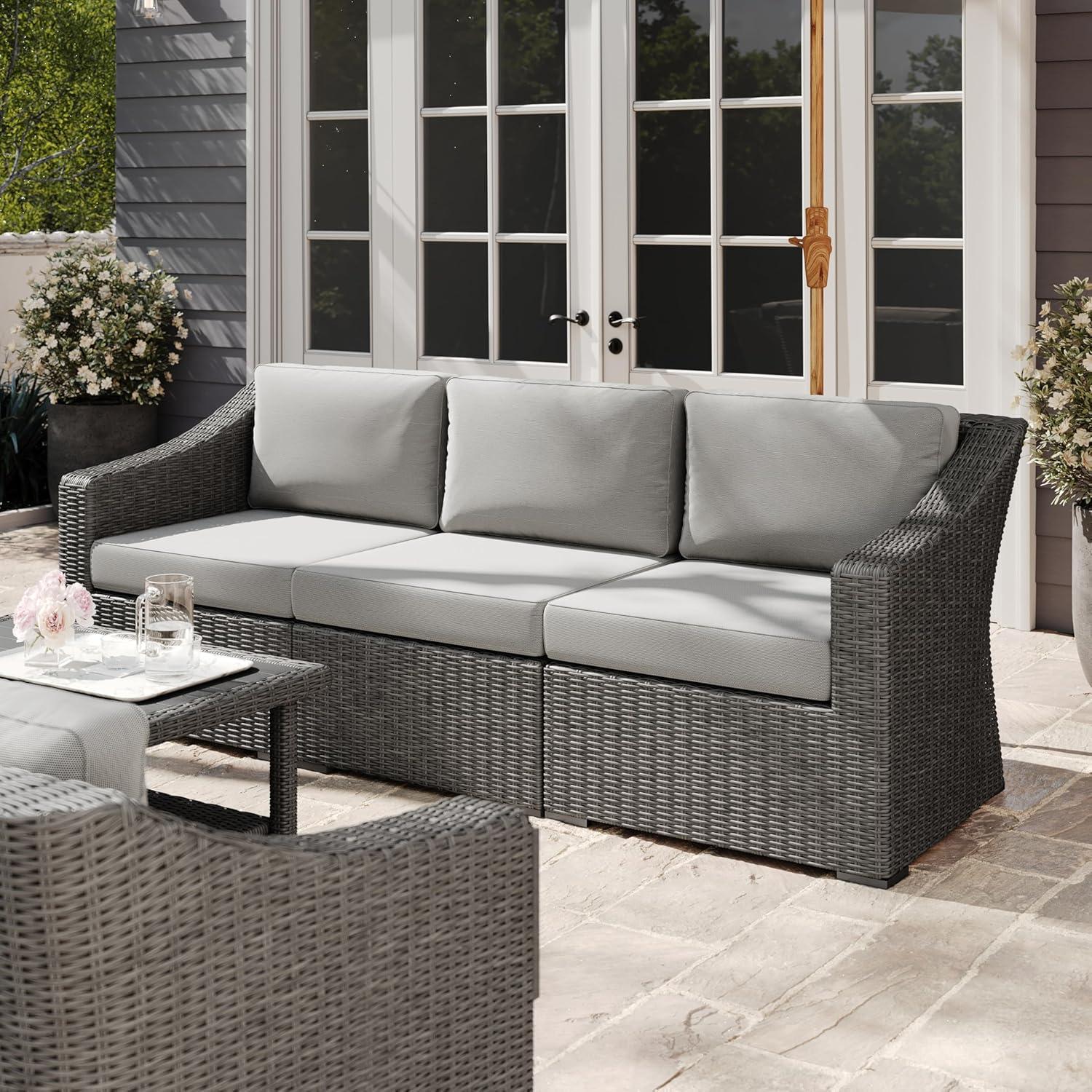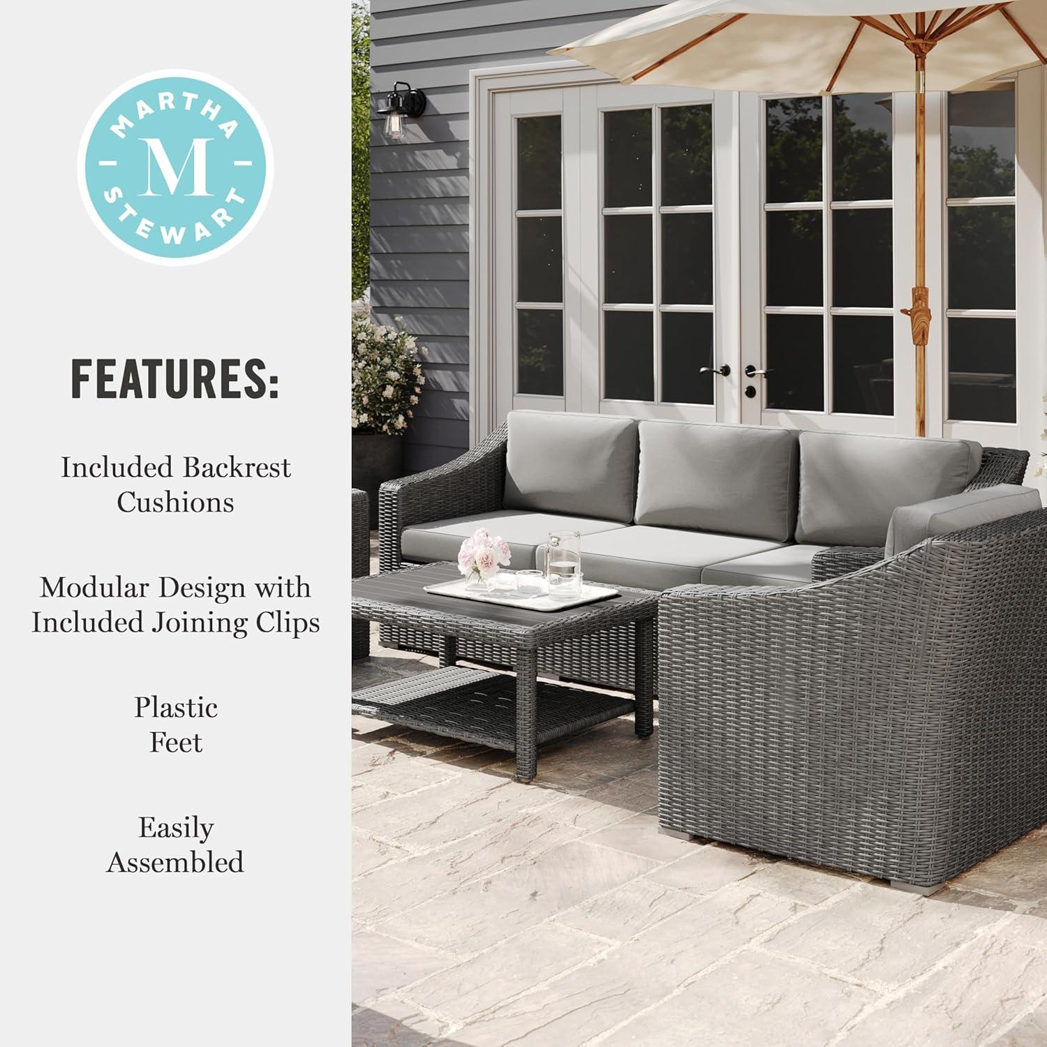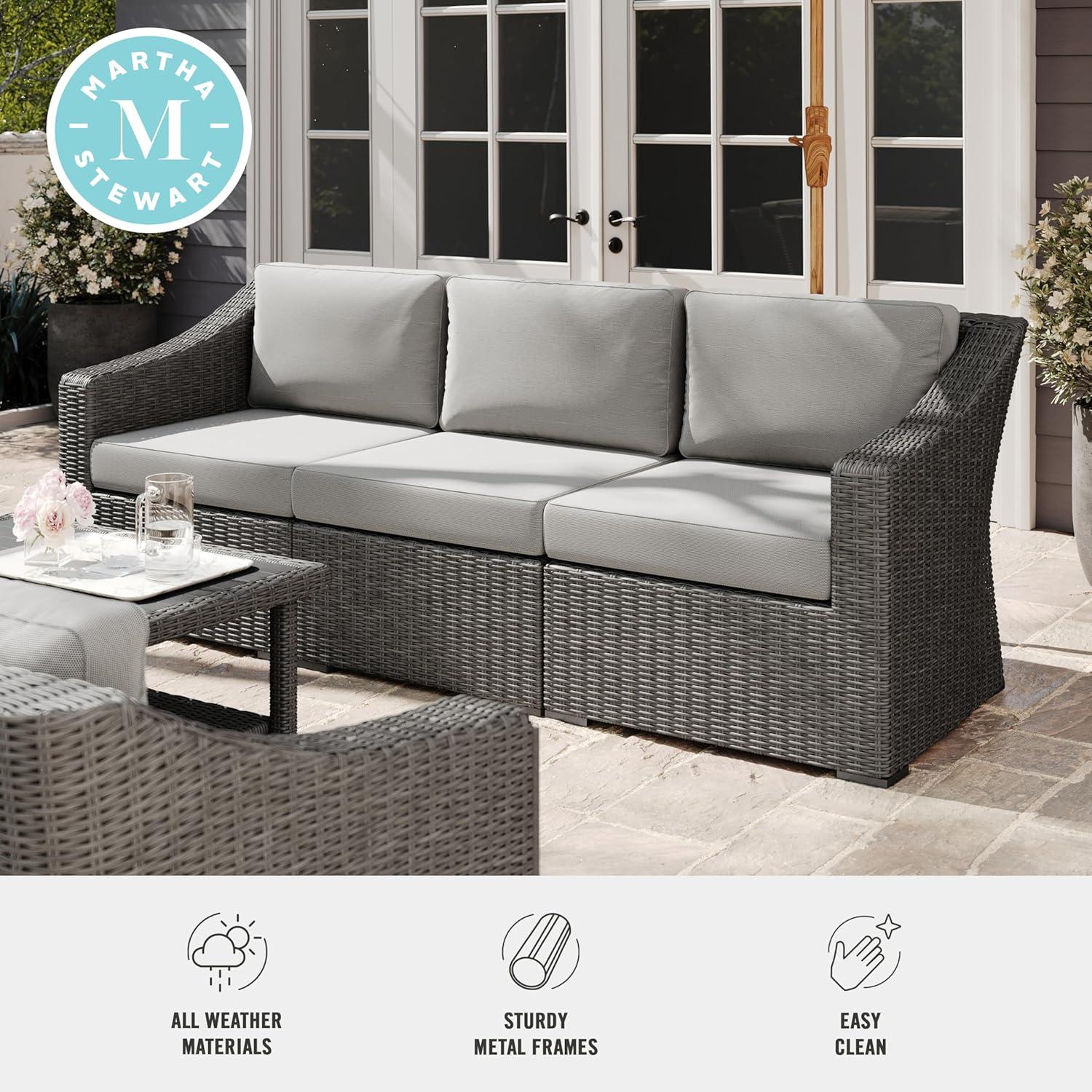 Refresh your patio space with the chic style and cozy comfort of this Martha Stewart Bedford Modular Patio Sofa. Generously padded and sturdily built, this versatile patio sofa seats three and is ideal for reading al fresco, enjoying cocktails with friends, or simply relaxing. Graced with 4.5 thick all-weather seat cushions, luxurious back cushions, and integrated armrests, this wicker sofa will cradle you in comfort while you make the most of sunny days or starlit evenings. While suitable as a standalone piece, you can purchase additional modular center and corner seats that secure easily with the included clips for a personalized configuration. Part of our Bedford collection, this sofa pairs wonderfully with the coordinating pieces allowing you to craft a custom collection that fits your entertaining needs. Setup is simple with tools included and step-by-step instructions while upkeep is just as easy.
