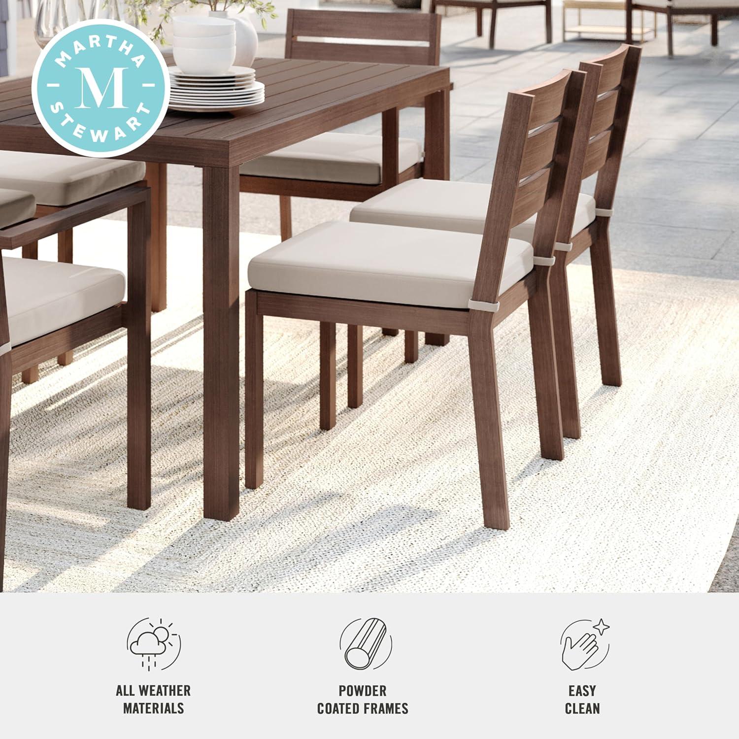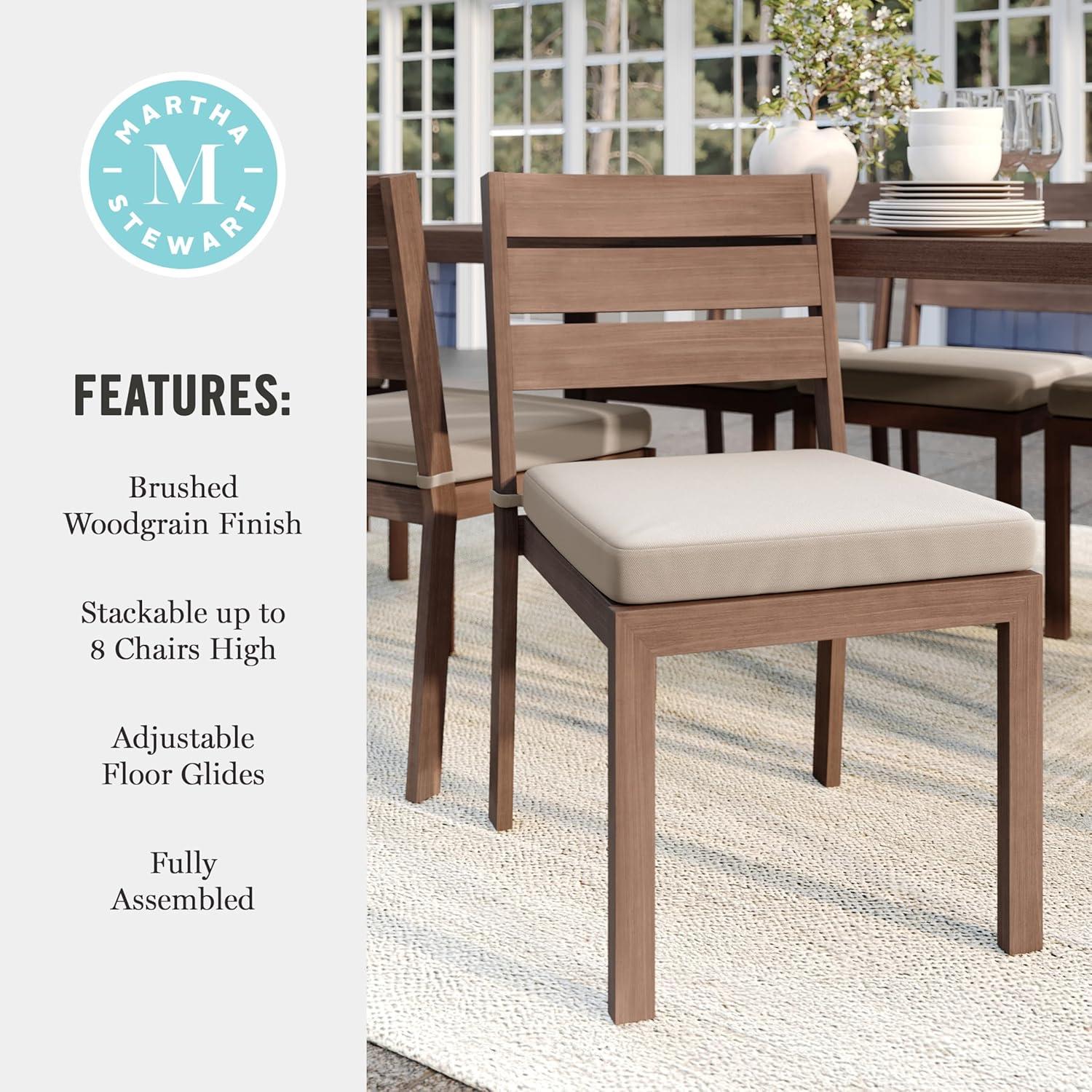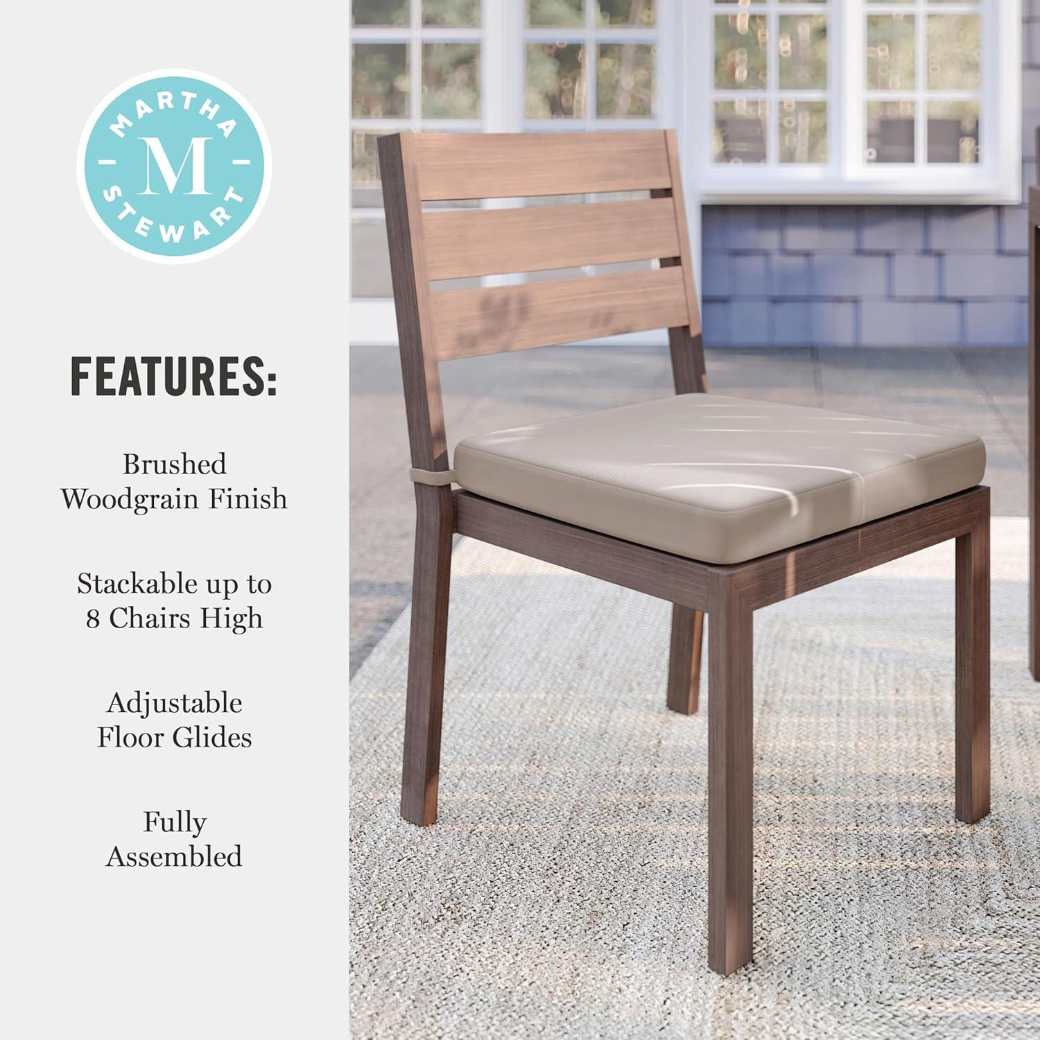 Elevate your indoor-outdoor sanctuary with the set of two Martha Stewart Bedford Patio Side Dining Chairs. Masterfully crafted with durable, rustproof aluminum frames in a beautiful hand-brushed woodgrain finish, these pieces lend elegance to any occasion. All-weather materials and a recommended stack quantity up to eight chairs high deliver peace of mind and welcome convenience by making it easy to store multiple chairs and save space when not in use. The addition of 2.5 thick seat cushions grant gracefully comfortable seating to pair with your morning coffee or a favorite novel. Part of our Bedford collection, these armless chairs pair wonderfully with the coordinating armchairs, accent chairs, barstools, and dining tables, perfect for crafting a custom collection that fits your entertaining needs. Arriving conveniently ready for use and requiring only minimal maintenance, these dining chairs are a must have for everyday use as well as special occasions.