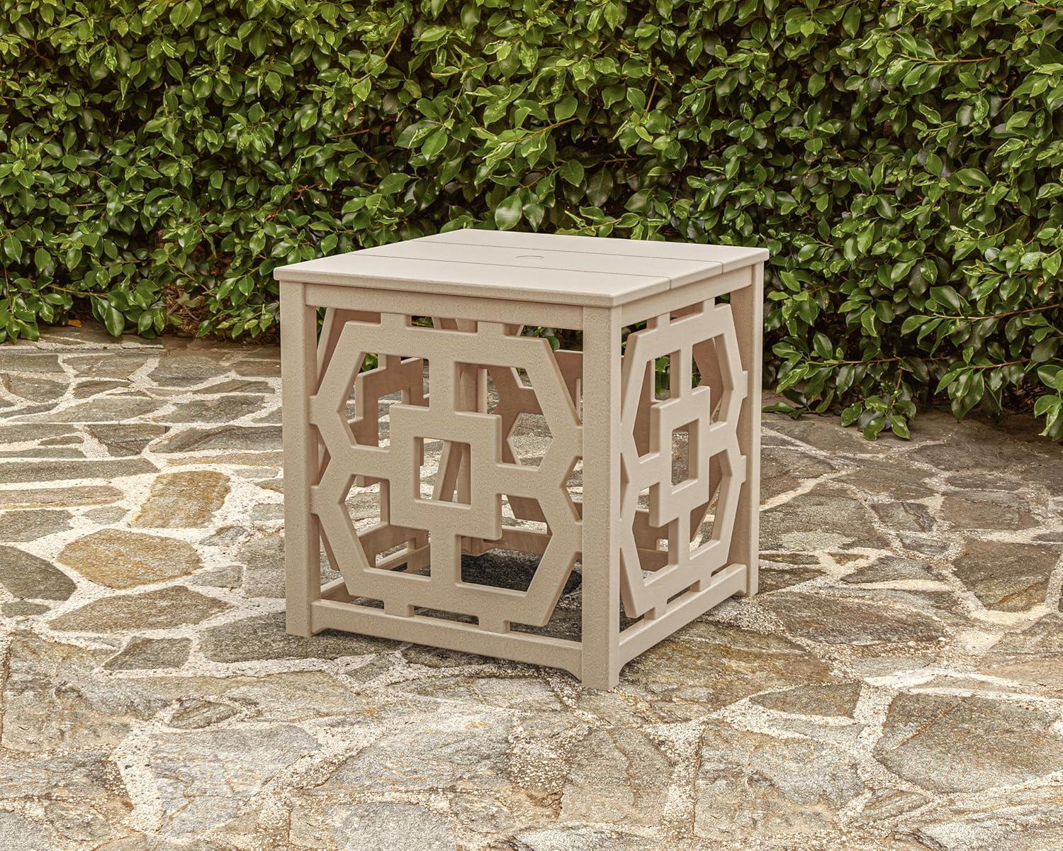 The Martha Stewart by POLYWOOD Chinoiserie Umbrella Stand Accent Table celebrates form and (multi)function. Designed with an umbrella hole, you can serve canapés and cocktails under an open sky or create a safe haven from any natural elements. The durable frame and decorative latticework are crafted with the utmost attention to detail, promising a piece you'll cherish through the seasons.