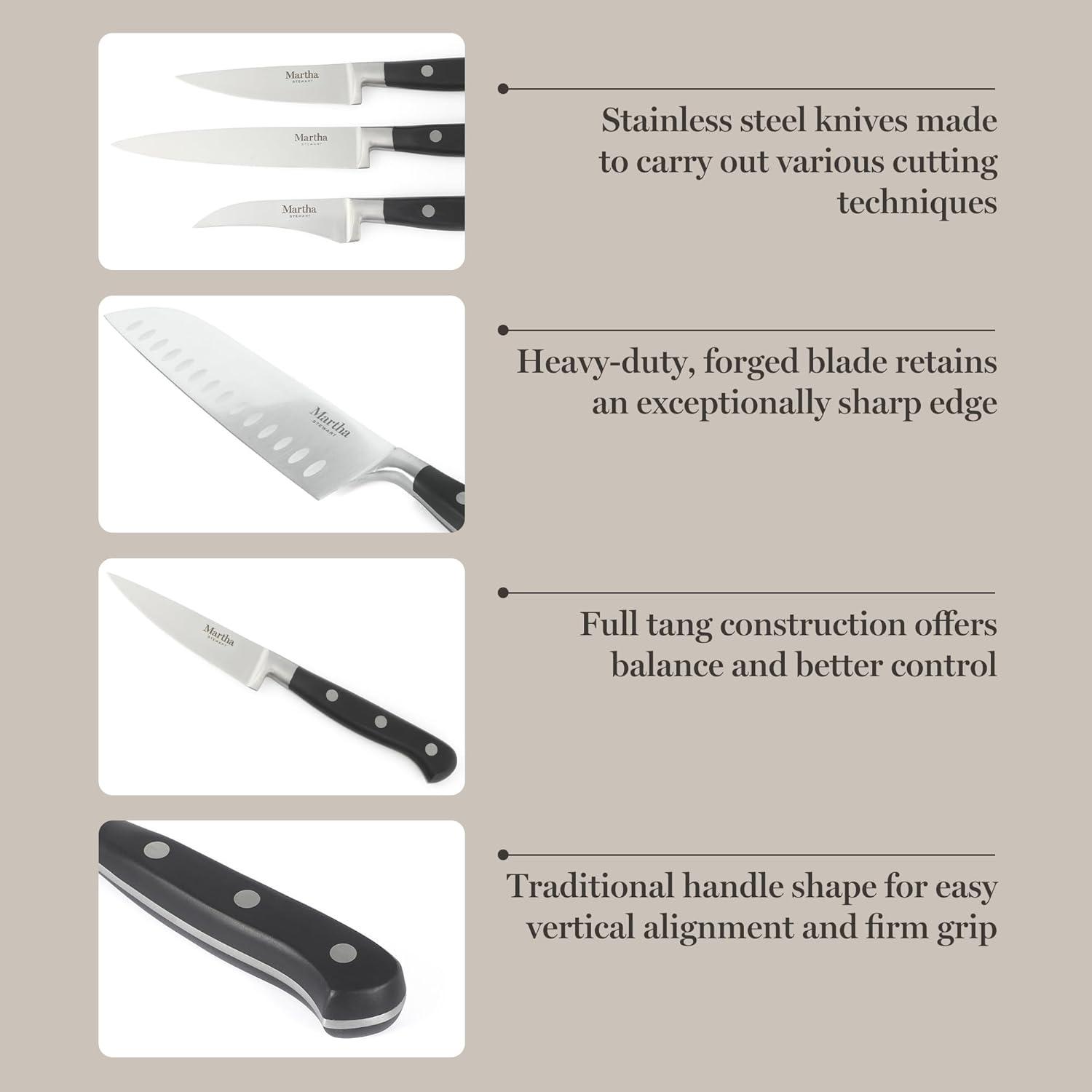 As the most important tools in the kitchen, high-quality and well-maintained knives help keep home chefs look sharp as they navigate through prep work every day. The Carverton Stainless Steel Cutlery Collection from Martha Stewart offers a selection of fundamental knives for any cutting task, Forged for everyday use, each knife blade features high-carbon stainless steel construction to resist wear and tear and maintain an exceptionally sharp edge, Secured by three stainless steel rivets, the full-tang blade seamlessly extends to the traditionally shaped handle for a firm and controlled grip. The knife's classic, straight-top handle helps in maintaining the blade's vertical alignment and provides the right amount of cutting comfort when chopping, mincing, slicing and peeling, Hand wash only.