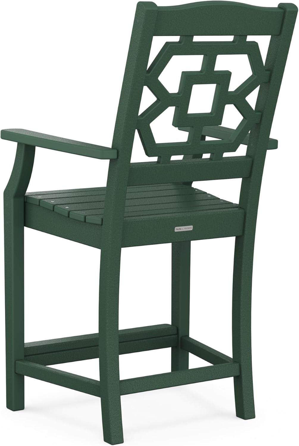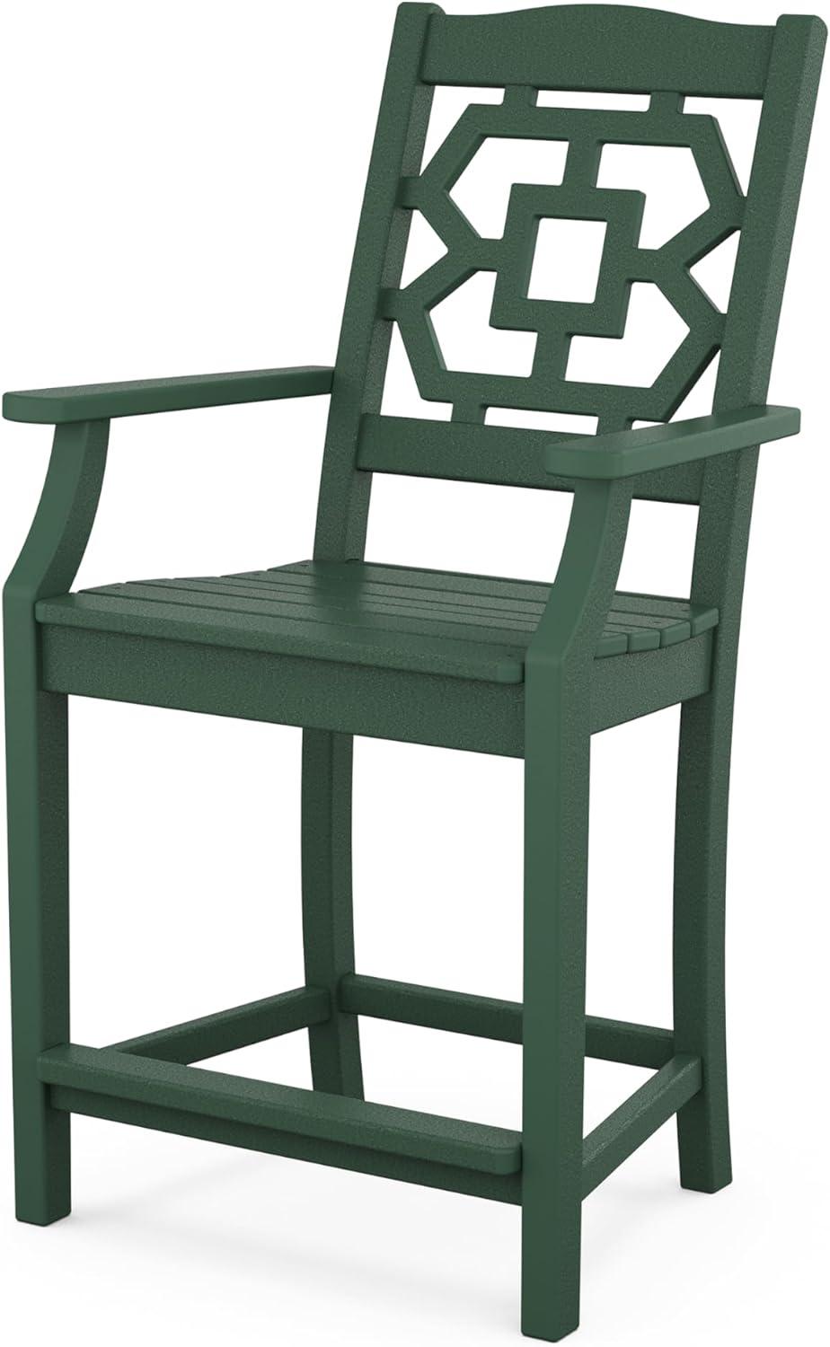 Where everyone feels at home, alfresco. From POLYWOOD and created in partnership with Martha Stewart, this heirloom-worthy collection charms in any outdoor space. The Chinoiserie 3-Piece Farmhouse Counter Set graces everyday meals with seating that features intricate latticework, reclined backs, contoured seats, and armrests””perfect for lingering over after-dinner decafs and conversation. Set includes (2) Chinoiserie Counter Arm Chairs and (1) 24″ Round Farmhouse Counter Bistro Table.