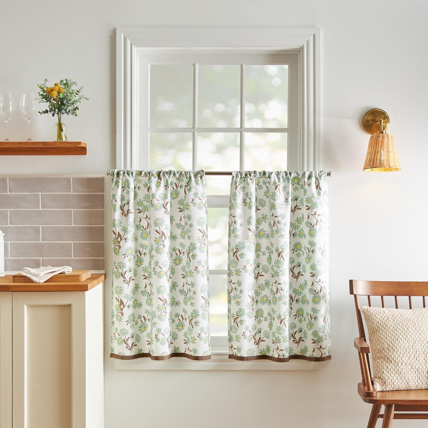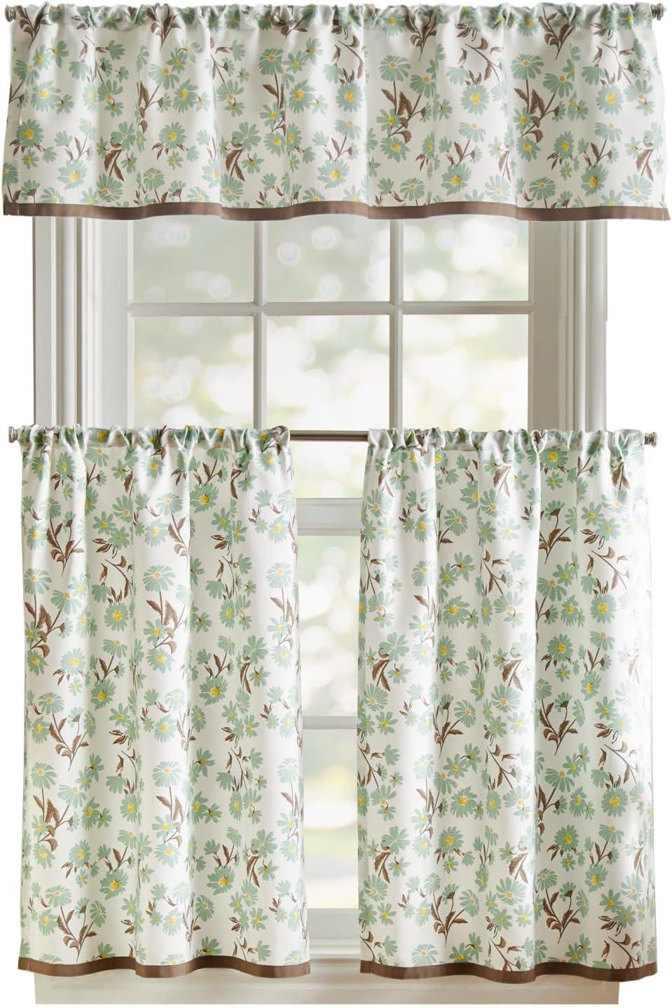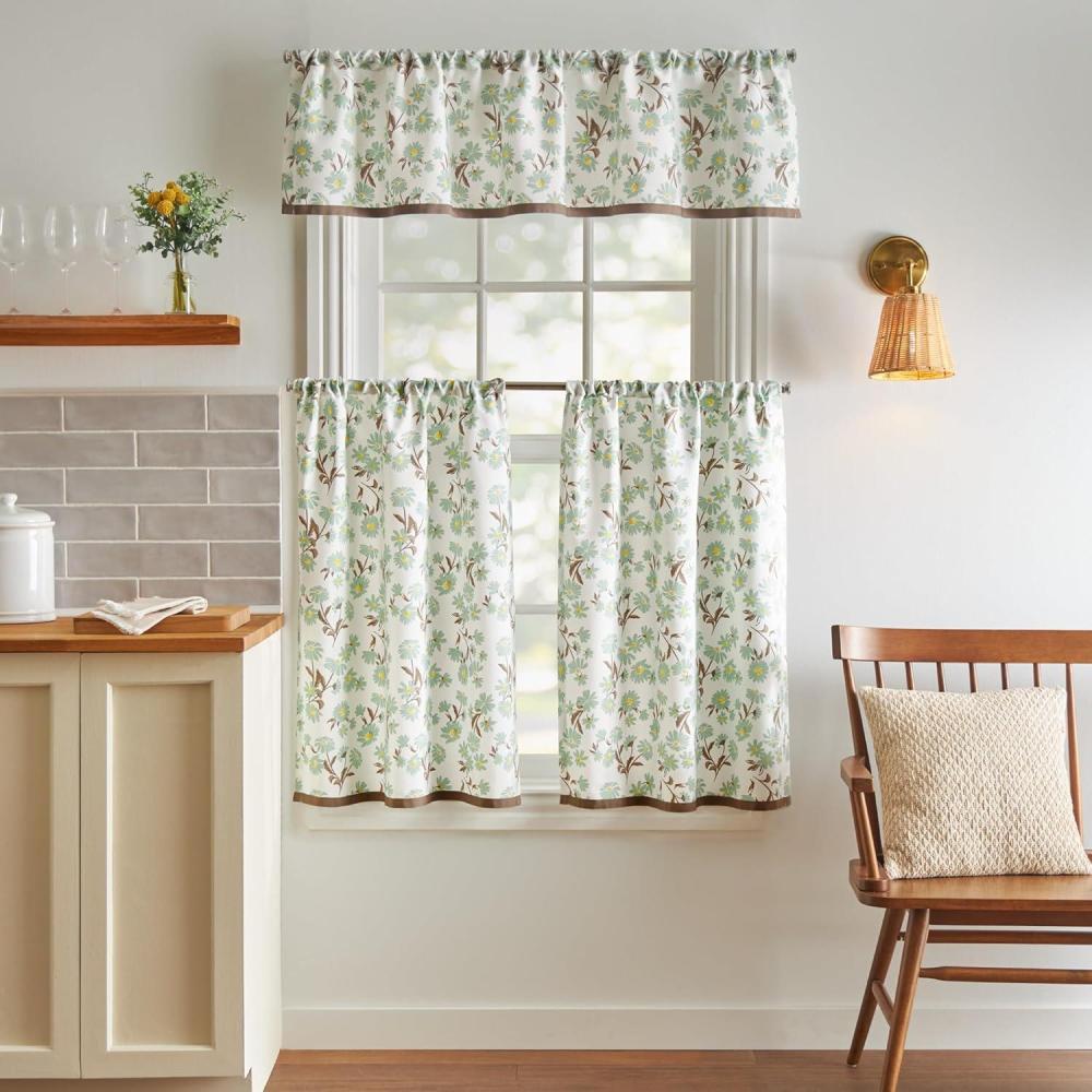 KITCHEN CURTAINS 3 piece tier and valance set; Rod pocket curtains from Martha Stewart's Skylands Traditional and Elegant Window Collection; Valance and tier pair feature daisy florals printed in a mint green; Coordinated set has a grosgrain ribbon trim for added contrast and charm; Unlined curtains softly filter sunlight; Creates a light and airy look