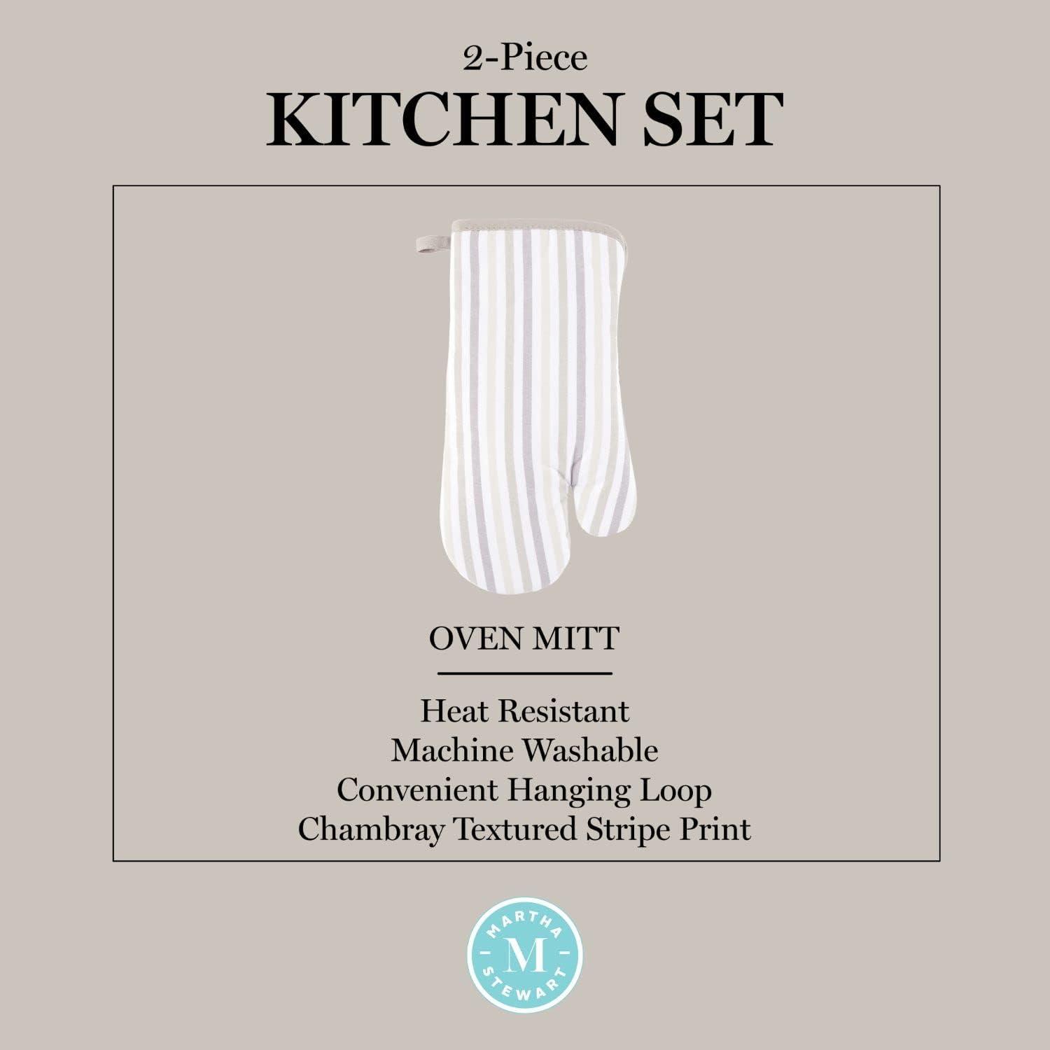 Add style and function to your kitchen décor with the Martha Stewart Daisy Stripe Oven Mitt 2-Pack Set. Made of 100% Cotton, these oven mitts offer a beautiful combination of comfort and insulation. This chambray textured, printed oven mitt set includes two oven mitts that each measure 7 inches wide by 13 inches long for easy on and off use. They are heat resistant and will shield your hands from the heat while cooking and baking. Includes a convenient hanging loop for display or easy storage. Machine washable for easy cleaning.