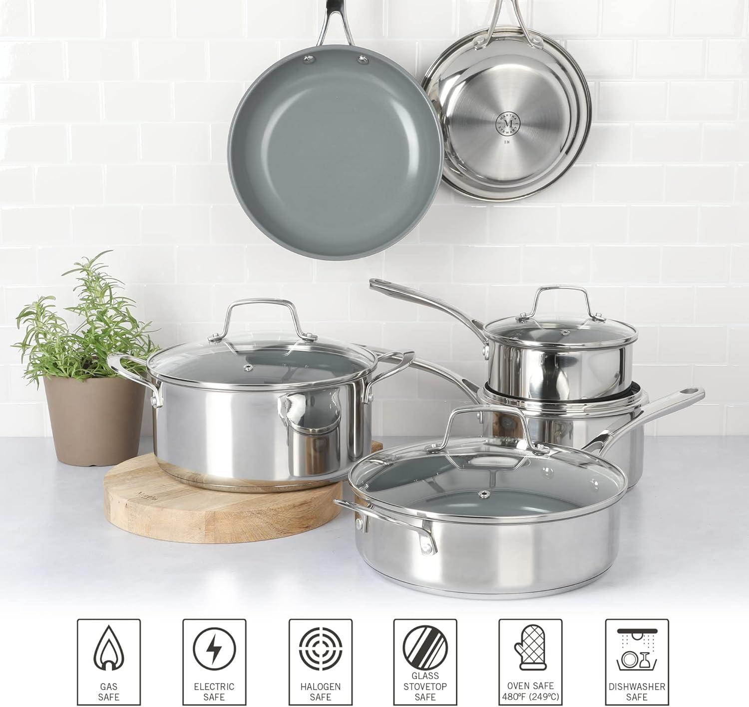 Master delicious, chef-quality meals at home with the Delaroux 10-piece Stainless Steel Ceramic Interior Cookware Collection from Martha Stewart. Home cooks, both newbies and veterans alike, are treated to a lustrous set of pots and pans all constructed from 18/8 stainless steel for excellent durability, impressive elegance, and reliable performance. Each piece has a base-to-rim aluminum layer that distributes heat efficiently to eliminate hot spots and preventing uneven culinary results. Made without PFOA anad PTFE, the ceramic nonstick interior allows less oil and fat for healthier but still flavorful cooking, promotes smooth food release and easy cleanup. Stainless steel rivets securely attach the handles to each cookware for strength and for a confident grip. Take pleasure in serving meals from oven to table using these sturdy handles when lifting and transferring. The saucepans, sauté pan, and Dutch oven come with fitted, vented lids made from durable tempered glass. The lids help monitor cooking progress and the vents allow steam to escape, preventing boil-overs and messes. Built for style and function, this collection is safe to use on gas, electric, ceramic, halogen, and induction stovetops. The pots and pans are oven safe up to 500°F, while the glass lids are safe up to 350°F. Dishwasher safe, hand wash recommended.