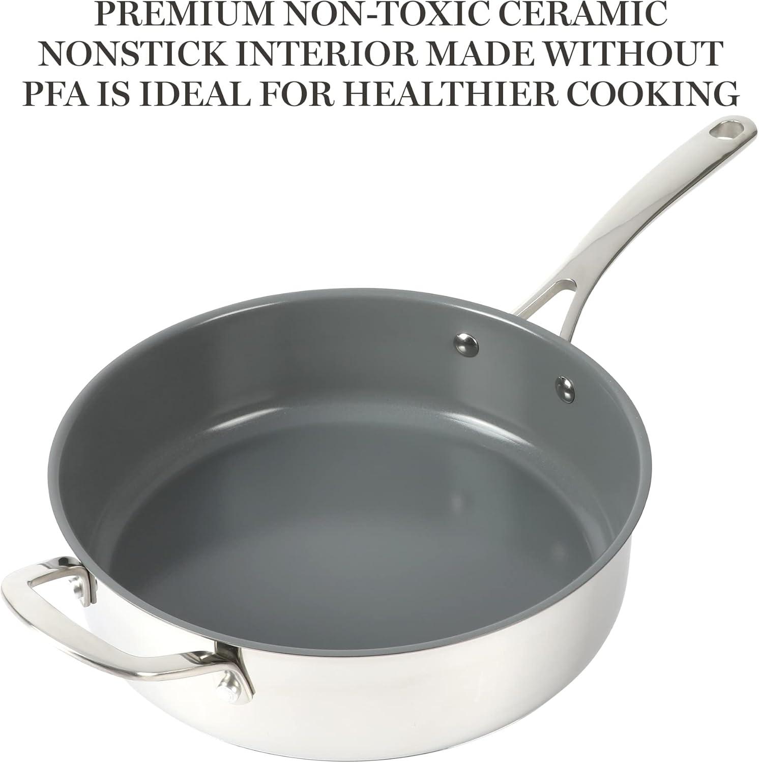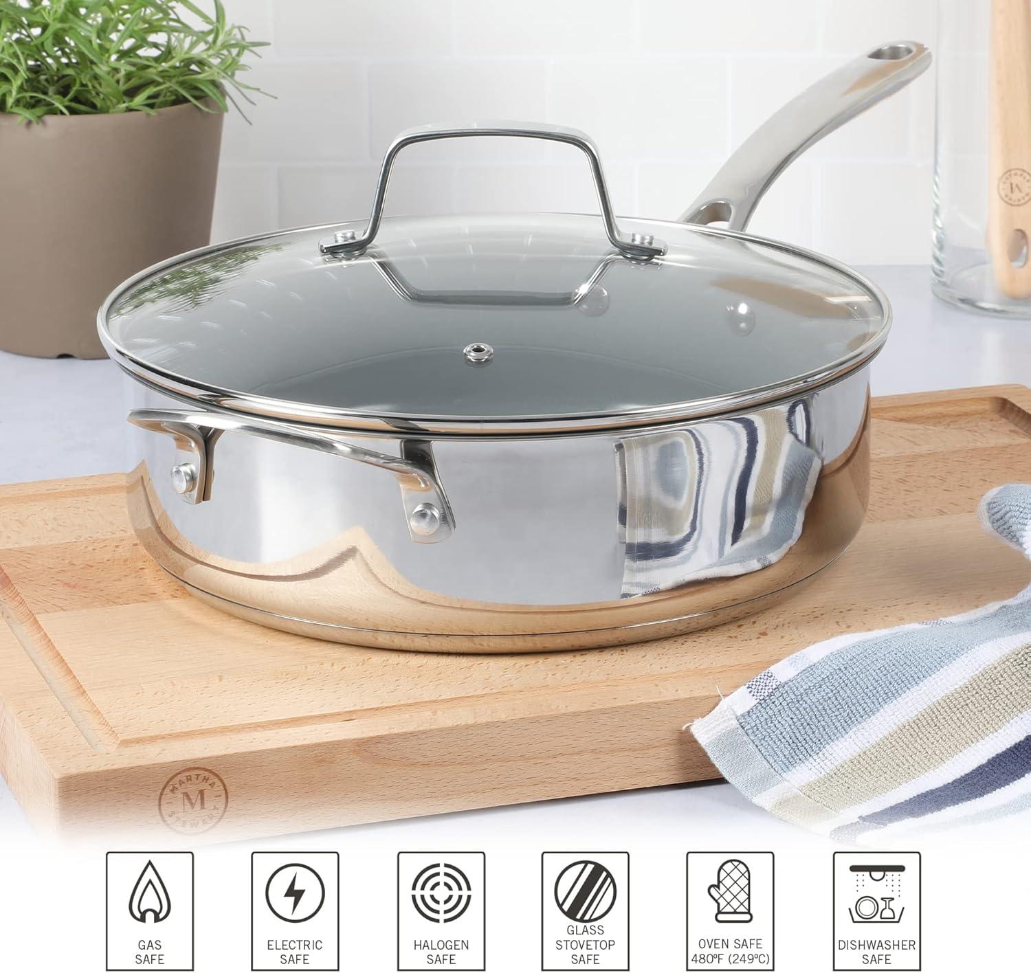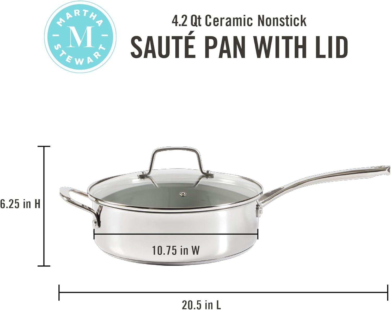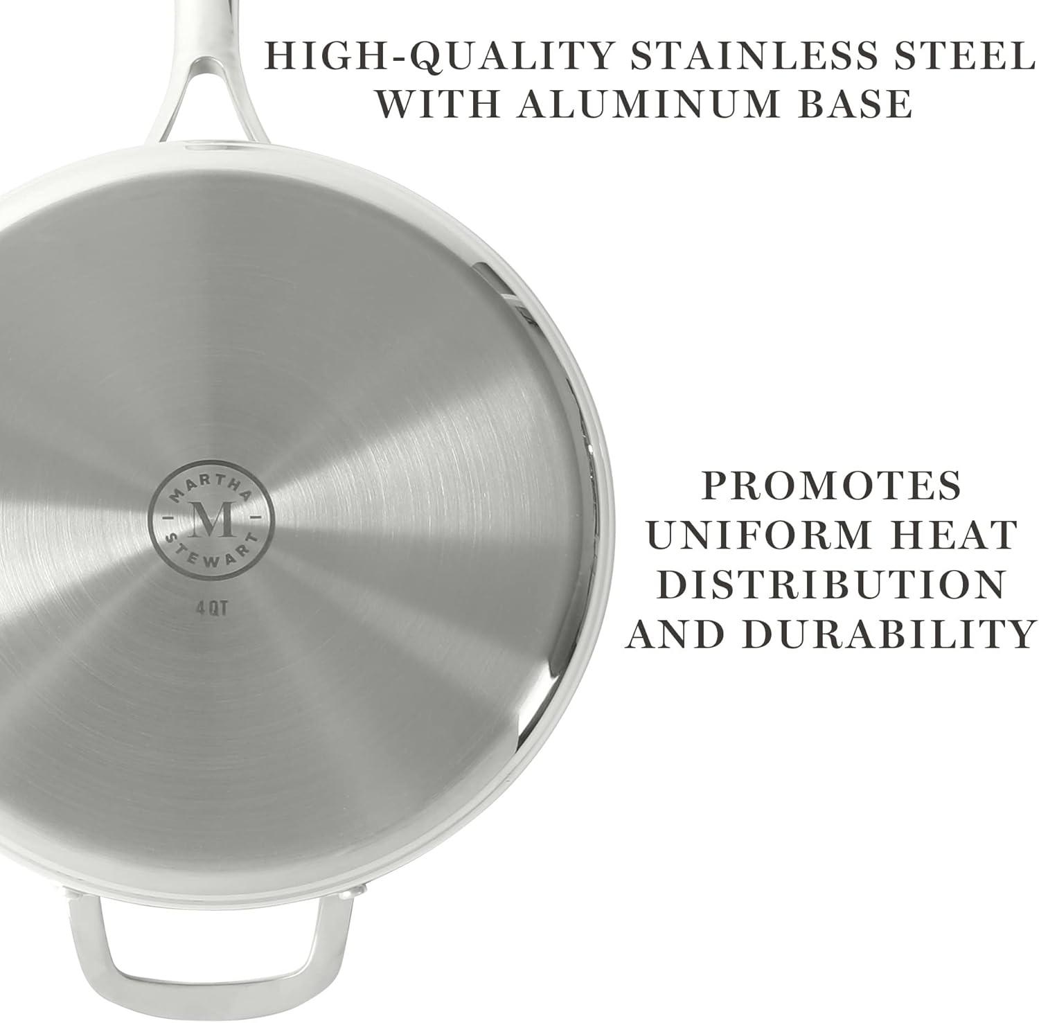 Crafted for versatility and ease of use, the Martha Stewart Delaroux 4-quart Stainless Steel Sauté Pan with Lid features tall, straight sides and a spacious interior – combining the design and function of a deep sauté pan and a skillet. Achieve the perfect sear on steaks, salmon fillets, or vegetables as the pan distributes heat evenly through its impact-bonded aluminum base. Safe to use on all stovetops, this 18/8 stainless steel pan has ergonomic, Y-shaped handles for a strong and safe grip. The tempered glass lid fits perfectly on this 18/8 stainless steel pan to lock in heat and moisture while allowing visibility to monitor cooking progress while you cook. It also has a vent to help prevent boil-overs when making one-pot pastas or braising meat. The interior measurement marks allow easy monitoring of liquids and servings. For recipes that require finishing in the oven, this pan can withstand up to 500°F (350°F with the glass lid) to cook to your desired degree of doneness. Dishwasher safe.