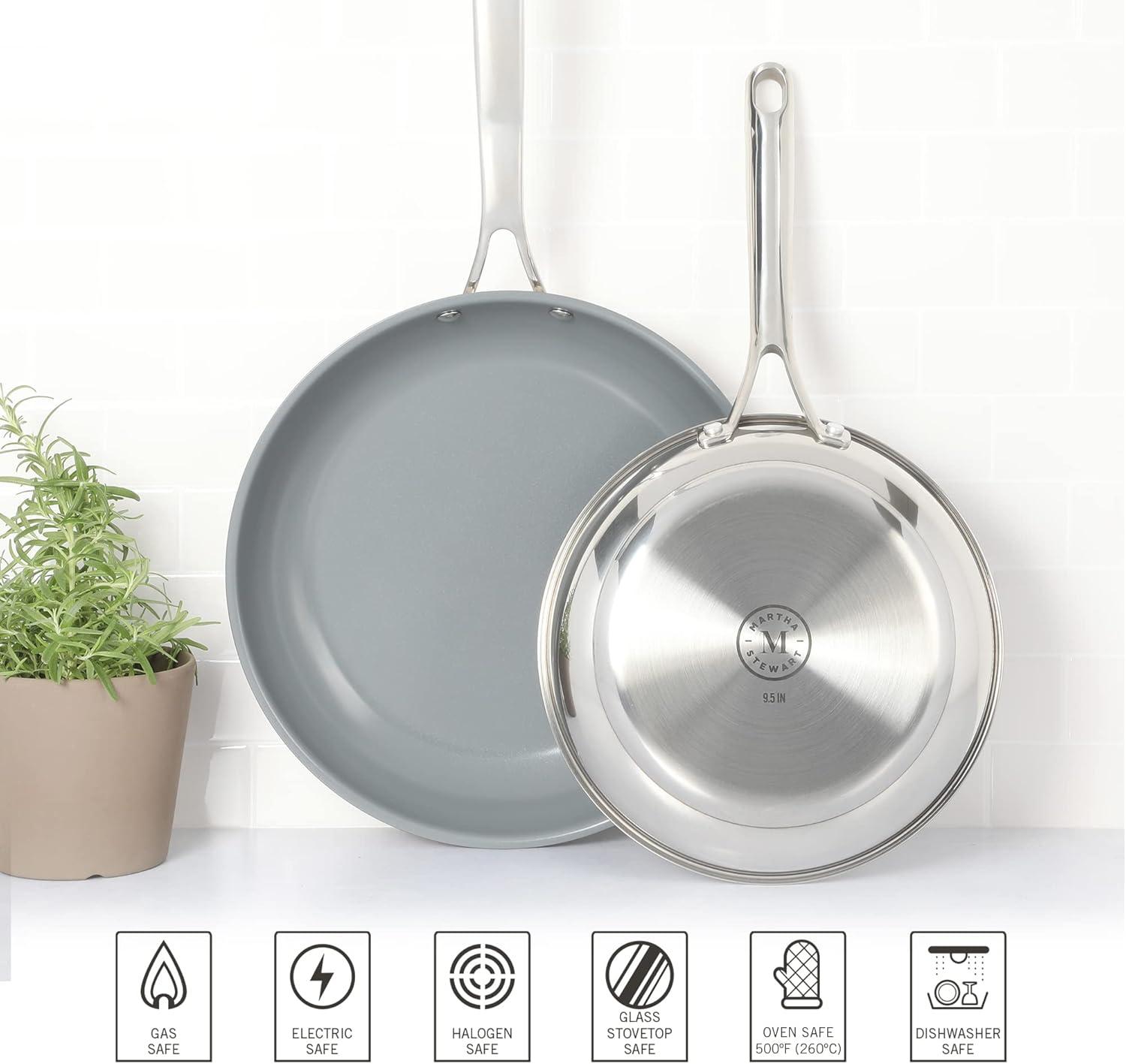 From thick cuts of meat to grilled cheese sandwiches, the Delaroux 2-piece Stainless Steel Frying Pan set prepares any recipe with culinary perfection. As the dynamic duo of everyday cooking, these 9.5-inch and 12-inch frying pans are a practical addition to any home cook's growing kitchen collection. Constructed from 18/8 stainless steel, each skillet has an impact-bonded aluminum base for even heat distribution from any kind of stovetop, including induction. With double-riveted, Y-shaped handles, lifting or transport is easy and convenient. They offer a strong and ergonomic grip and the Y-shape design helps diffuse heat. For recipes that require finishing in the oven, these frying pans can withstand up to 500°F to cook to your desired degree of doneness. Dishwasher safe.