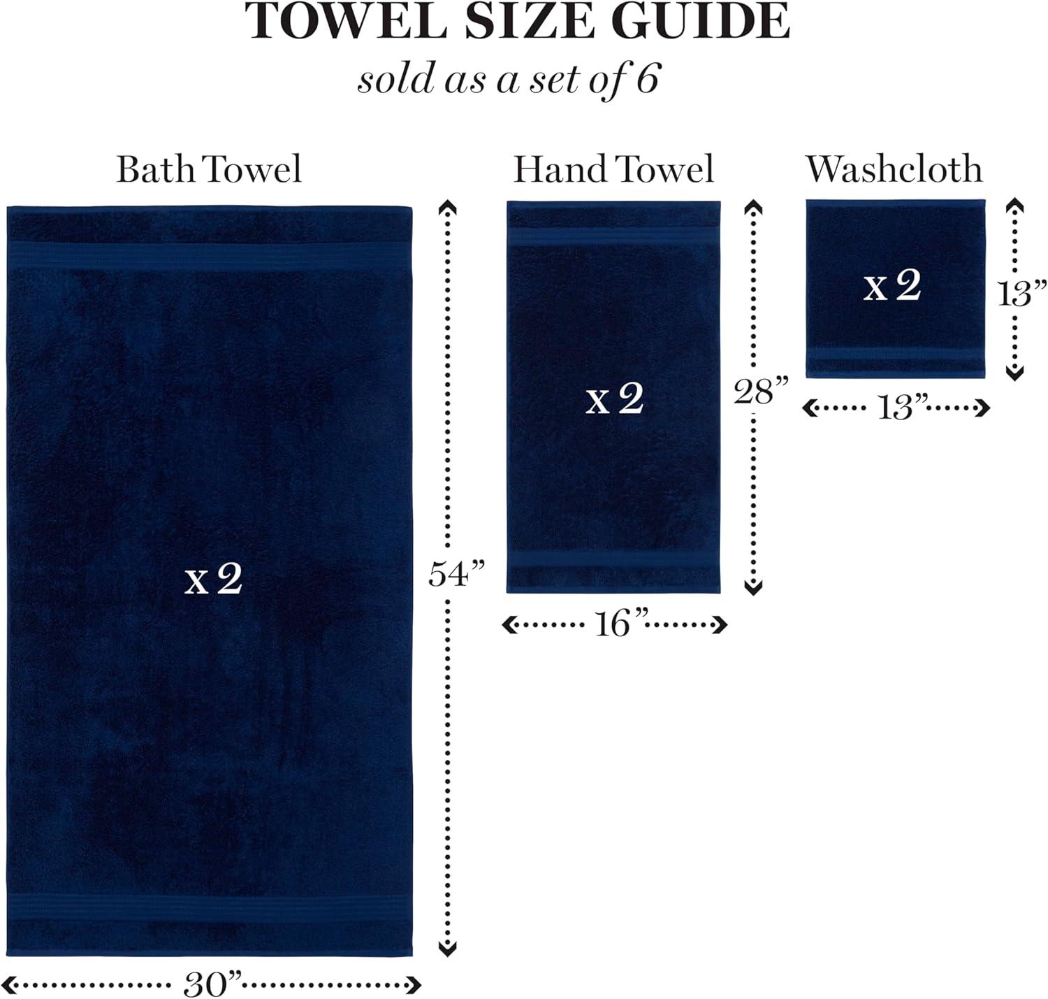 6-Piece Set Includes: 2 Bath Towels (30in x 54in), 2 Hand Towels (16in x 28in), 2 Washcloths (13in x 13in)