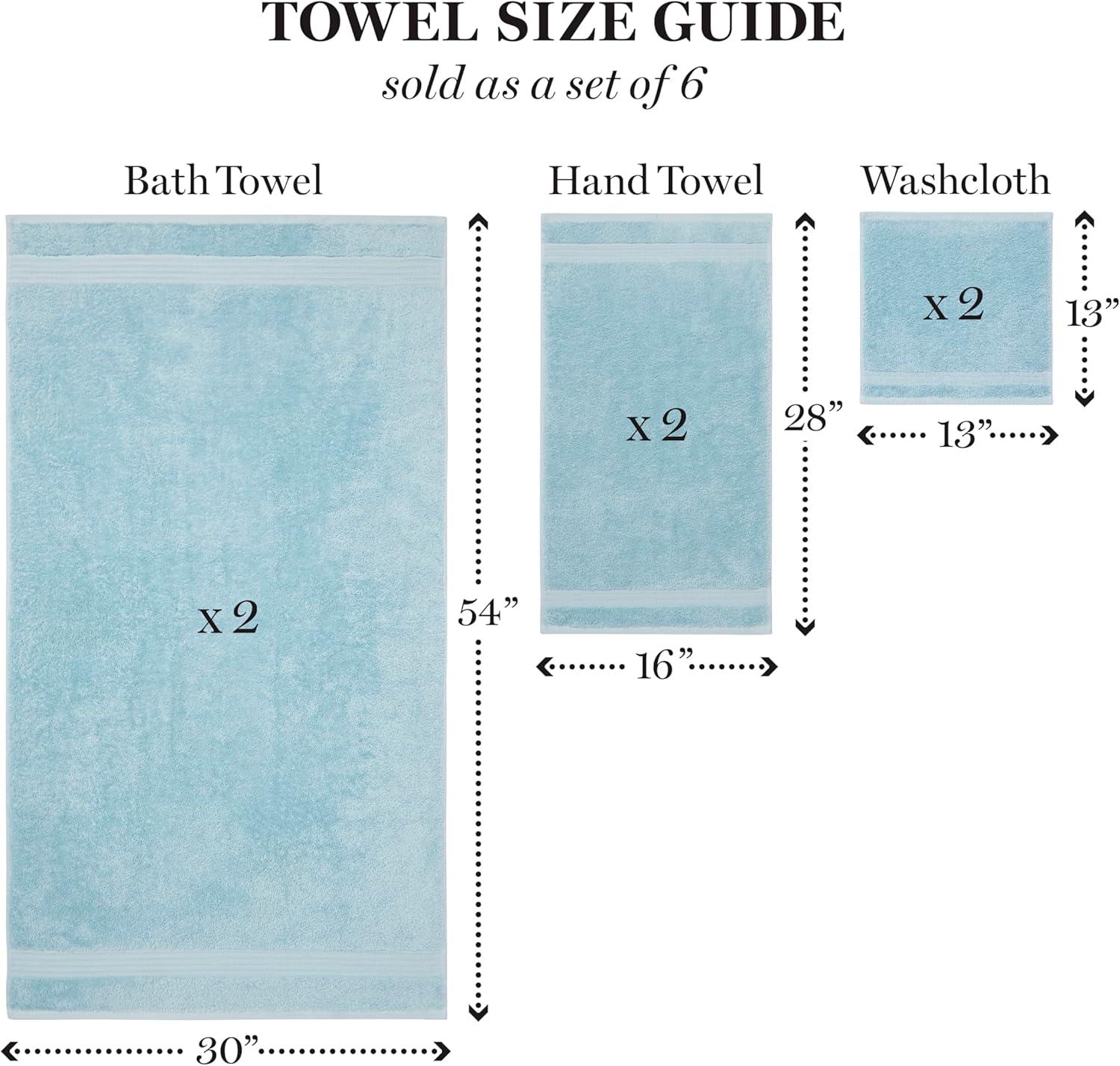 6-Piece Set Includes: 2 Bath Towels (30in x 54in), 2 Hand Towels (16in x 28in), 2 Washcloths (13in x 13in)