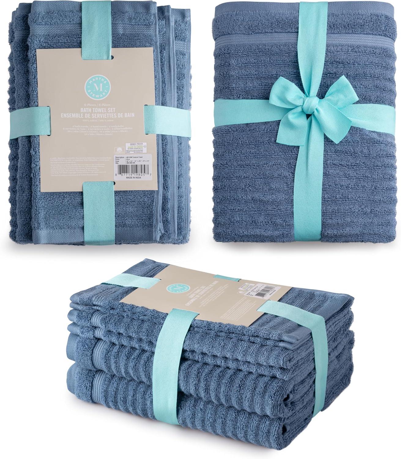 Martha Stewart Egyptian Cotton Bath Towels Set - 6 Piece, 2 Bath Towels - 2 Hand Towels - 2 Washcloths, Absorbent Bathroom Towels, Bathroom Essentials, Butter(Textured Blue)