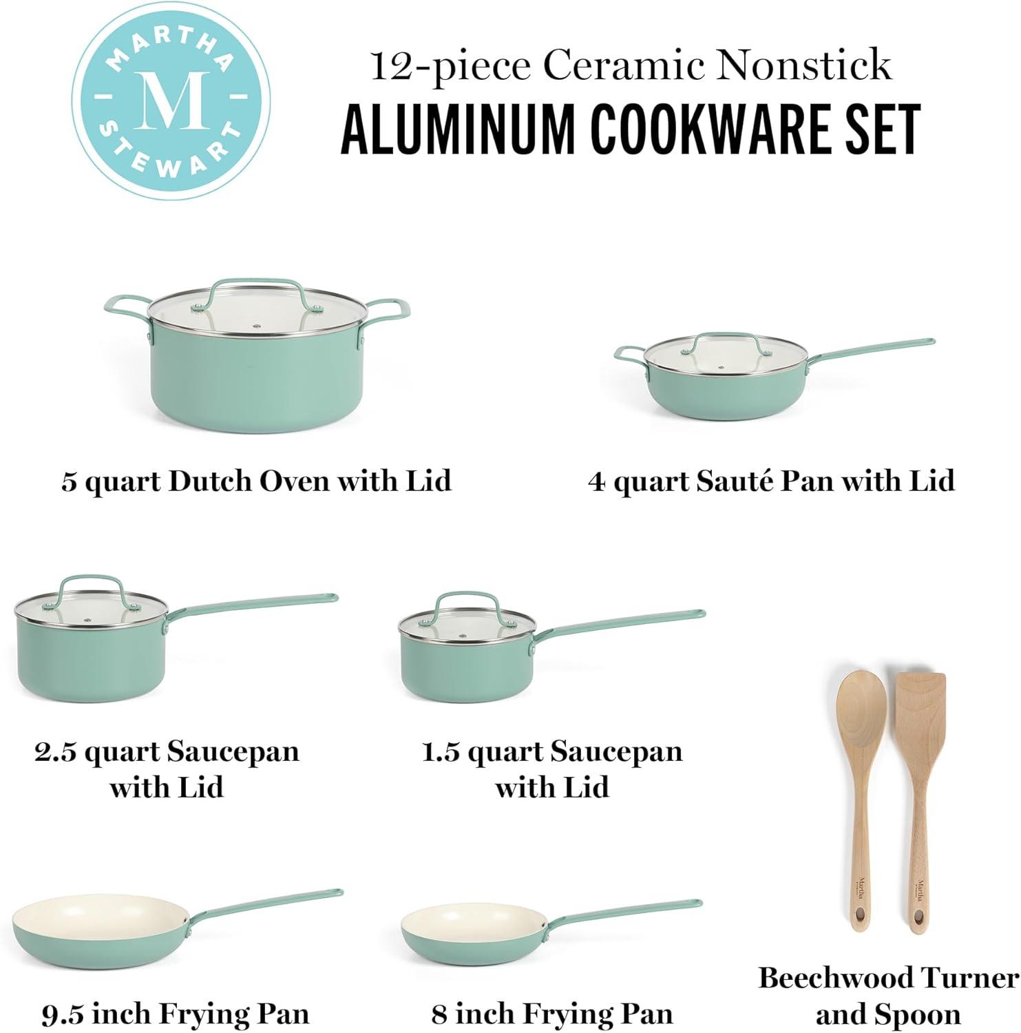Martha Stewart Emmeline Premium Nonstick PFA Free Ceramic Interior 12 Piece Heavy Gauge Enamel Aluminum Pots and Pans Cookware Set - Linen White(Teal)