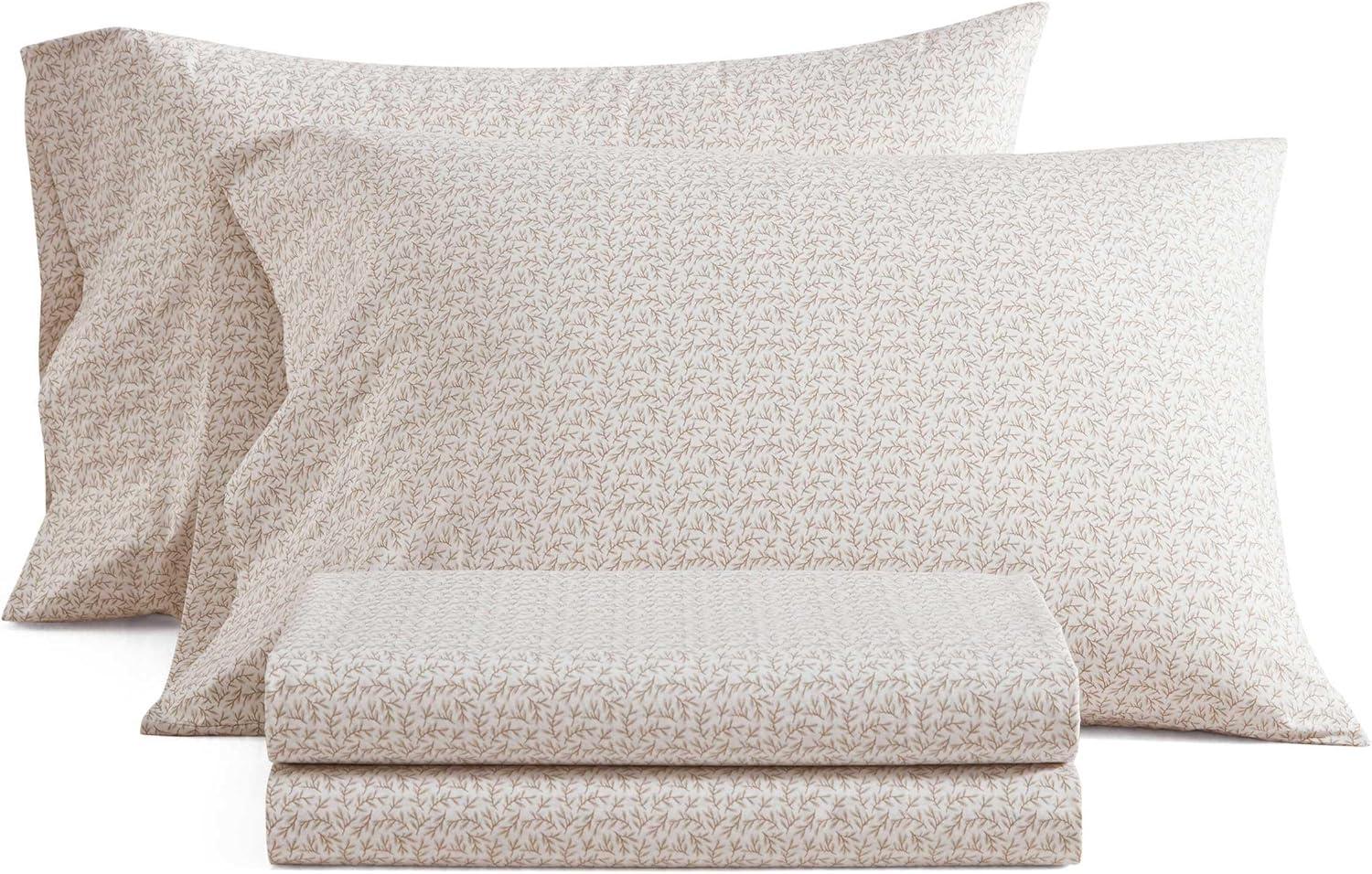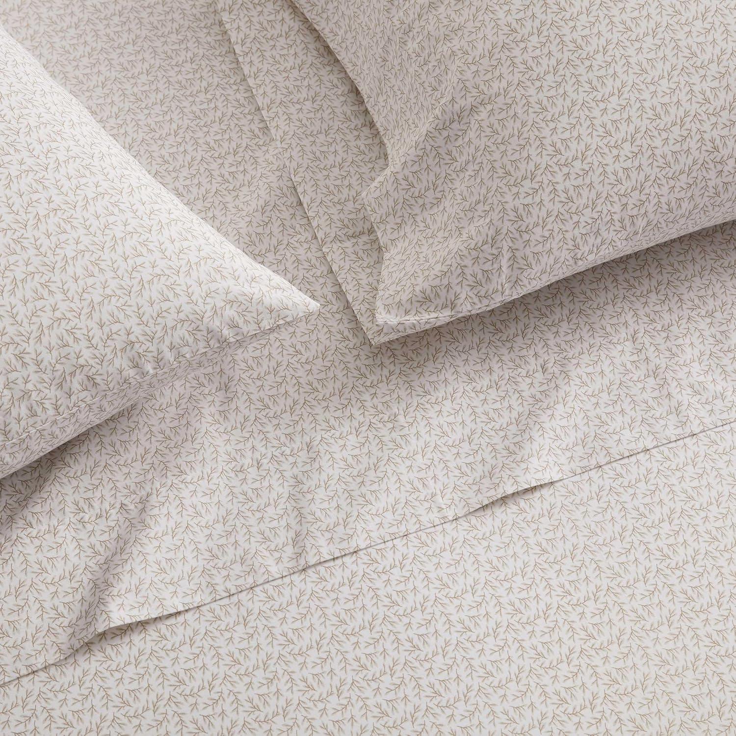 Martha Stewart - Full Size Sheets Set, Crisp & Tailored Cooling Sheets w/a Naturally Smooth Cotton Percale Lightweight Feel - Bed Sheets with Matching Pillowcases & Fitted Sheet (Floral Blue)(Leaves Beige)