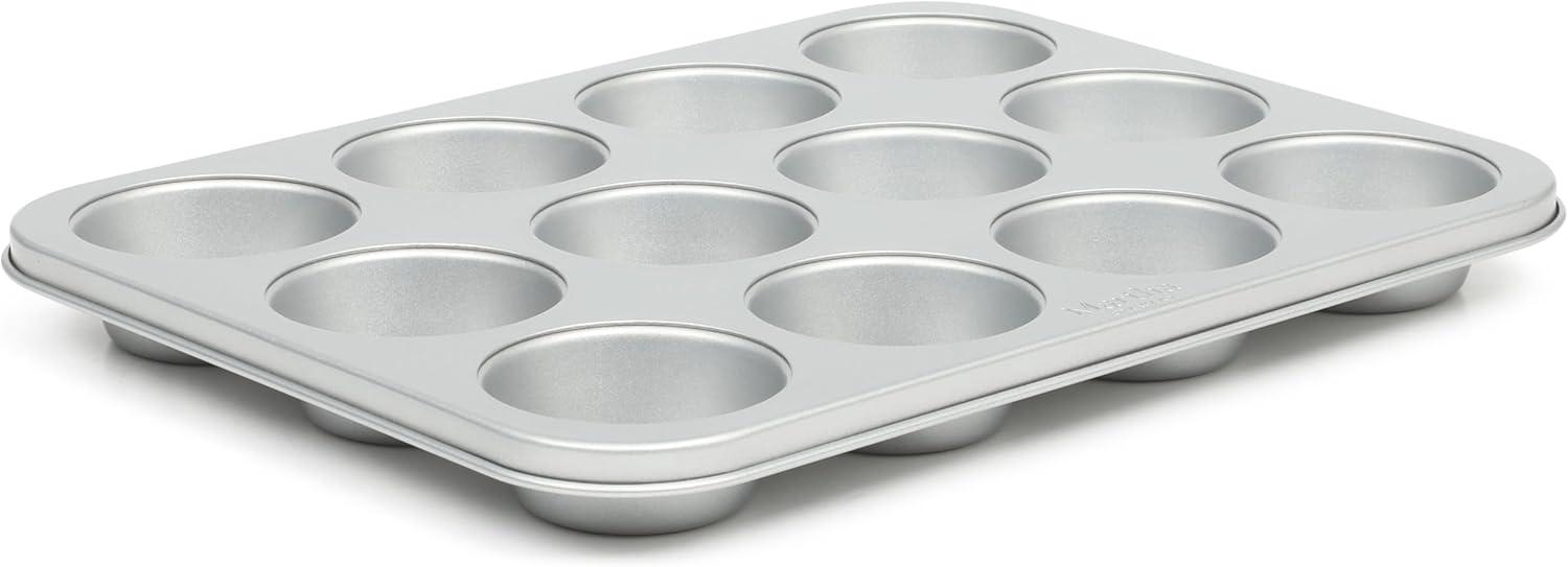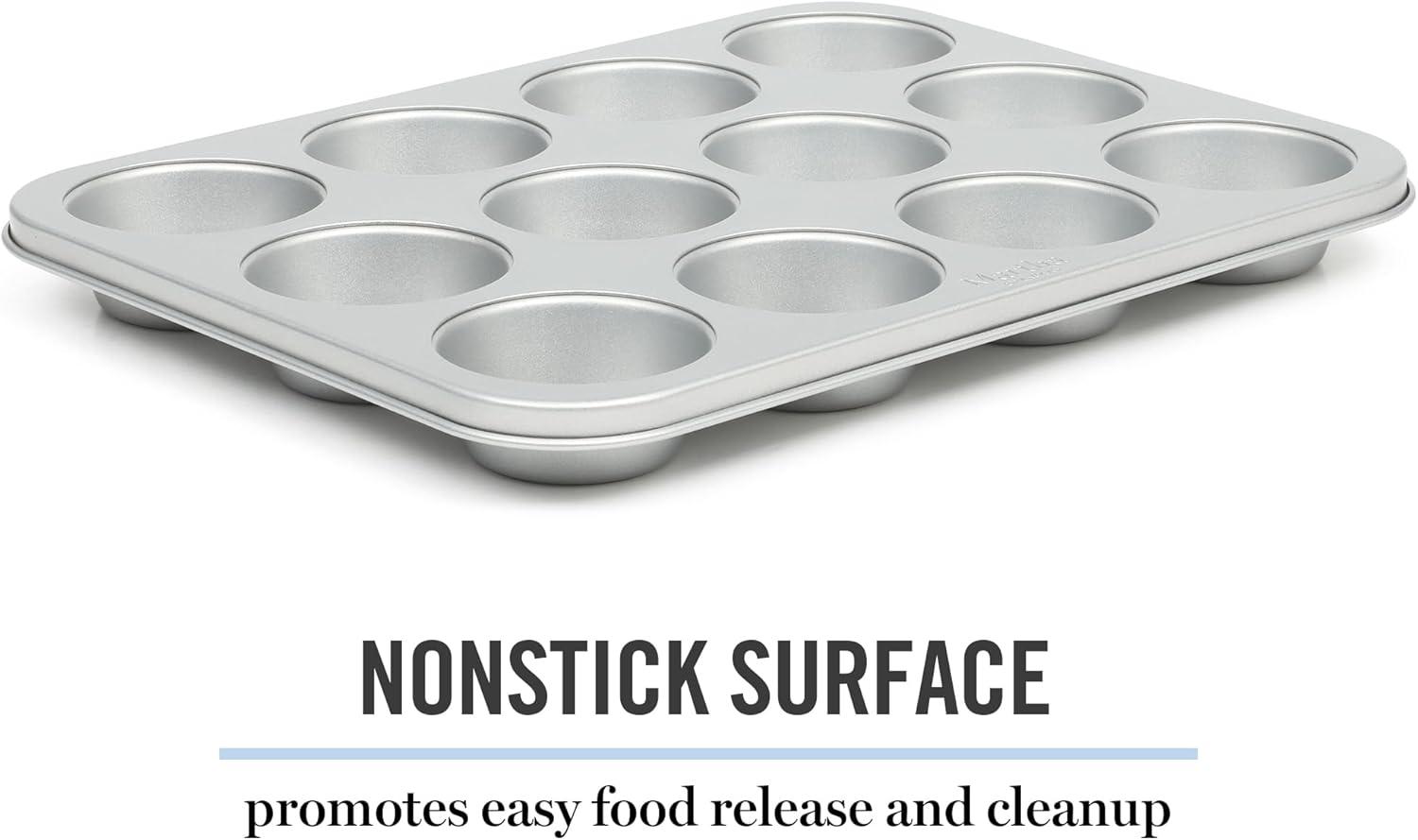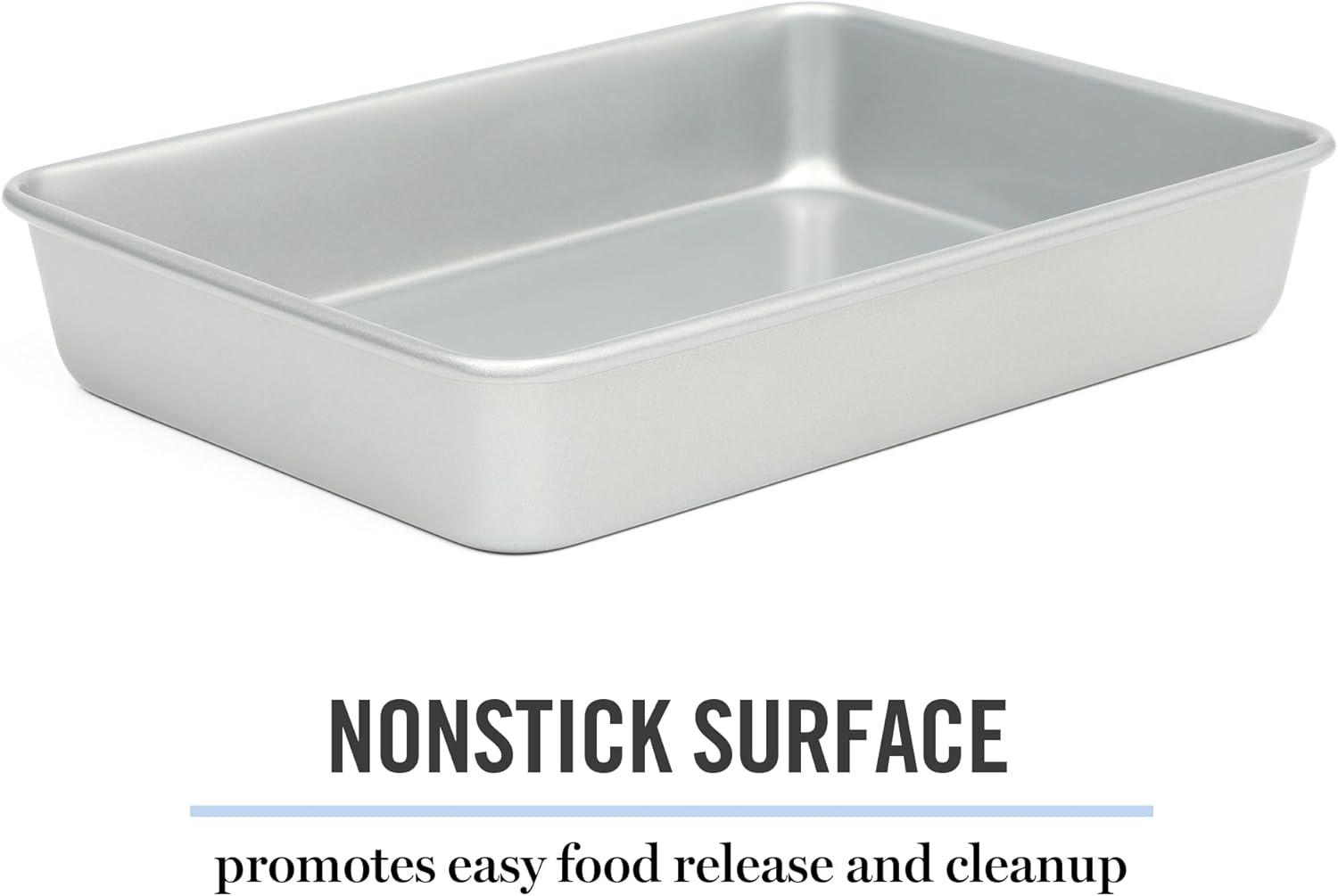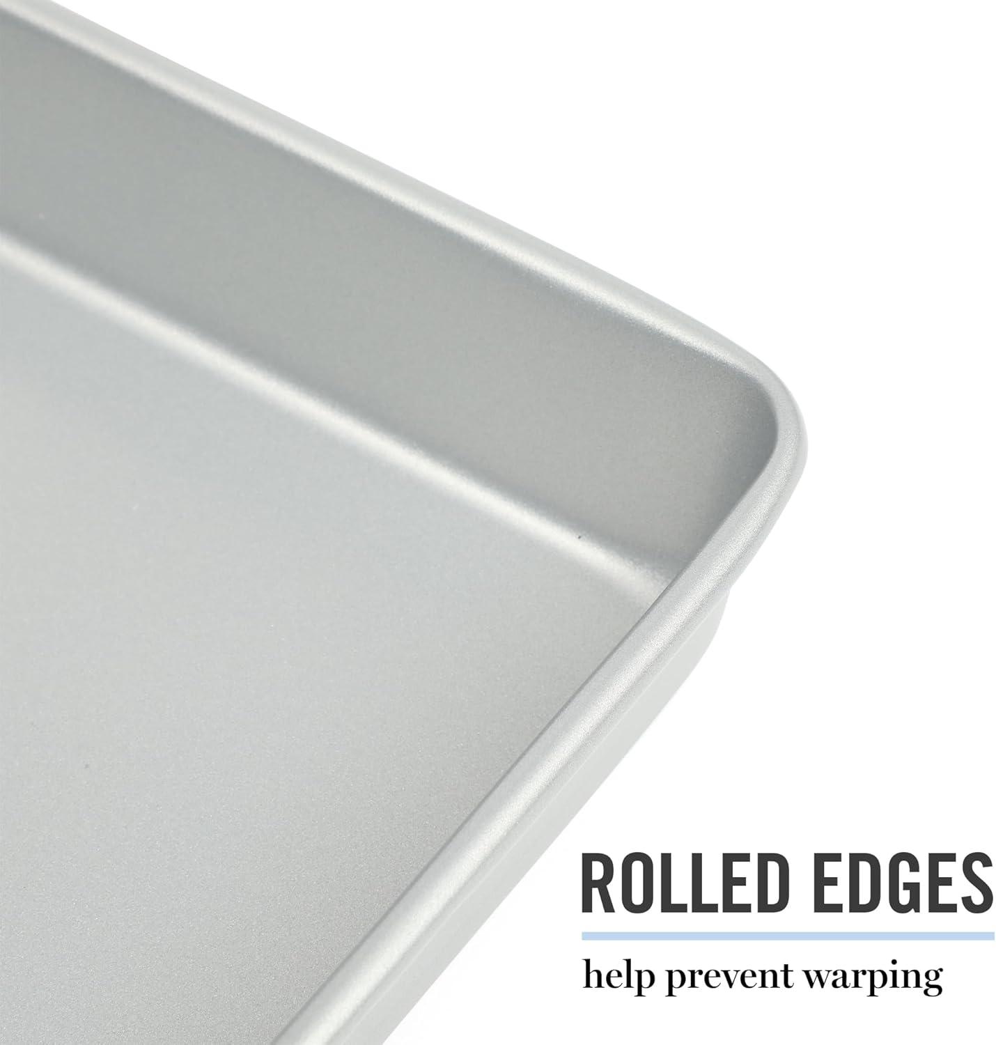 Widely known as both an art and a science, baking blends technical precision and artistic skills to dish out sweet and savory creations with decadent flavors and beautiful presentations. Martha Stewart's Gallen Bakeware Collection gears up home bakers for frequent family visits, five-star reviews and ultimately, multiple rounds of culinary success. As a selection of bakeware essentials, this collection features the core classics to bake, brown, roast, and serve go-to suppers and signature desserts. Each piece offers a nonstick surface that is both easy to grease and convenient to clean. It requires less oil or butter to release baked or roasted goods smoothly. Made from durable carbon steel, it responds to heat quickly to conduct and distribute it for even results. The rolled edges protect the bakeware from warping to maintain its original shape after multiple baking sessions and frequent exposure to high heat. Hand wash only.