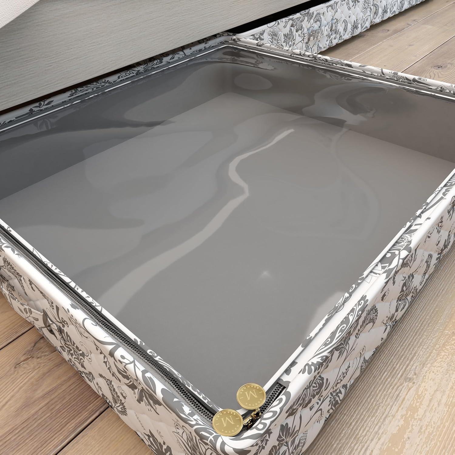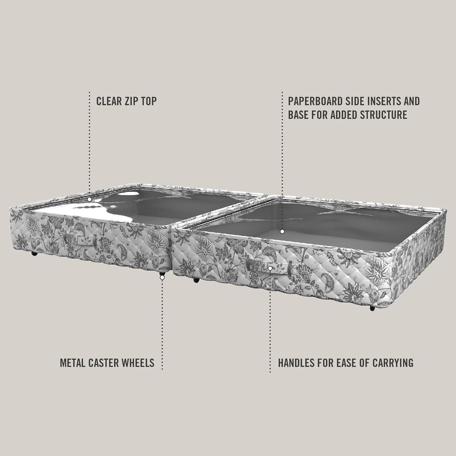 COMPONENTS: The under the bed storage organizer features a sturdy base with removable paperboard inserts for a more structured frame. Self-fabric handles on two sides and four metal caster wheels make it easy to store and move. Features a clear PVC zip top so you can see exactly what you are storing – no guessing games. Comes with two under the bed storage organizers. Stackable to maximize space.
