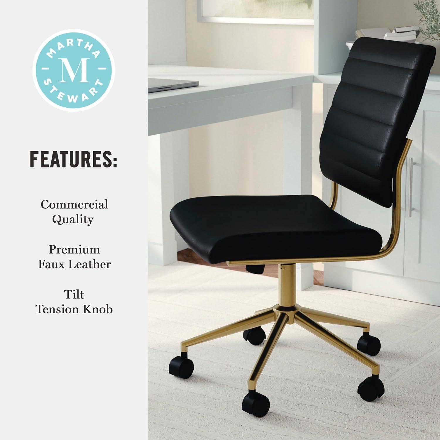 The Martha Stewart Ivy Armless Office Chair pairs traditional design with clean lines to instantly update your work space. This faux leather desk chair features a polished brass frame that adds elevated sophistication to a classic look. A pneumatic height adjustment lever tucked beneath the 360 swivel seat offers a custom seating experience to keep you comfortable throughout your workday. Assembly is easy with the included tools and step-by-step instructions.