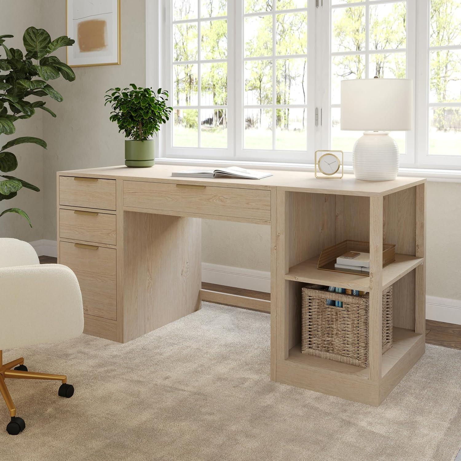 Create a custom home office with the Martha Stewart Kayden Home Office Desk, Shelf, and File Cabinet Set that boasts a pull-out desk drawer, shelf with two tiers of open storage, and file cabinet with two pull-out drawers and large bottom drawer