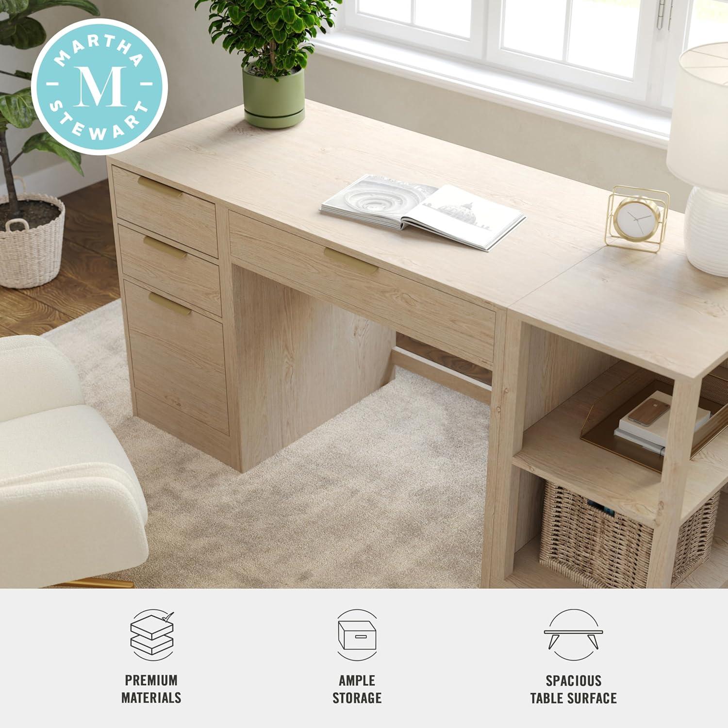 Elevate your home office with the functionality and sophistication of the Martha Stewart Kayden Home Office Desk, Two-Tier Shelf, and File Cabinet. A simple yet stunning design, highlighted by clean lines and complementary hardware, enhances any creative headquarters with eye-catching charm. A center pull-out desk drawer, the shelfs two tiers of open storage, and the file cabinets two pull-out drawers and larger bottom drawer that is customizable to hold either letter-size or legal-size hanging folders provide ample space to effortlessly keep your work surface clean and organized. Part of our modular collection, this three-piece set can be used alone or further enhanced with additional pieces to craft a custom arrangement that fits any workspace's needs. The drawer glides are pre-assembled to save time during assembly, which is made easy with the included step-by-step instructions and cleanup is easily accomplished with a damp cloth.