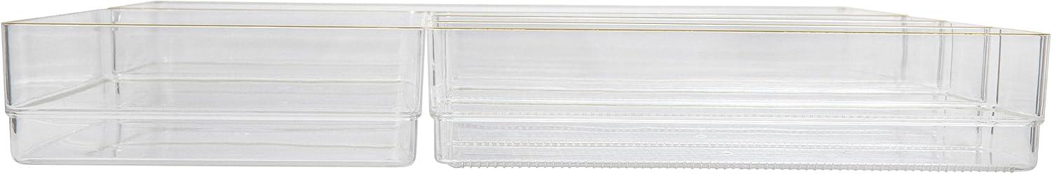 Thoughtful, functional storage is at your fingertips with this variety Set of 8 Martha Stewart Kerry Stackable Organizers. Clear, BPA-free plastic bins are elevated by beautiful gold trim and can be configured on demand for a custom fit in a drawer or on top of your work surface. Recessed bottoms allow the components to slide from side to side for quick access and stack vertically making them an ideal storage solution for small spaces. Non-slip feet ensure these organizer trays stay where you put them and the sophisticated, versatile design multitasks in countless other living spaces requiring tidy, clutter-free surfaces.