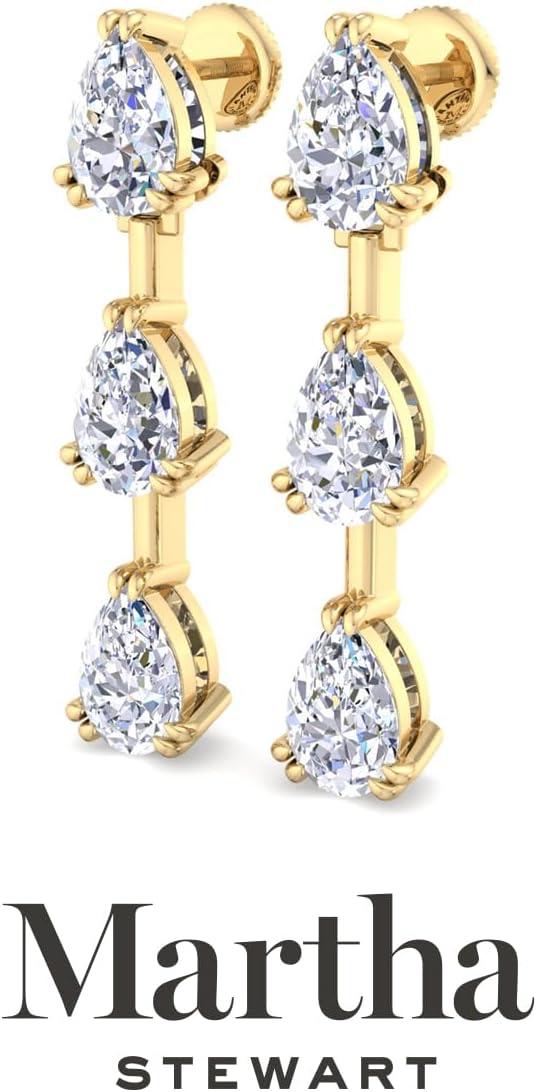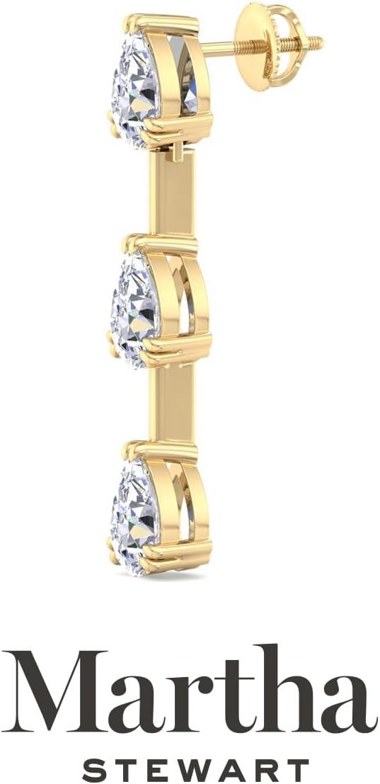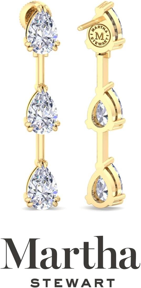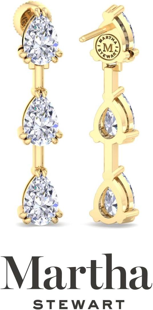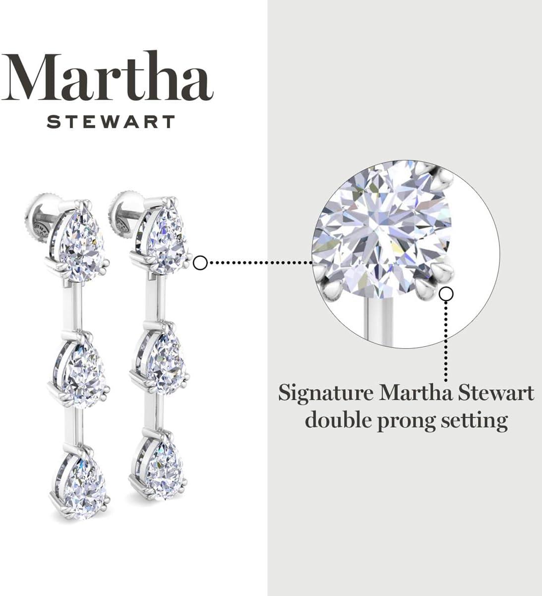 Showcasing class, style and timeless sophistication, the Martha Stewart fine jewelry collection is here to be celebrated. These Martha Stewart lab grown diamond earrings feature six pear shape lab grown diamonds in G-H color, VS clarity. Total carat weight is 3 or 5 carats. These earrings are available in 14 karat white and yellow gold and have post with friction backs. These earrings are set in the signature Martha Stewart double-prong setting and dangle down over 1 1/2 inches! Whether worn for a special event or to enhance everyday elegance, these earrings are sure to become cherished heirlooms. Martha Stewart’s attention to detail and dedication to quality shine through in every piece, making this collection a celebration of refined craftsmanship and timeless beauty.