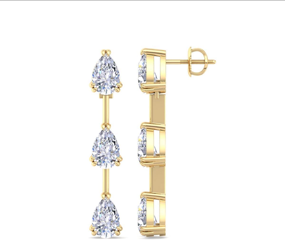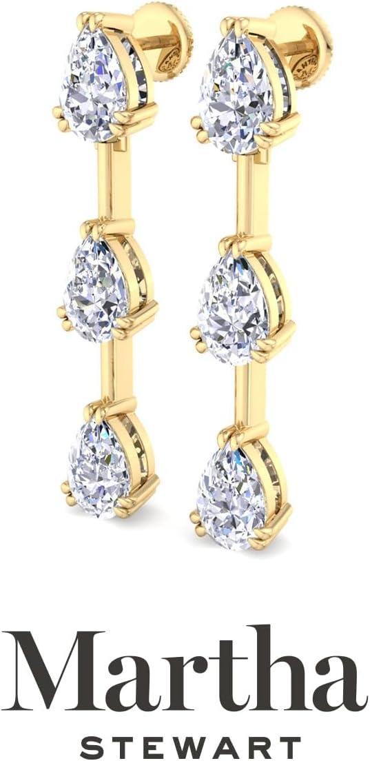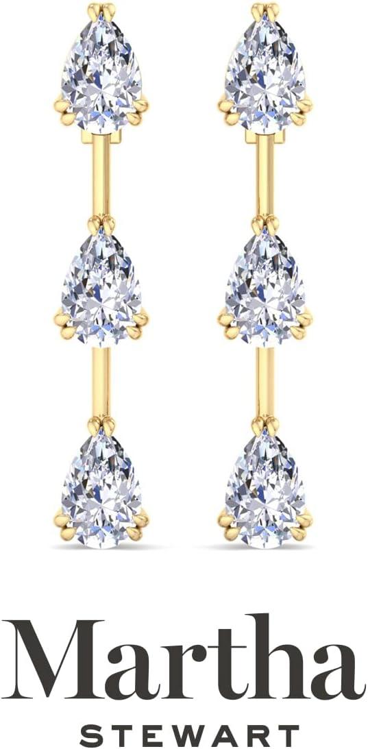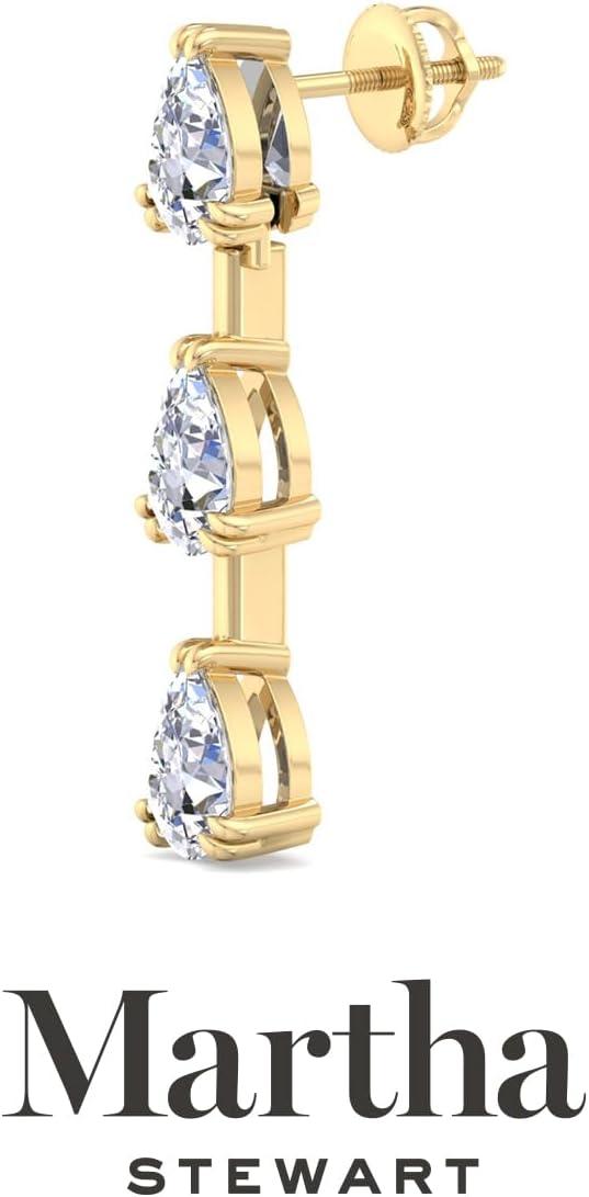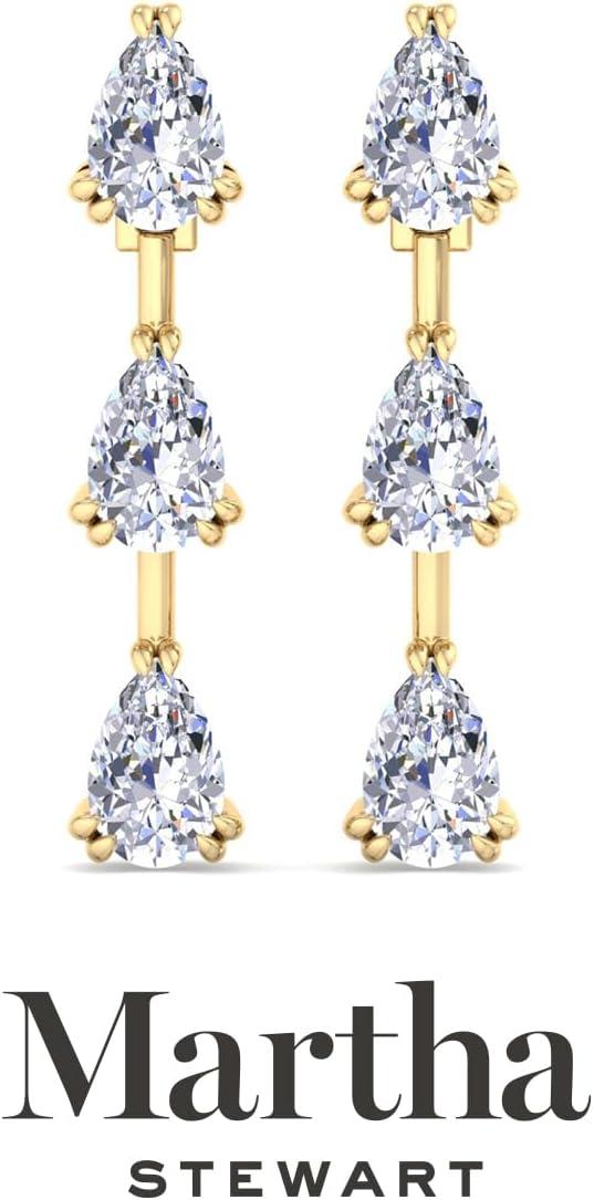 Showcasing class, style and timeless sophistication, the Martha Stewart fine jewelry collection is here to be celebrated. These Martha Stewart lab grown diamond earrings feature six pear shape lab grown diamonds in G-H color, VS clarity. Total carat weight is 3 or 5 carats. These earrings are available in 14 karat white and yellow gold and have post with friction backs. These earrings are set in the signature Martha Stewart double-prong setting and dangle down over 1 1/2 inches! Whether worn for a special event or to enhance everyday elegance, these earrings are sure to become cherished heirlooms. Martha Stewart’s attention to detail and dedication to quality shine through in every piece, making this collection a celebration of refined craftsmanship and timeless beauty.