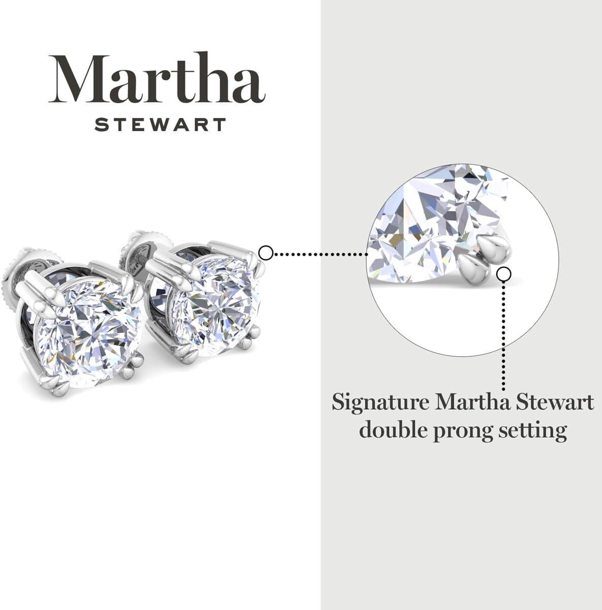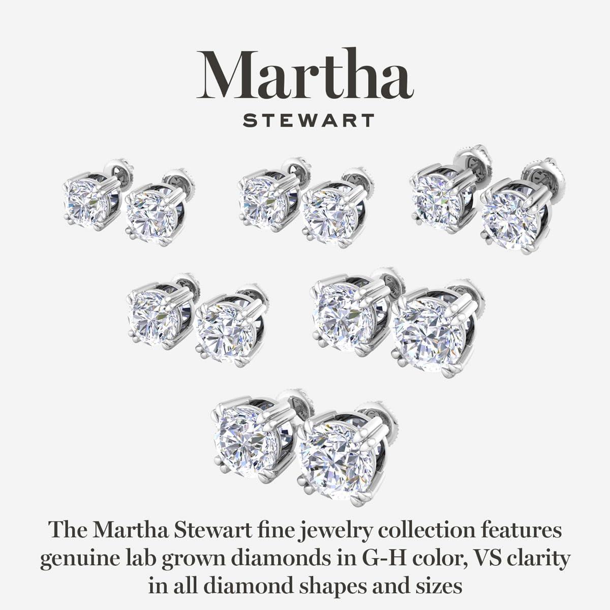 Showcasing class, style and timeless sophistication, the Martha Stewart fine jewelry collection is here to be celebrated. These Martha Stewart lab grown diamond earrings feature two lab grown diamonds in G-H color, VS clarity. Total carat weight offered is 2, 3, 4, 5, 8 and 10 carat total weight. These earrings are in 14 karat white or yellow gold and are in a basket setting with screwbacks. These earrings are set in the signature Martha Stewart double-prong setting. Whether worn for a special event or to enhance everyday elegance, these earrings are sure to become cherished heirlooms. Martha Stewart’s attention to detail and dedication to quality shine through in every piece, making this collection a celebration of refined craftsmanship and timeless beauty.