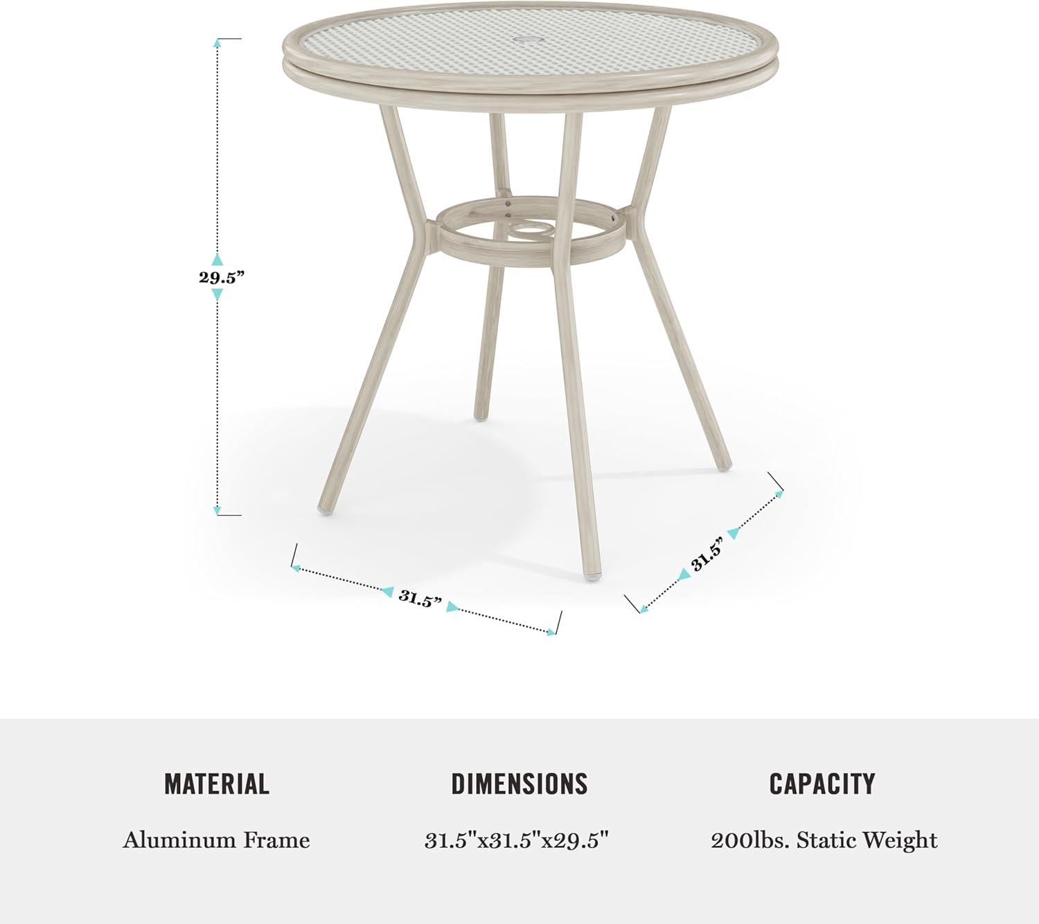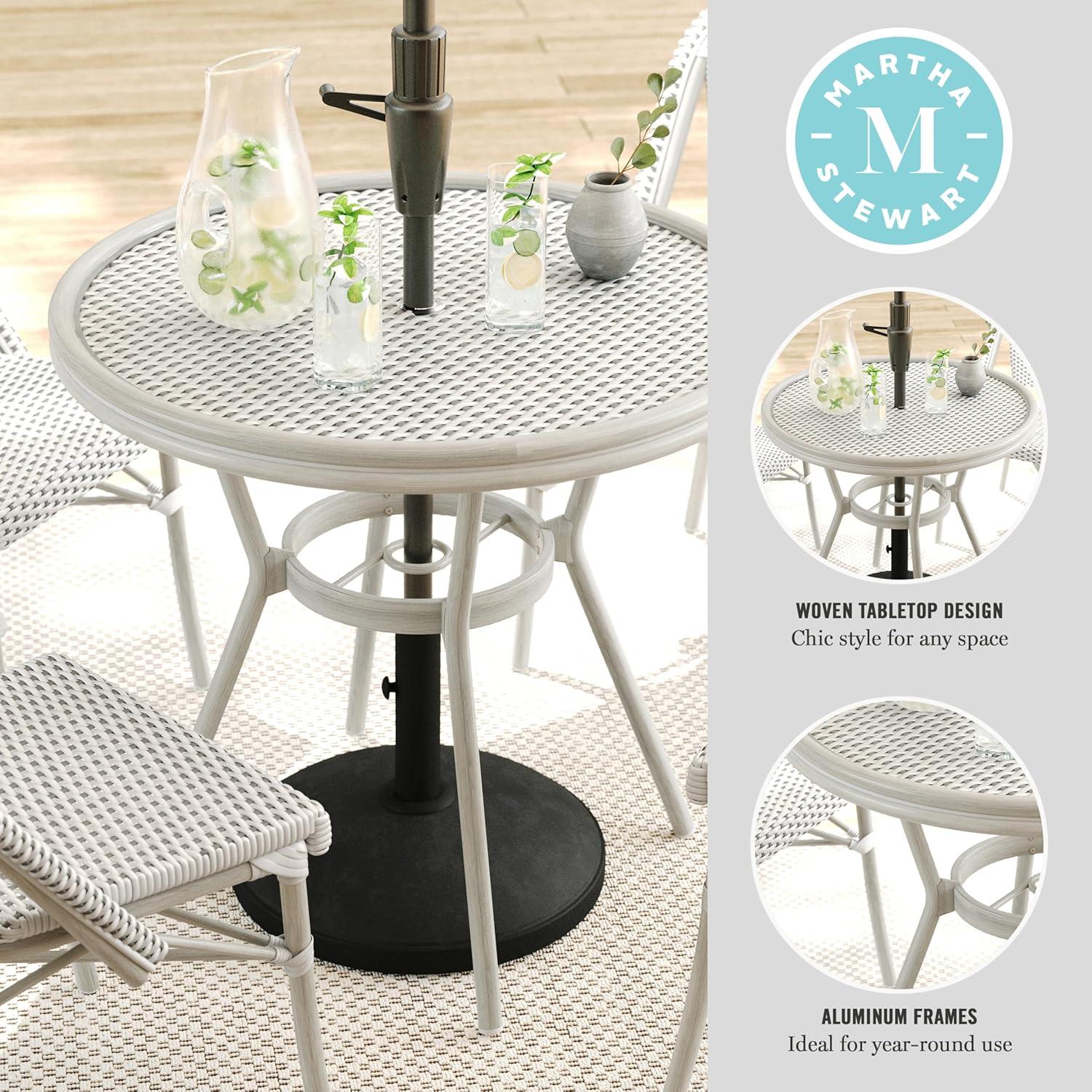 Upgrade your homes indoor-outdoor retreat with the refreshing style of this Martha Stewart Lily Pond Bistro Dining Table for two. An elegant, hand-brushed, woodgrain finish is complemented by a tabletop with a chic, woven rattan pattern and a tempered glass top. The all-weather construction grants durability and peace of mind, while an umbrella hole with a removable cap makes it easy to realize your alfresco design dream with your favorite patio umbrella (umbrella not included). Part of our Lily Pond collection, this piece pairs wonderfully with the coordinating dining chairs, counter stools, and barstools, crafting a custom collection that fits your entertaining needs. Setup is simple with tools included and step-by-step instructions. This piece requires only minimal, hassle-free maintenance, making this eye-catching bistro dining table a seamless addition to any indoor-outdoor space for everyday use and special occasions.