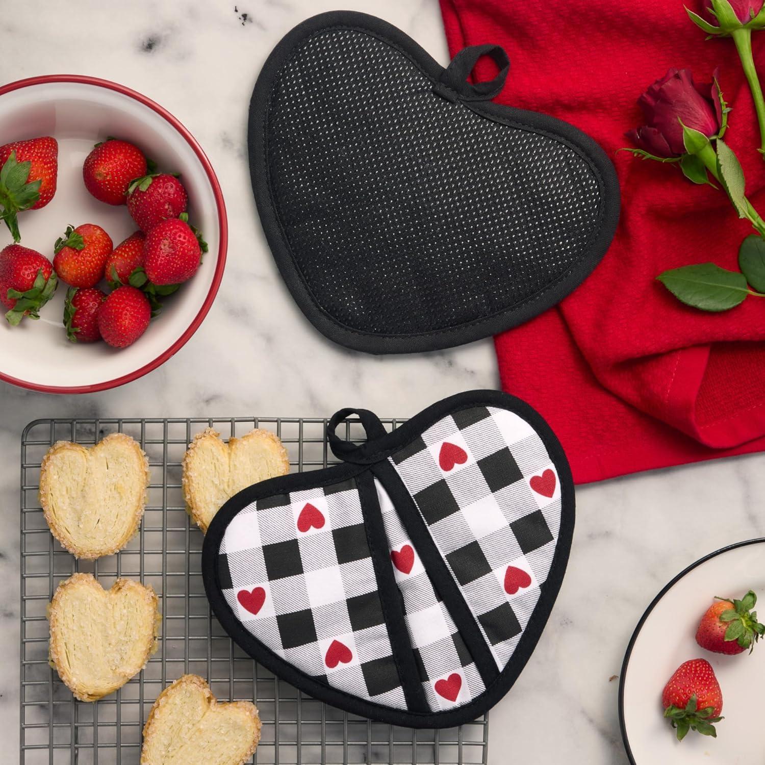 Add a charming dose of love to your kitchen with the Martha Stewart Love Check Gingham Hearts Kitchen Collection. Whether it’s during the season of love or everyday use, this sweet kitchen décor will enhance your home décor and welcome guests with love. The Martha Stewart Love Check Gingham Heart Shaped Pot Holder Set includes two pot holders with a lovely gingham plaid and hearts design. This heat resistant potholder set is ideal for everyday use in the kitchen and while handling hot pots and pans. A printed silicone palm allows for a strong and secure grip on cookware and flexible use as a pot holder, grabber, or decorative trivet while hosting. Complete with hand loops for storing or display, these heart-shaped pot holders are a sweet décor choice for your kitchen – especially during the season of love and Valentine’s Day.