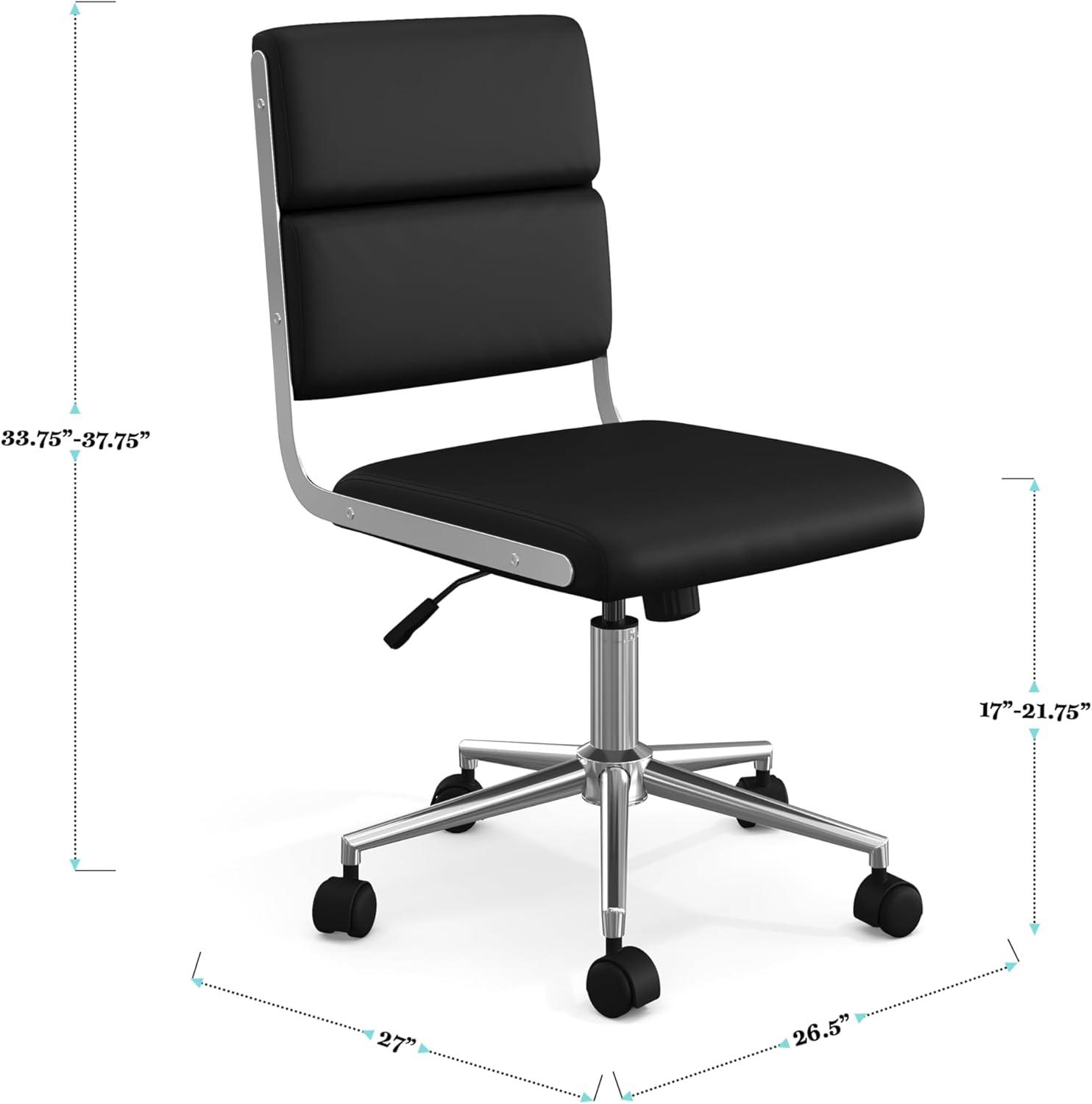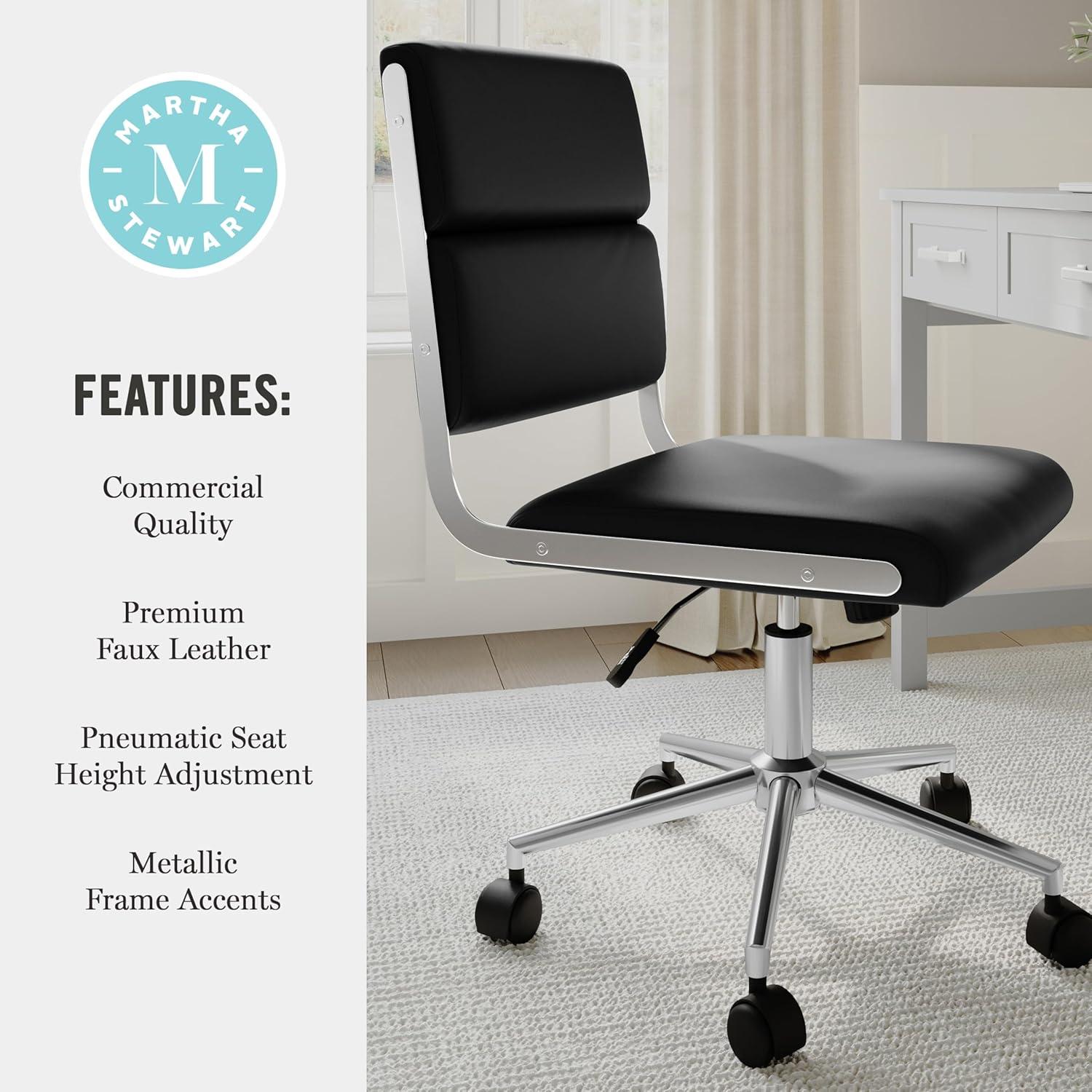 Bring a modern aesthetic to your homes corporate nook with the Martha Stewart Lulu Office Chair. The sleek, armless design adds a chic touch to any home workspace and fits perfectly with most desks, streamlining your layout and keeping your space tidy and neat. A gorgeous faux leather upholstery adorns the back and seat, complemented by metallic side accents and frame with a polished brass finish to deliver an understated charm. Take on every workday in comfort with the seats tilt functionality and pneumatic, multi-position, height-adjust lift that help you find just the right position. Plus, the 360 swivel seat and dual wheel casters allow you to move around your home command center hassle-free. Assembly is easy with the included tools and step-by-step instructions and keeping your chair looking pristine is easy by wiping clean with a dry cloth.