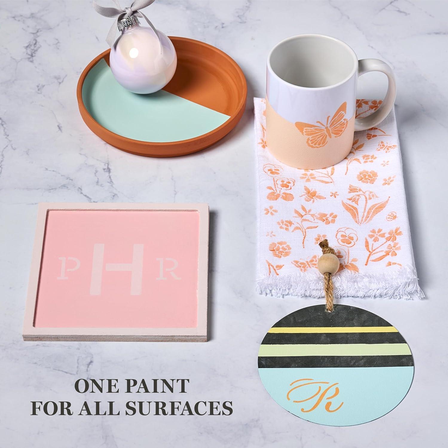 Featuring rich, highly pigmented satin colors, the Martha Stewart 12-piece Multi-Surface Satin Paint Set allows you to create beautiful, professional-quality projects just like Martha. Each captivating color boasts exceptional coverage, with a smooth, creamy texture that ensures long-lasting durability. Perfect for a range of techniques including sponging, stenciling, and stamping, these paints are easy to apply and work on multiple surfaces. Plus, they are AP-certified and non-toxic, offering the best painting experience. Bring your projects to life with vibrant, on-trend colors and the exceptional quality of Martha Stewart paints. Additional Details: Martha Stewart Satin Paints can be used on glass and ceramics, making them dishwasher-safe on the top rack once cured. To cure, air dry the items for 1 hour then place them in a cool oven. Set the oven to 350 degrees Fahrenheit and bake for 30 minutes. Let them cool in the oven to room temperature and avoid using for 72 hours for best results. To cure Satin paint for machine washing, heat set painted fabric with an iron on cotton setting, no steam.