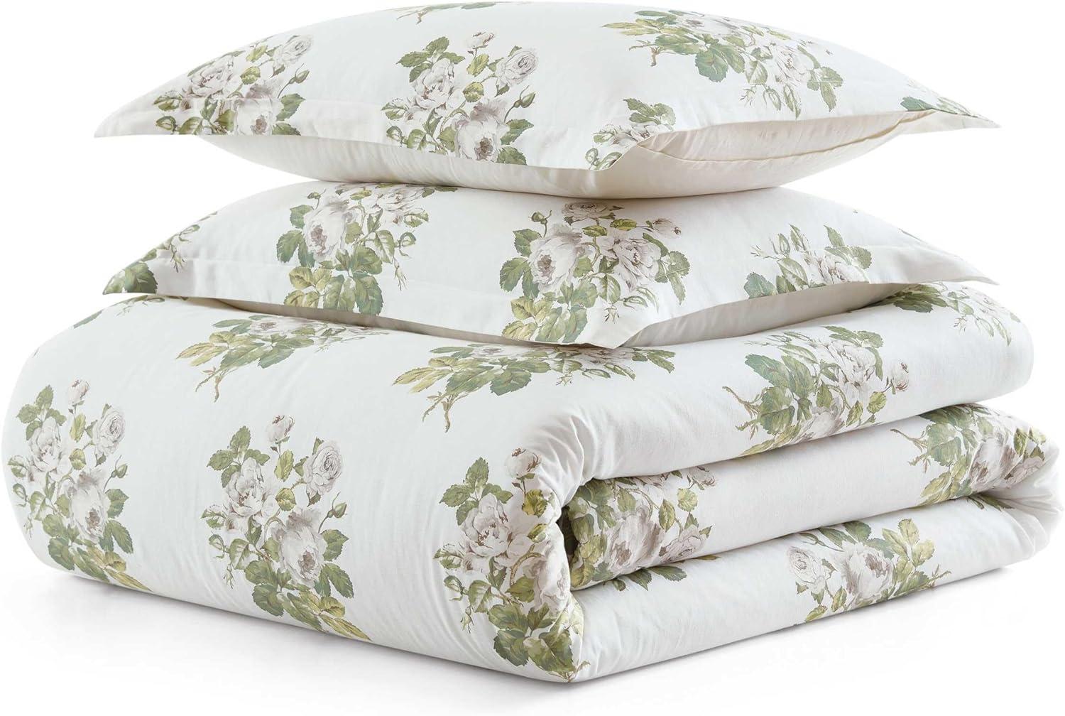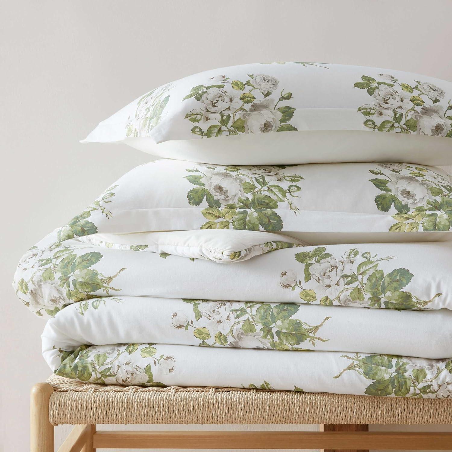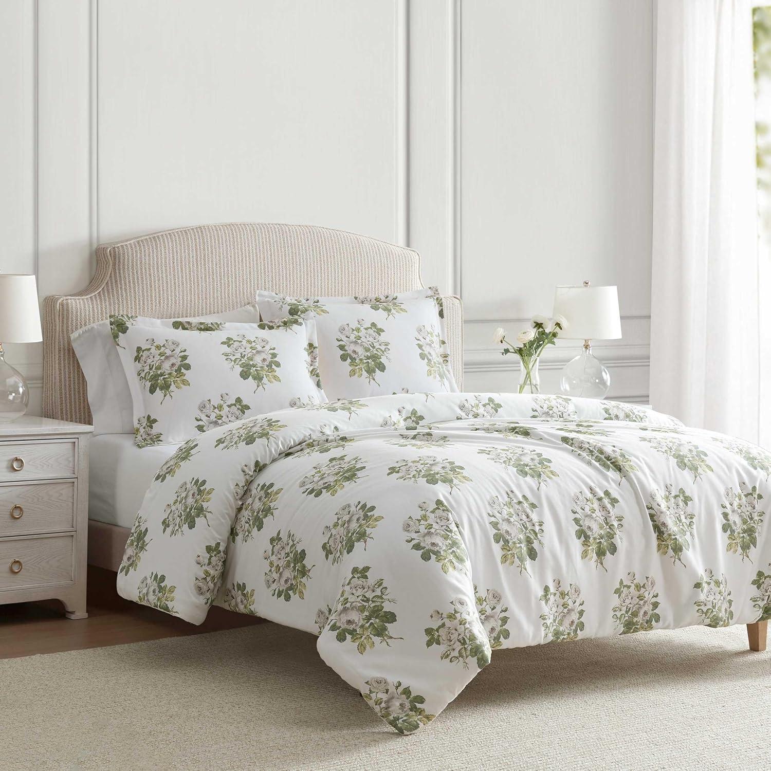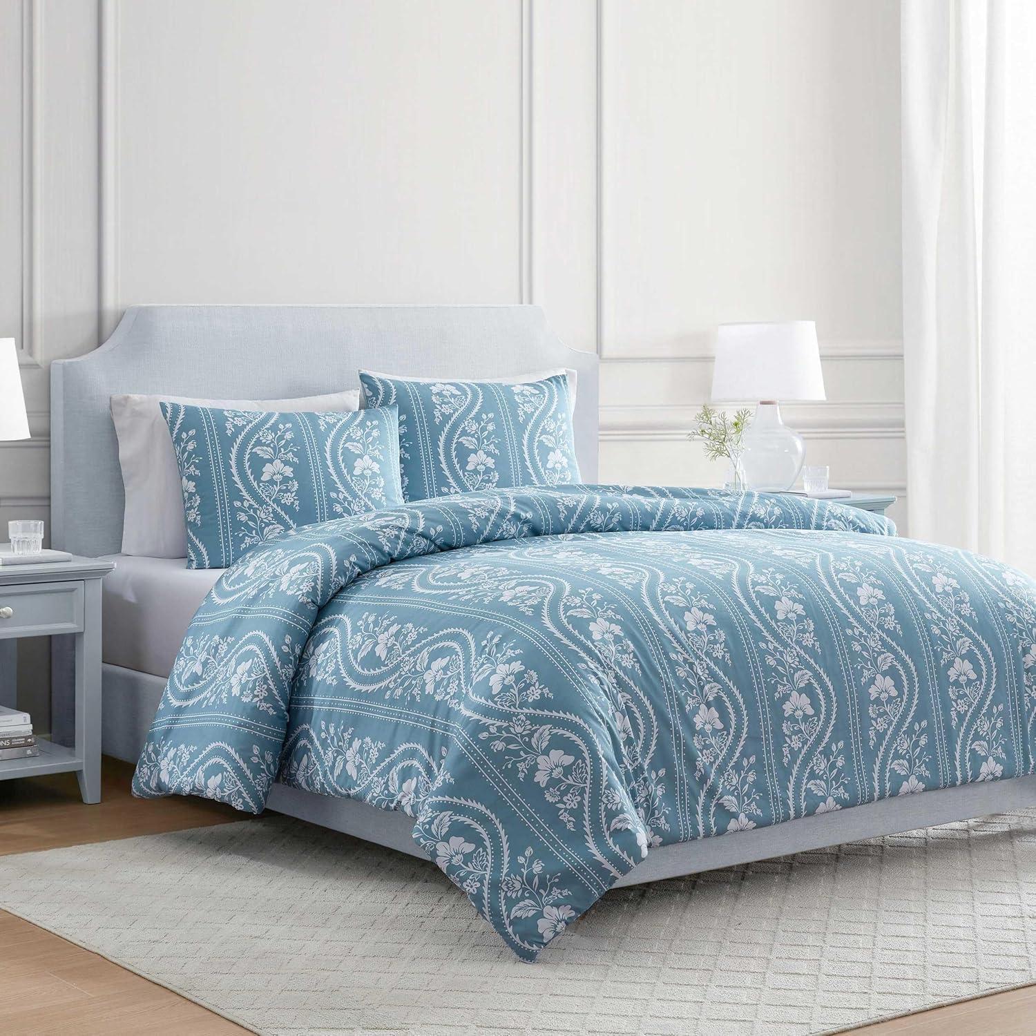 Martha Stewart - Queen Duvet Cover Set, Smooth Sateen Front with Subtle Sheen & Lightweight Cotton Percale Reverse, 3 Piece Bed Set with Matching Pillowcases (Sophia Stripe Blue)(Elosie Floral Grey)